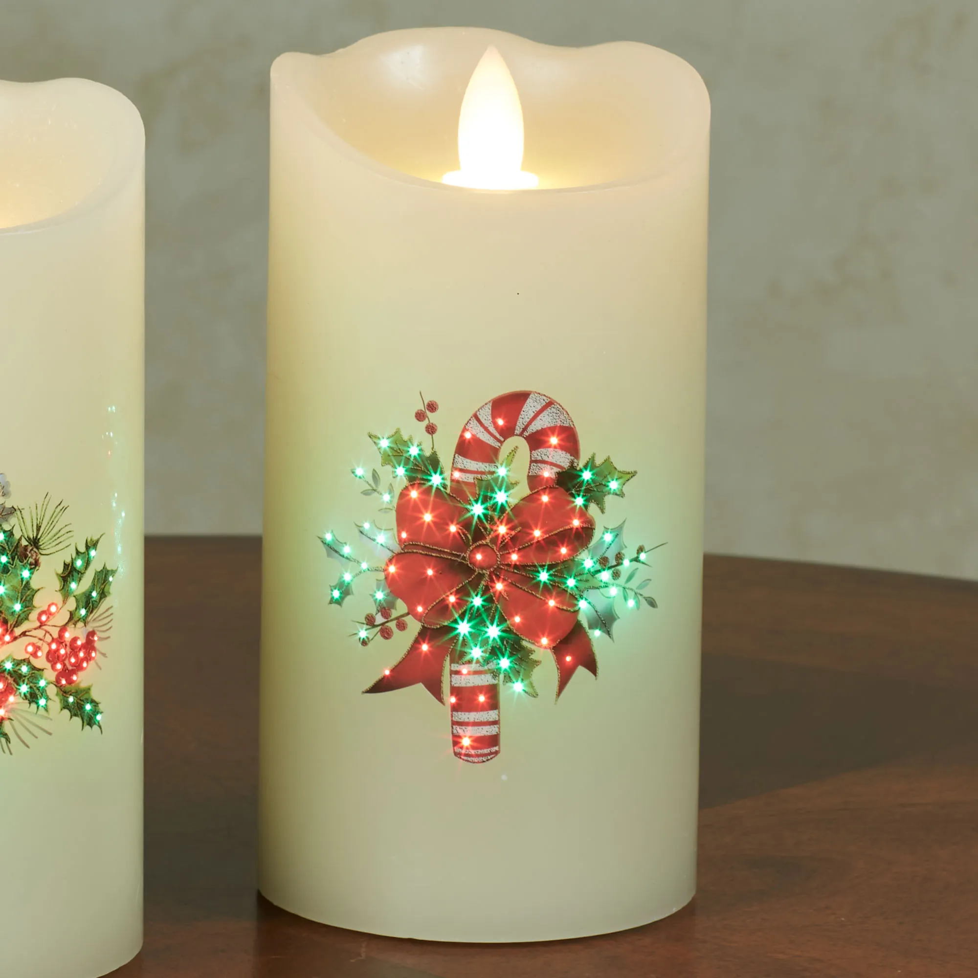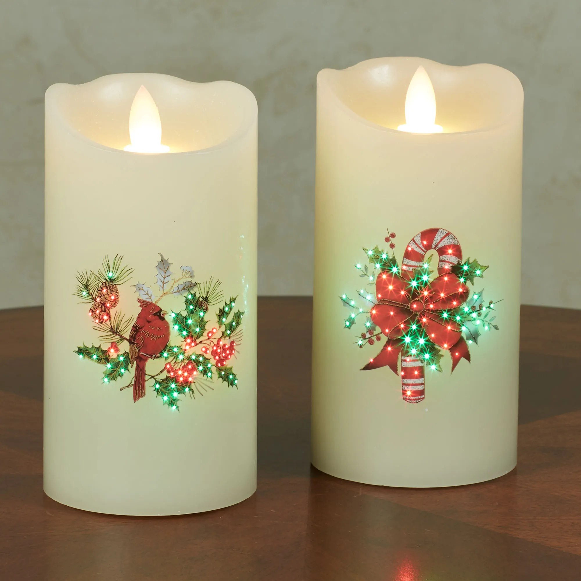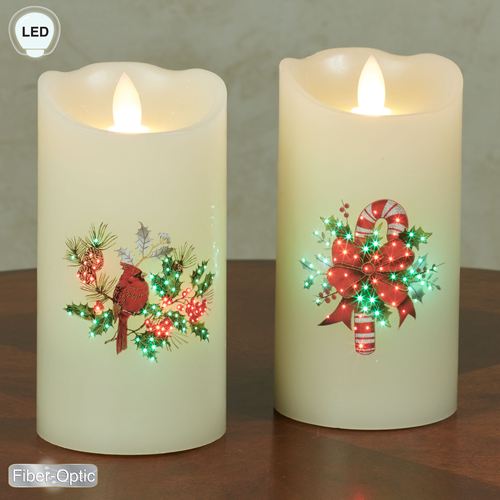 Decorate with the festive flair of the Holiday Fiber Optic Flameless Candle. The ivory wax candle, by Kurt S. Adler, has twinkling red and green fiber optic lights and an LED flickering flame. Candle features a cardinal or candy cane among holly branches and red berries. Each requires three of your AA batteries and operates from the on/off/six-hour timer switch. Candles are sold individually; each measures 3"dia.x6"H.