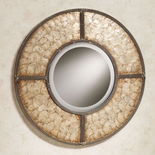 The Capiz Shell Round Wall Mirror accents your home with an Asian influence. This metal wall mirror has a gold capiz shell overlay, twist accents, a gold finish, and a 13.5" dia., central beveled mirror. Overall, measures 28" dia.; weighs 10 lbs.