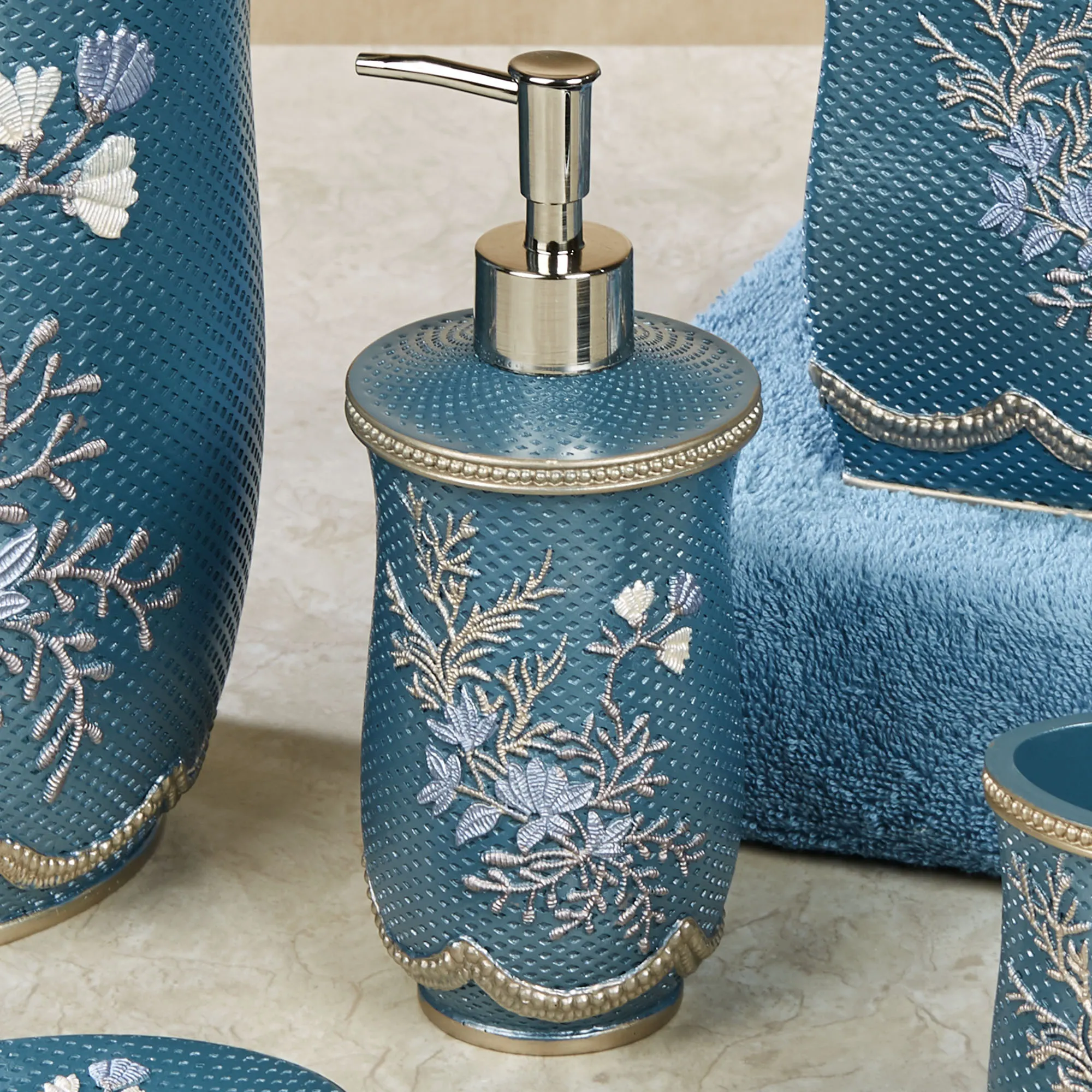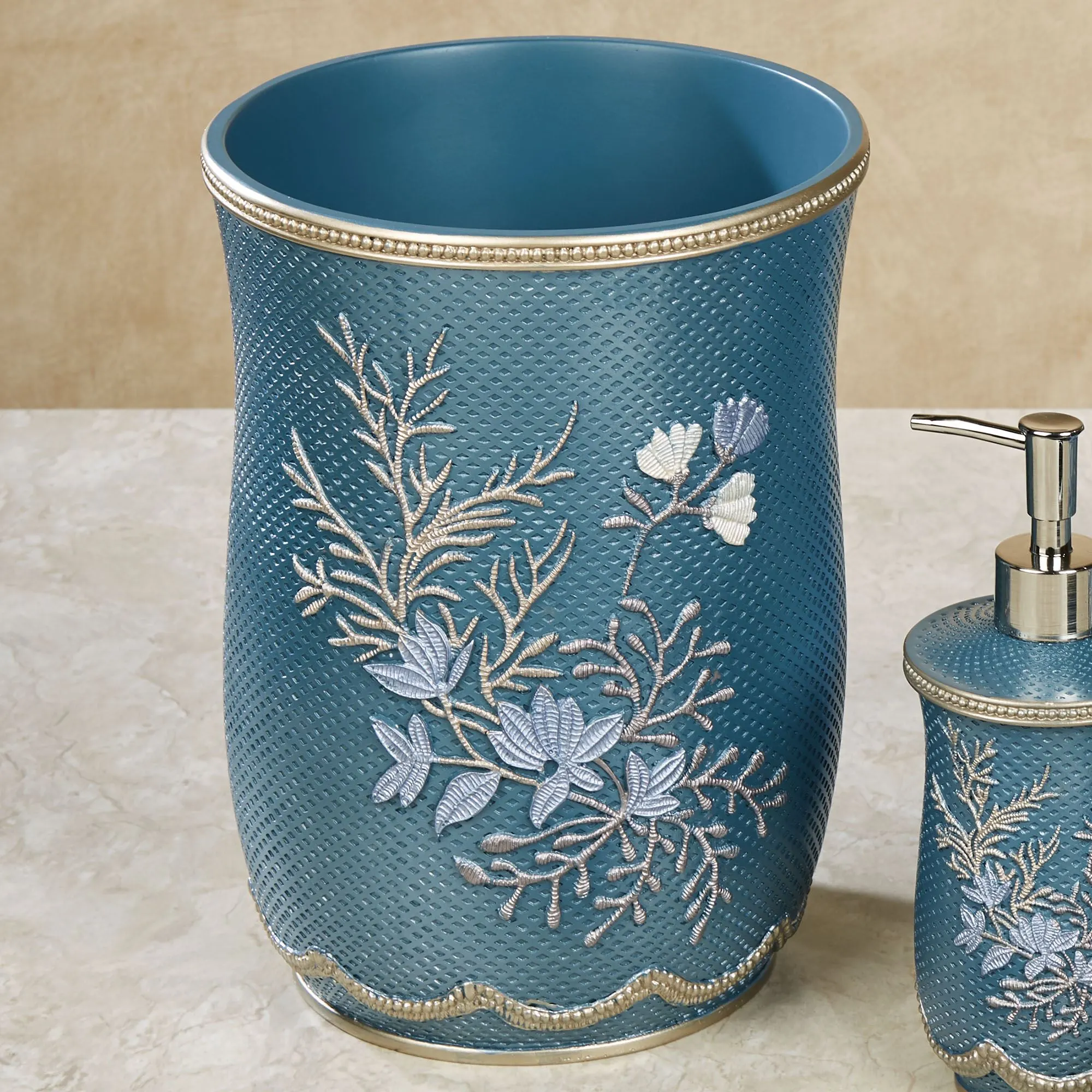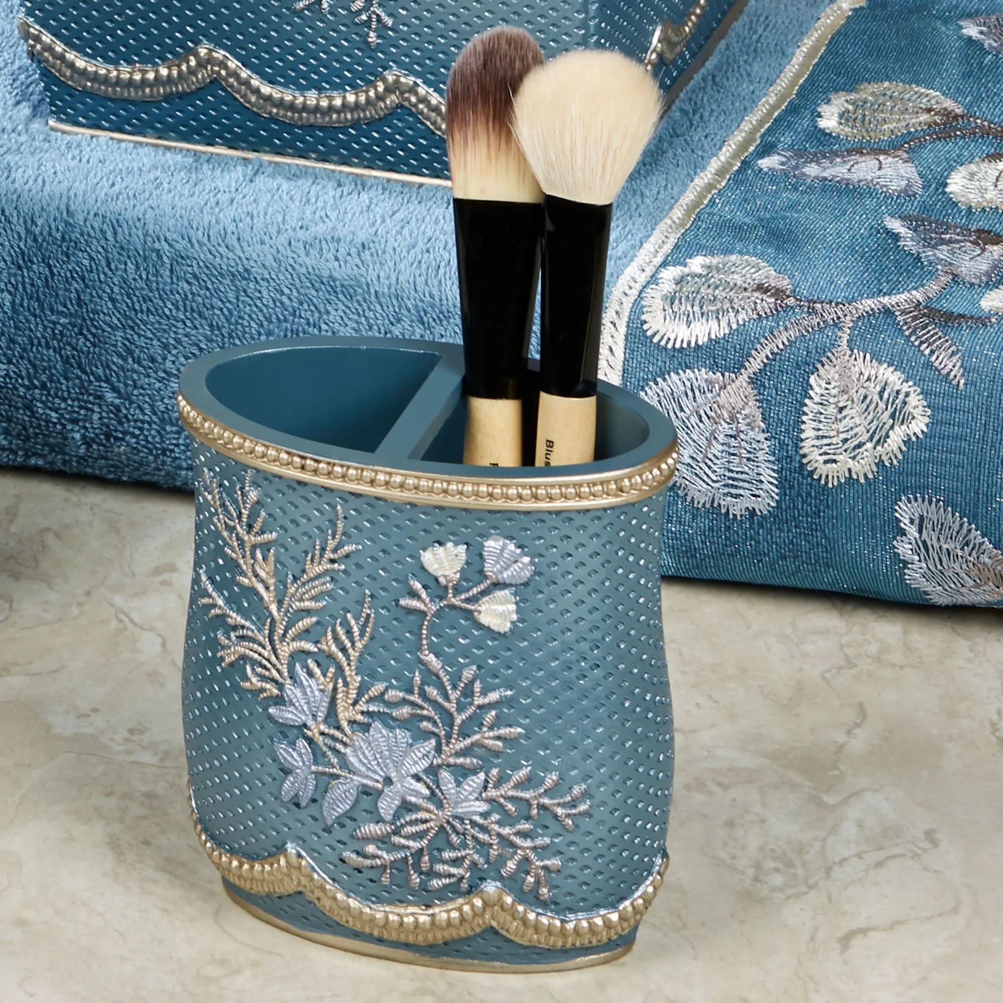 Floral designs bloom with sweet elegance on the Capri II Bath Accessories. Made of resin, these textured accessories have handpainted designs and raised trim. Colors include shades of blue, ivory, satin gold, and taupe. Brush Holder can be used to hold toothbrushes or makeup brushes. Specify Wastebasket, Tissue Cover, Lotion/Soap Dispenser, Brush Holder, or Soap Dish.