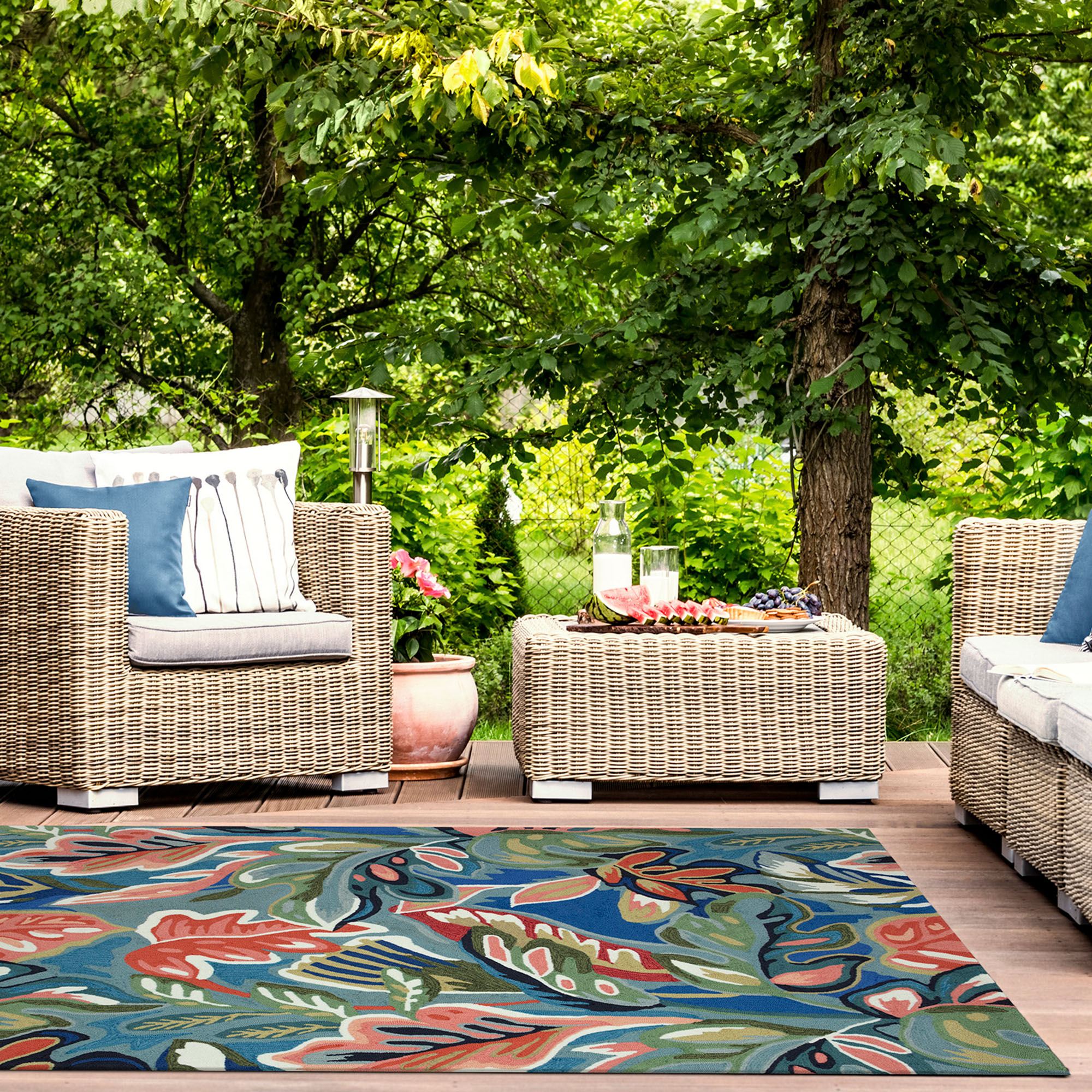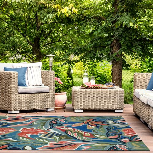 The Capri On Holiday Tropical Rug transports your indoor or outdoor space to an exotic locale. The .375" thick, hand-tufted polyester/acrylic-blend rug features an easy-care, weather-resistant design filled with UV-stabilized hues treated to resist fading. Navy, glacier, salmon, coral, pale green, and sage shades fill the tropical palm leaves across a solid color background. Backing is cloth-covered latex. Outdoor seasonal use; do not expose this rug to freezing temperatures. Spot clean and rinse with a garden hose; for stubborn stains, we recommend professional cleaning by a rug cleaner. Imported.