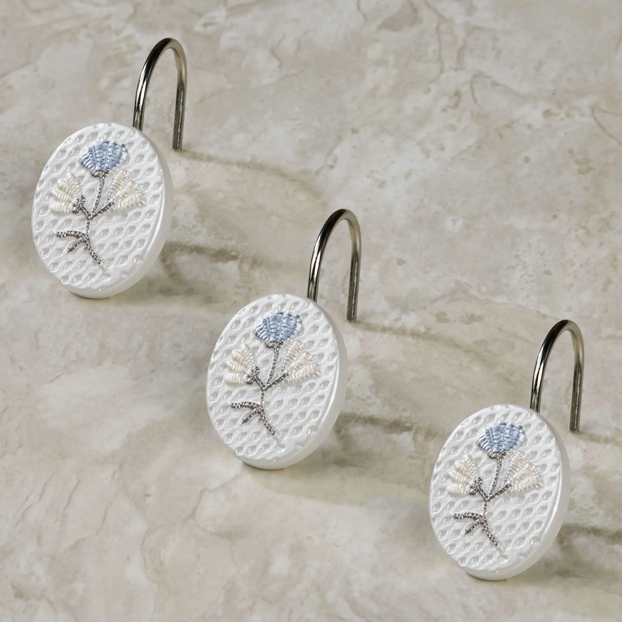 Floral designs bloom sweetly on the Capri Shower Accessories. The polyester Shower Curtain has floral embroidery in shades of blue, ivory, satin gold, and taupe on a sheer ivory background. The attached valance has scalloped embroidery. Measures 70"Wx72"L. Machine washable. Imported. We recommend the use of a waterproof shower curtain liner. Shower Hooks are sold separately in a 12-piece set. The oval resin shower hooks have raised handpainted florals in shades of blue, ivory, and taupe on a platinum textured background. Each is 1.5"Wx2"Dx1.5"H.