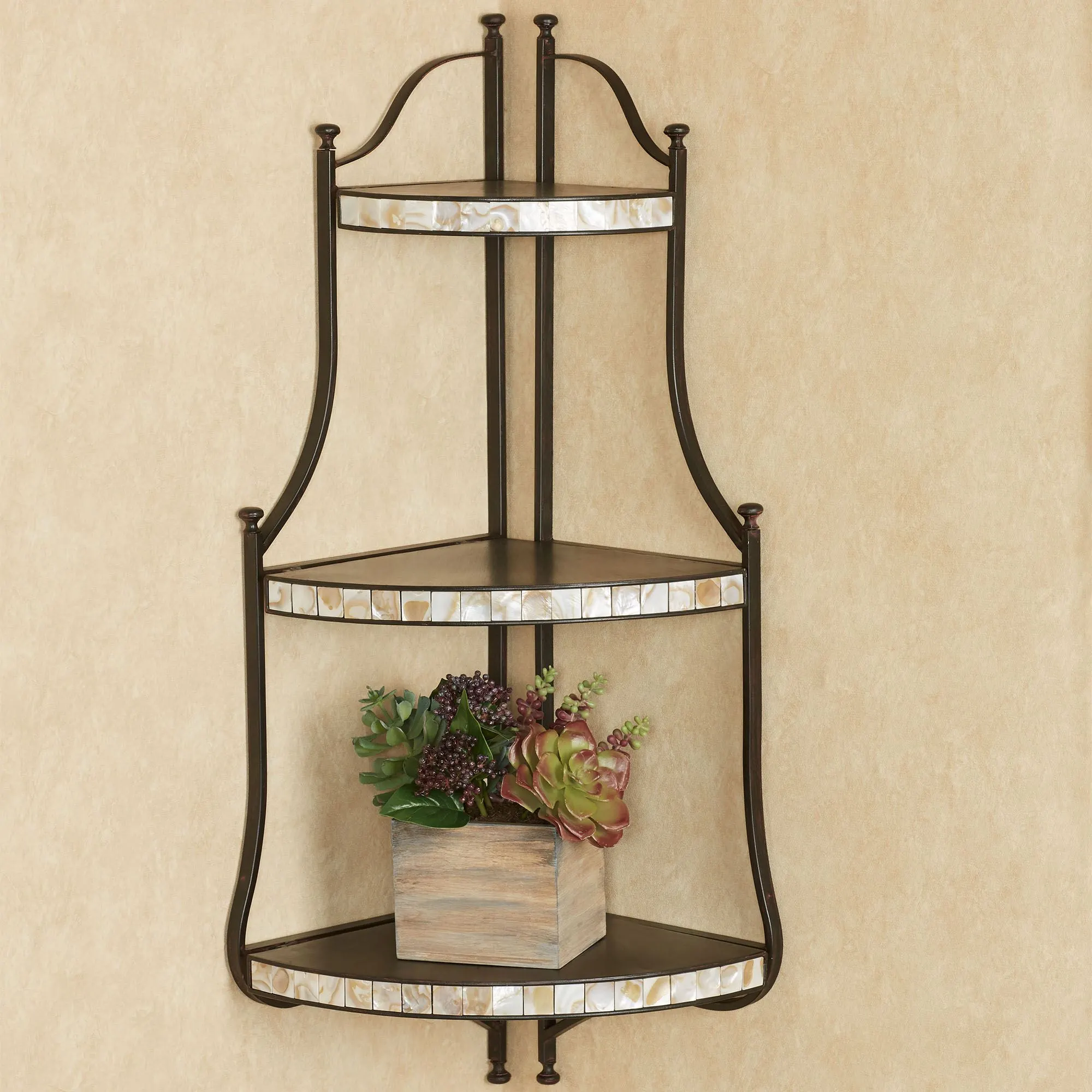 Refined with a sleek look, the Caprissa Corner Wall Shelf is enchantingly modern. Crafted of metal with a rustic, brushed black finish and red undertones, this corner wall shelf features ivory and beige capiz shell accents and three shelves. Top shelf is 9"Wx7"D; middle shelf is 13"Wx9"D; bottom shelf is 14"Wx10"D. The space between each shelf is approx. 9". Overall, wall corner shelf is 15"Wx11"Dx31"H.