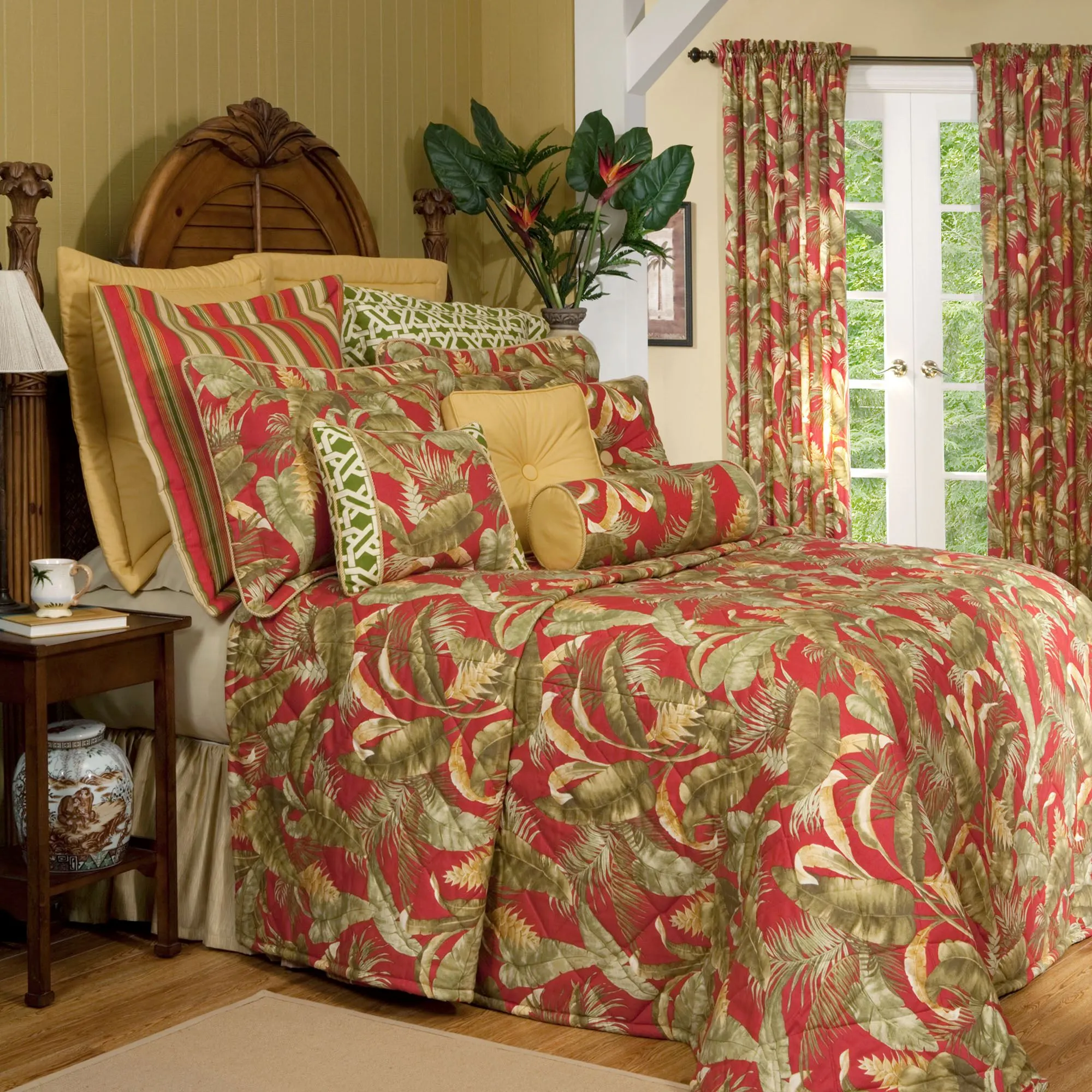 Just off the coast in the Gulf of Mexico, Captiva Island rests among calm waters, filled with a lush canopy and overflowing fronds that seclude you in a true tropical retreat. Dream of this private getaway nightly as you rest beneath this exotic-inspired bedding. Proudly made in the USA, the bedding ensemble combines peridot, loden, fern, olive, dark green, pale green, light cream, pale tan, light brown, brown, goldenrod, and dark red shades in lush greenery, geometric latticework, and fun striped patterns to effortlessly whisk you away to paradise.