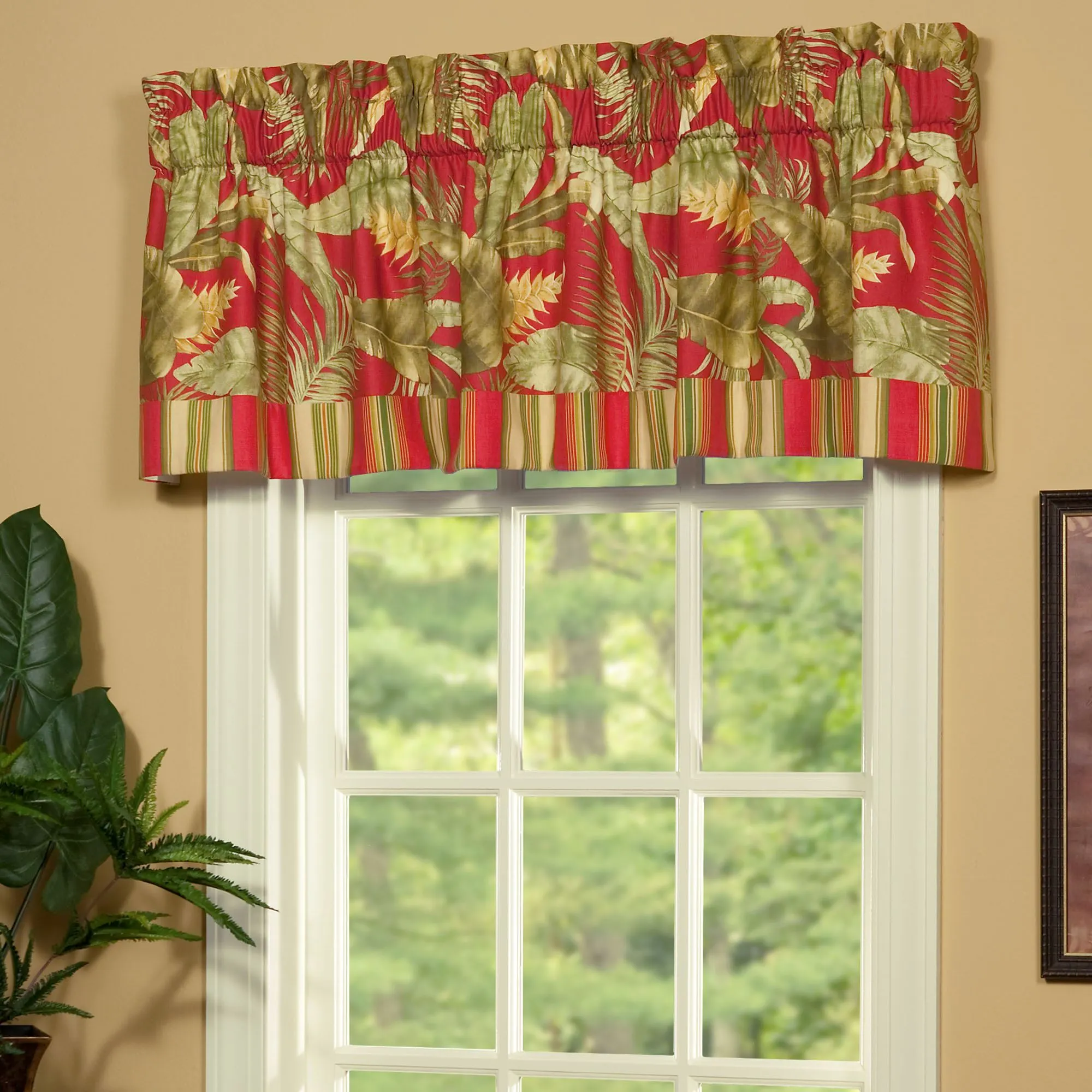 Lined Window Treatments have tropical leaves and 3" rod pockets. Wide Curtains are tailored. Tailored Valance has a striped bottom band. Tie-Up Valance has a striped bottom and two attached striped ties.