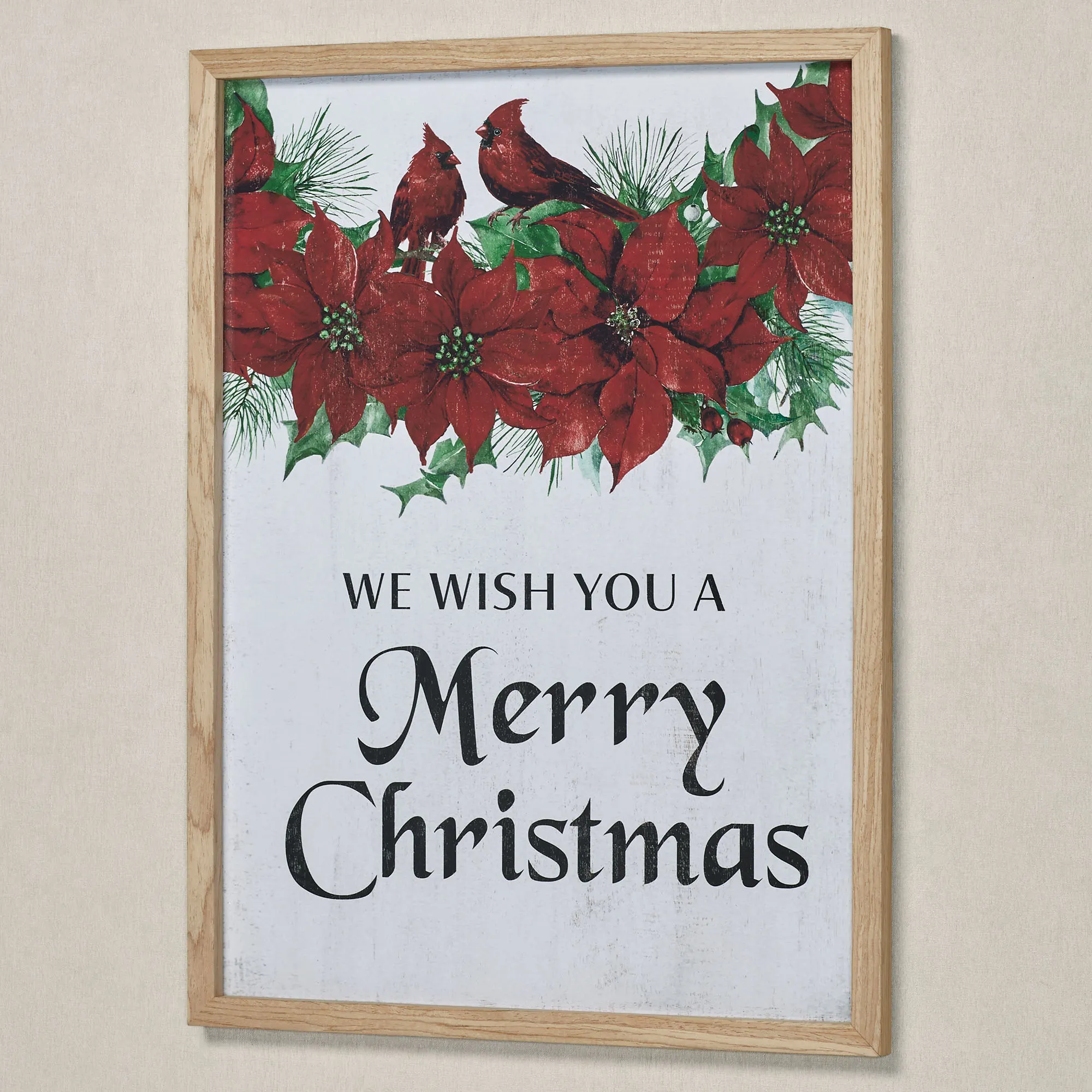 The Cardinal and Poinsettia Merry Christmas Wall Art greets everyone with a cheerful holiday sentiment. This wooden wall art has a weathered, printed design featuring poinsettia flowers, pine sprigs, holly leaves, and red berries along with two perched cardinal birds on white. The phrase in black reads "We Wish You A Merry Christmas." The outer frame is natural pine wood, and a glass insert protects the art. Measures 18"Wx1"Dx24"H.
