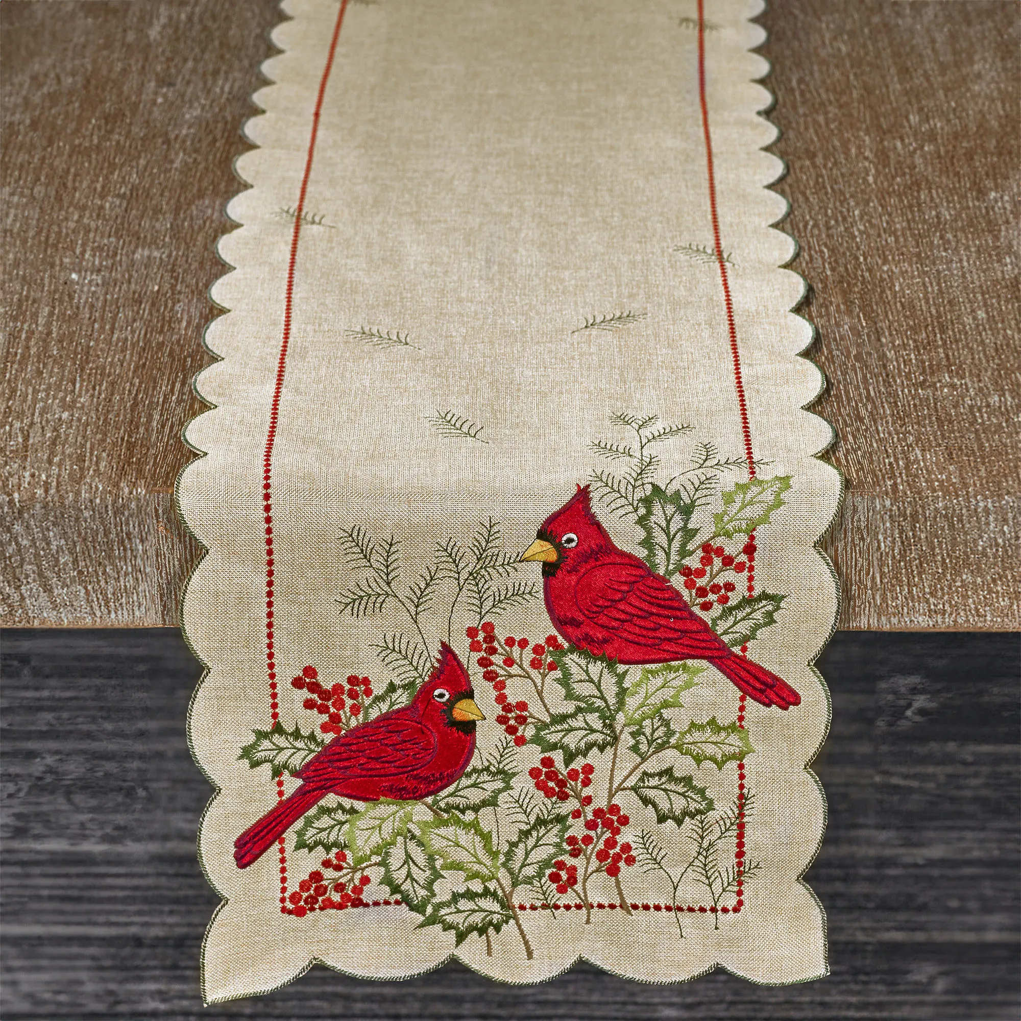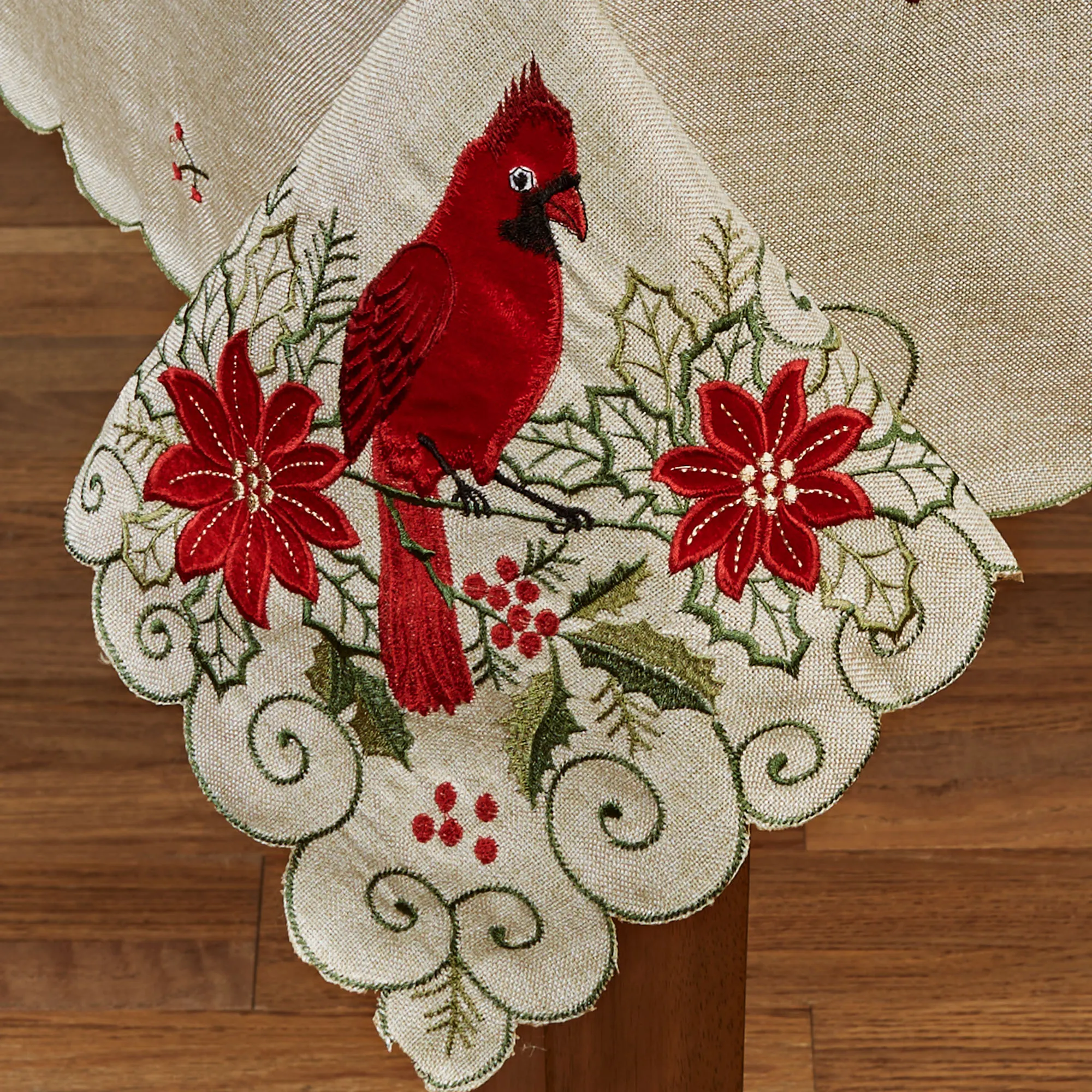 Bring joy to any holiday tabletop with the charming Cardinal Table Accessories. These polyester table linens have embroidered accents. Choose Oblong Tablecloth, Table Runner, or Placemat (sold individually). Oblong Tablecloth, 60"W, has scalloped ends, green holly leaves, red winter berries, green scrolls, red velvet poinsettias, and cardinal corner designs on a woven natural background. Table Runner, 14"Wx72"L, has scalloped ends, green leaves, red winter berries, a dotted red frame, and red velvet cardinals on a woven natural background. The shaped Placemat, 12"x26", showcases a red cardinal along with green leaves and gold berries. Placemat can also be hung using the loop on the back. Machine washable. Imported.