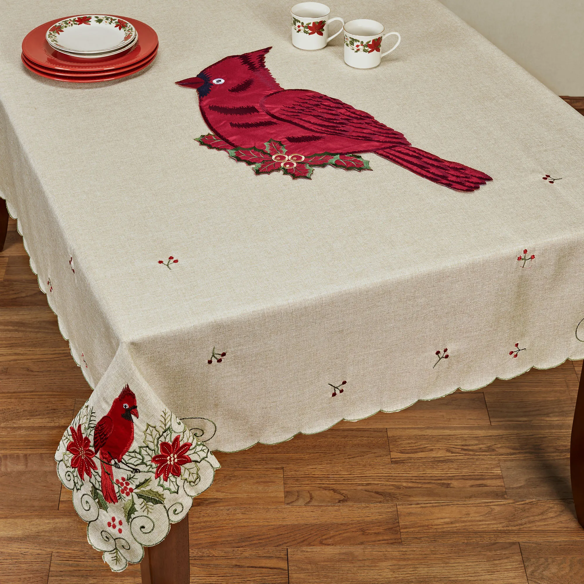 Bring joy to any holiday tabletop with the charming Cardinal Table Accessories. These polyester table linens have embroidered accents. Choose Placemat (sold individually), Oblong Tablecloth, or Table Runner. The shaped Placemat, 12"x26", showcases a red cardinal along with green leaves and gold berries. Placemat can also be hung using the loop on the back. Oblong Tablecloth, 60"W, has scalloped ends, green holly leaves, red winter berries, green scrolls, red velvet poinsettias, and cardinal corner designs on a woven natural background. Table Runner, 14"Wx72"L, has scalloped ends, green leaves, red winter berries, a dotted red frame, and red velvet cardinals on a woven natural background. Machine washable. Imported.