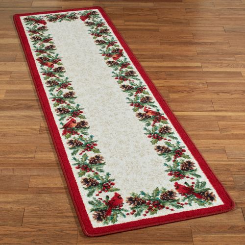 Be sure to listen this holiday season for the sweet sounds of a Cardinal Song. This power-loomed nylon rug runner, .375" thick, features printed designs of red cardinals, green holly leaves, red berries, and brown pine cones. The ivory background has subtle gold snowflake designs. We recommend professional cleaning by a rug cleaner.