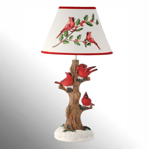 Illuminate any room with the soft glow of the Cardinal Table Lamp. Made of resin, this festive Christmas table lamp features cardinal birds perched on snowy branches, along with holly leaf, berry, pine cone, and glitter accents. The soft white fabric shade has printed cardinals and holly branches with red trim. UL listed. Requires one 40W max. bulb, not included. Measures approx. 11"dia.x20"H.
