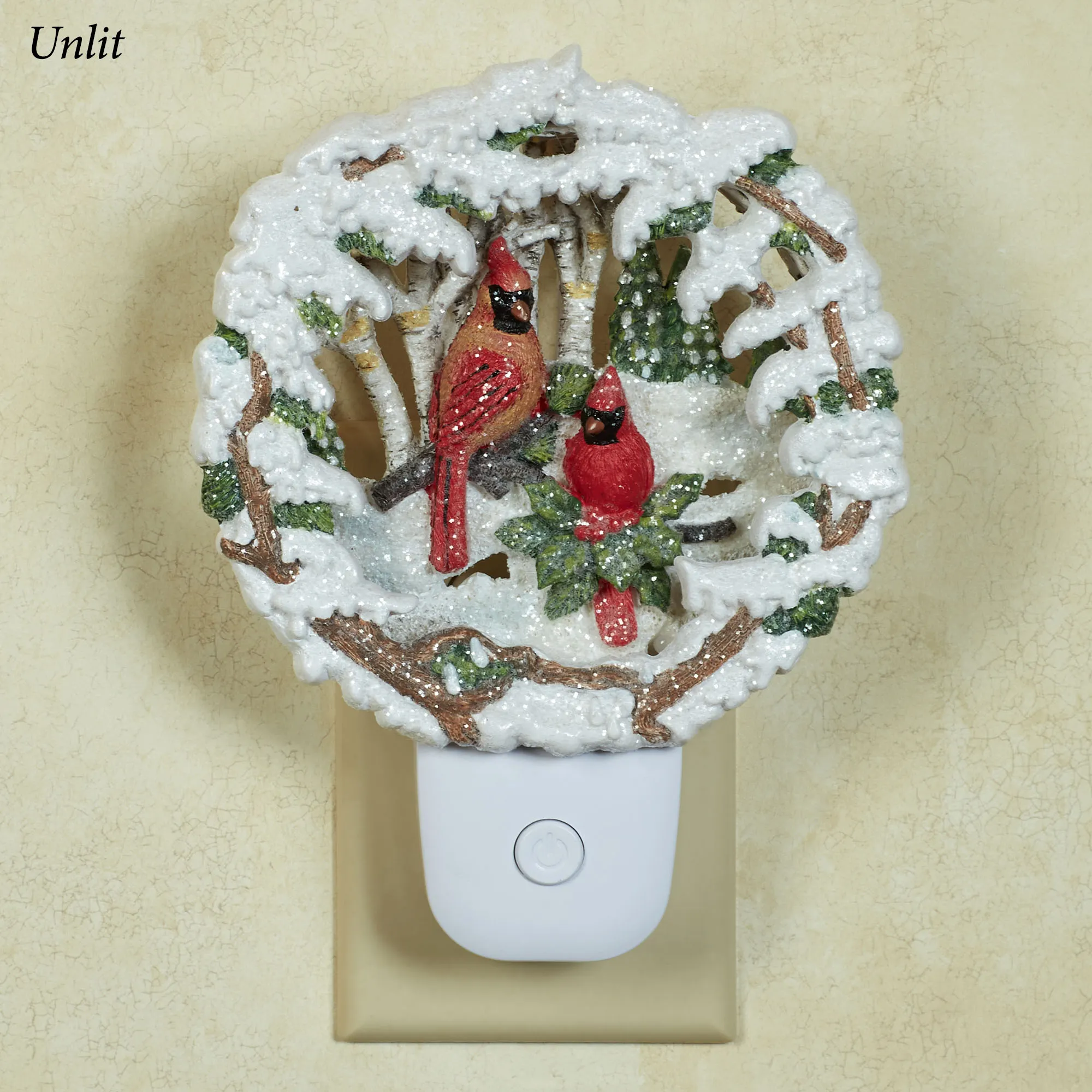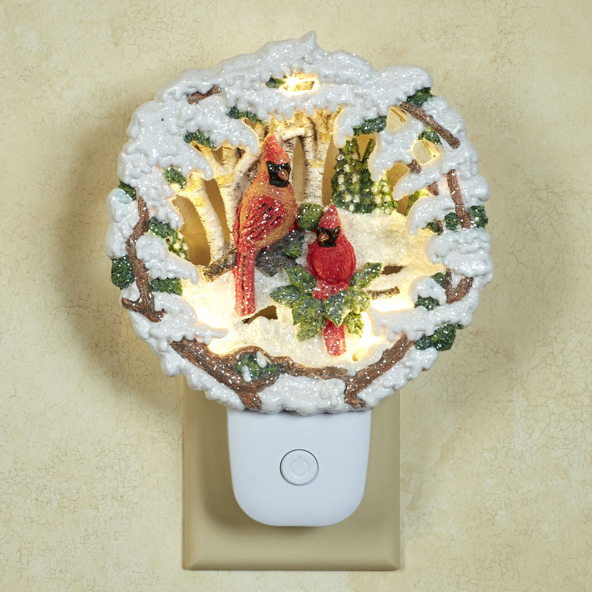 A Cardinal Winter Scene decorates with woodland flair. This resin nightlight, from Roman Lights(TM), features a male and female cardinal bird, snow, pine trees, birch trees, and glitter accents. UL listed. The on/off switch is located on the front of the white base. Plug rotates to accommodate any outlet. Nightlight bulb is included. Measures 5"Wx1.5"Dx6.5"H.