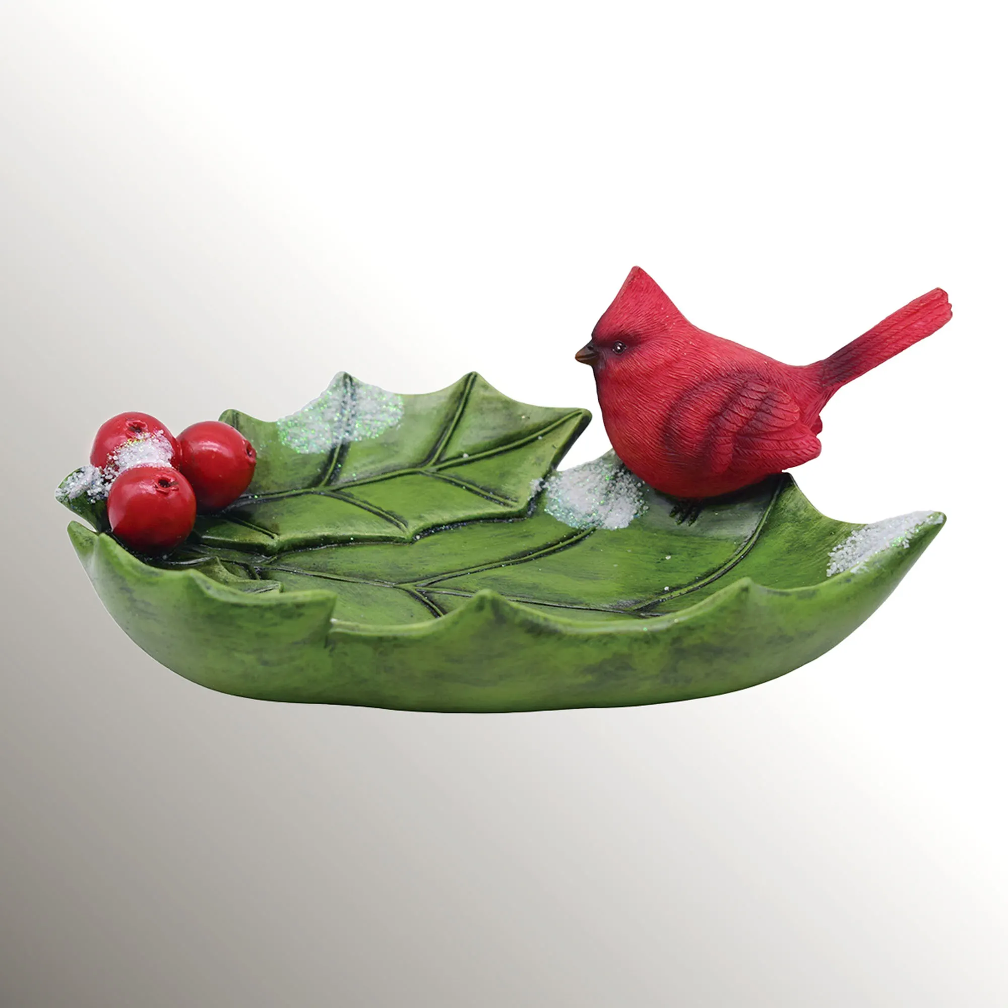 The Cardinal with Holly Leaf Tray adorns your space with winter charm. Crafted from resin, the decorative accent resembles veined green holly leaves that form a tray, accented by red berries and a visiting red cardinal bird. Black antiquing adds detail, while icy glitter offers a snowy effect. Decorative use only. Perfect for wrapped candies, decorative accents, or your flameless LED candles, the tray measures 9.5"Wx7"Dx3.5"H overall.