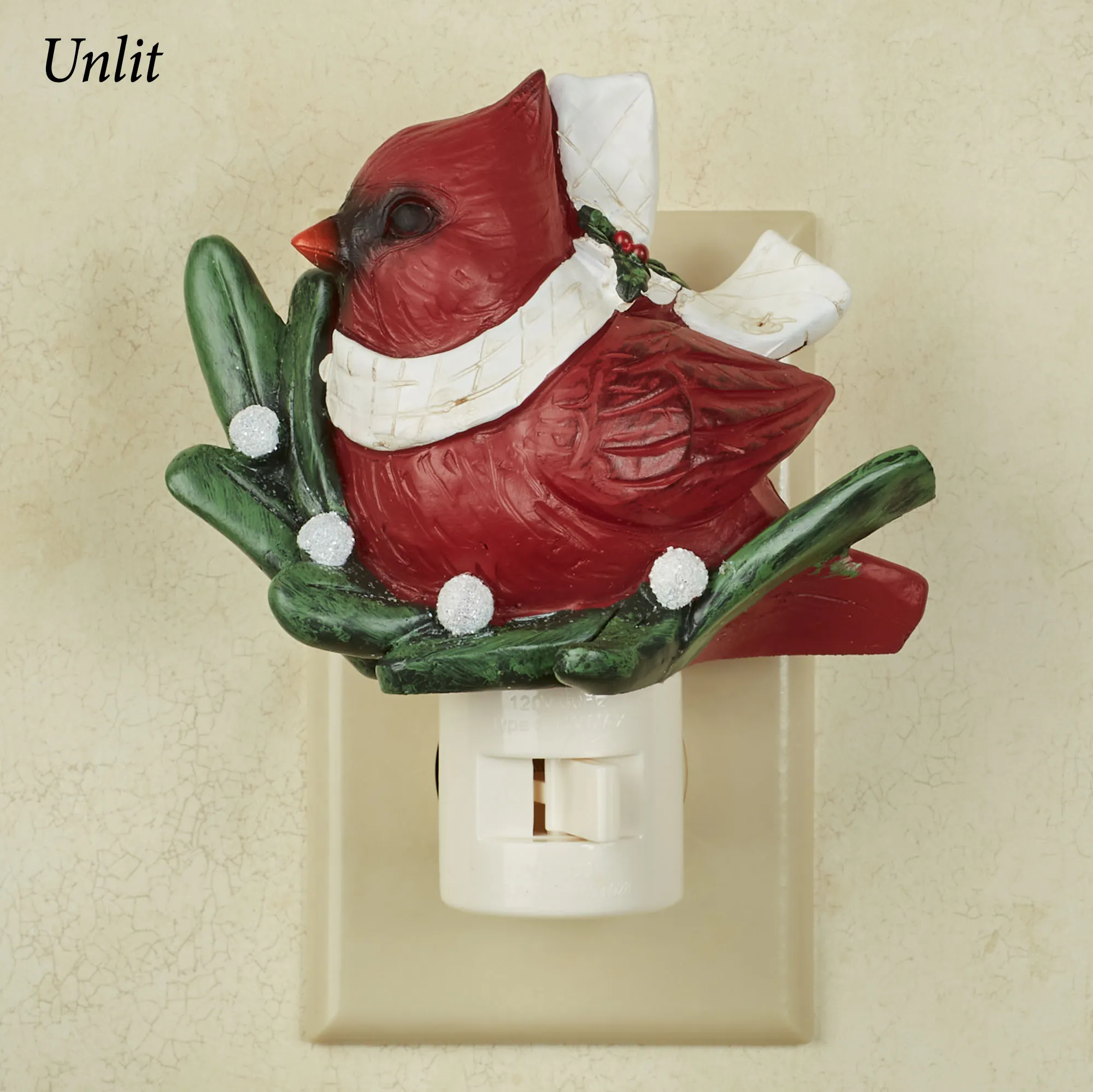 Let the Cardinal with Mistletoe Nightlight provide a guiding light this holiday season. Made of resin, this nightlight, by Roman Lights(TM), features a red cardinal among a mistletoe branch. Glitter accents add holiday charm. UL listed. Nightlight bulb is included. The on/off switch is located on the base. Plug swivels to accommodate any outlet. Measures 4"Wx2.5"Dx4.5"H.