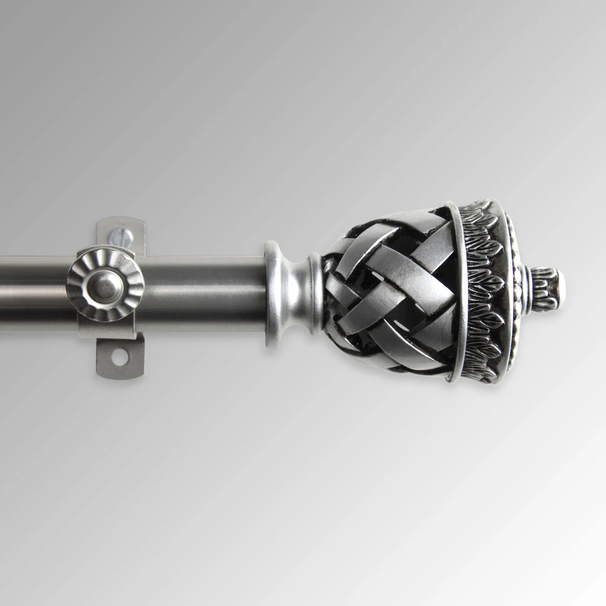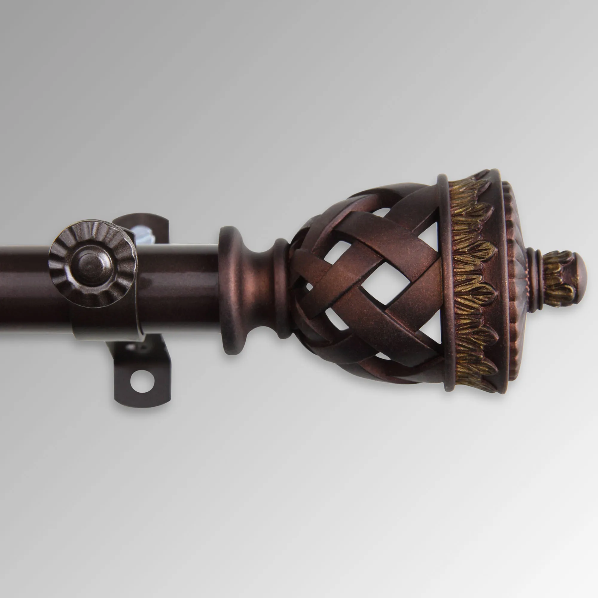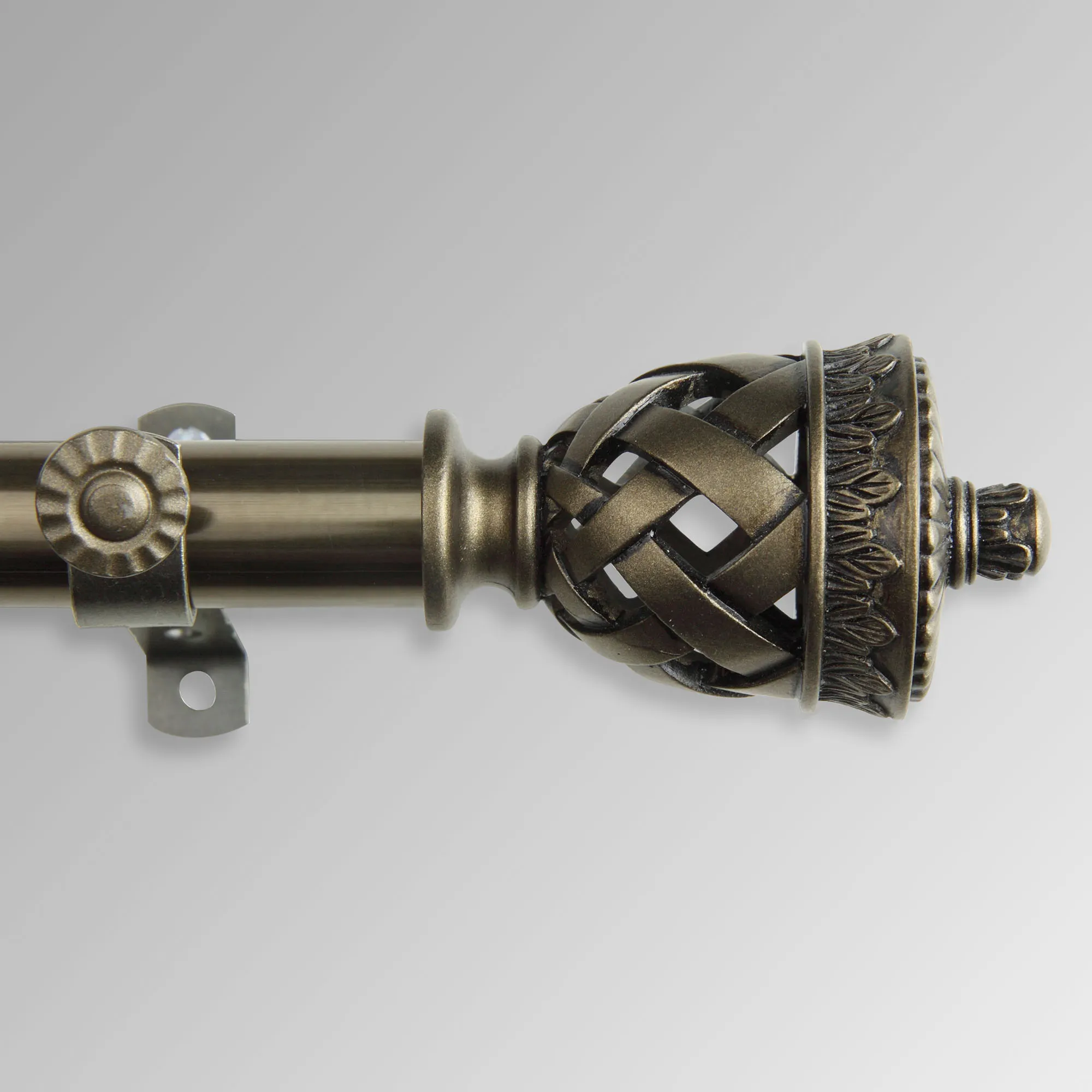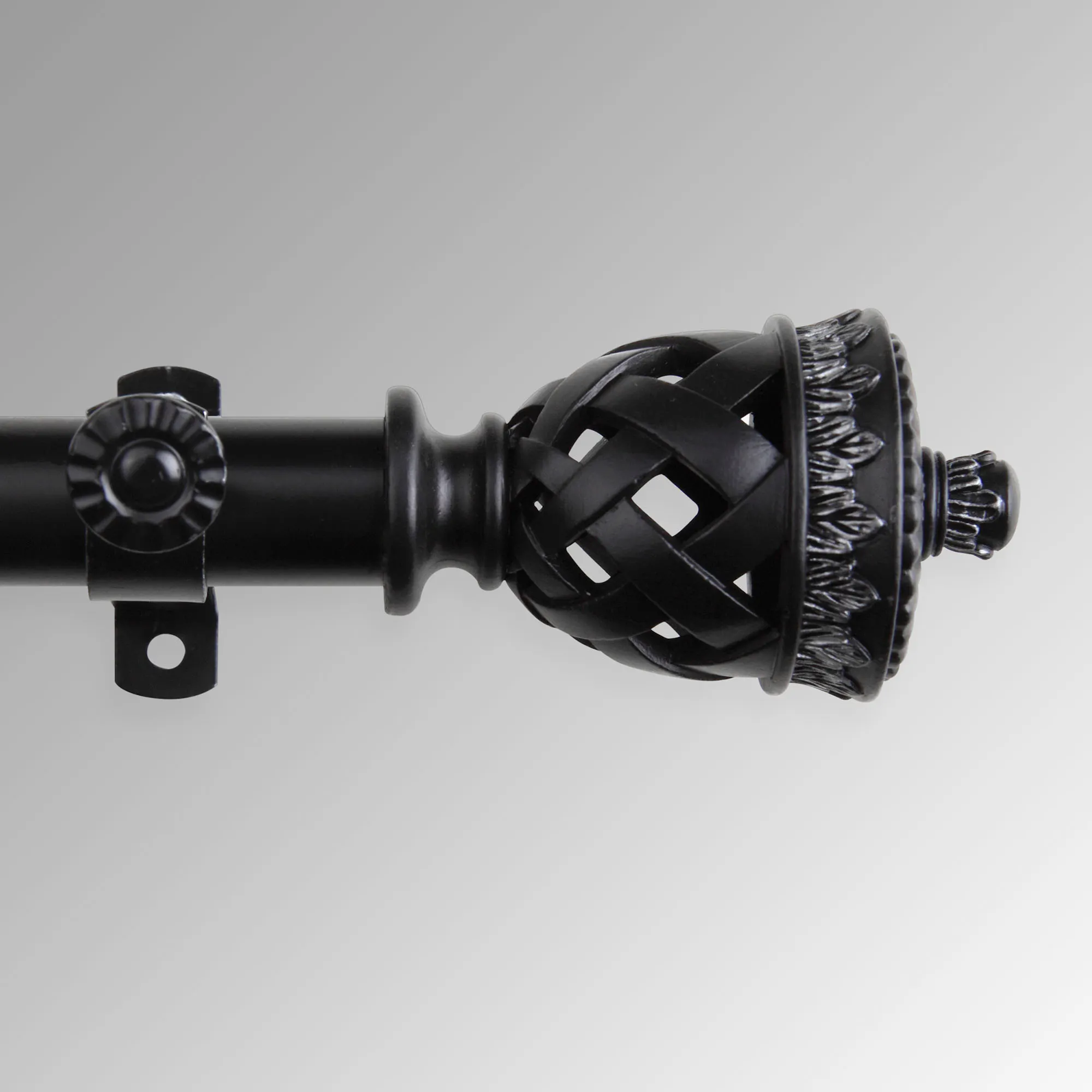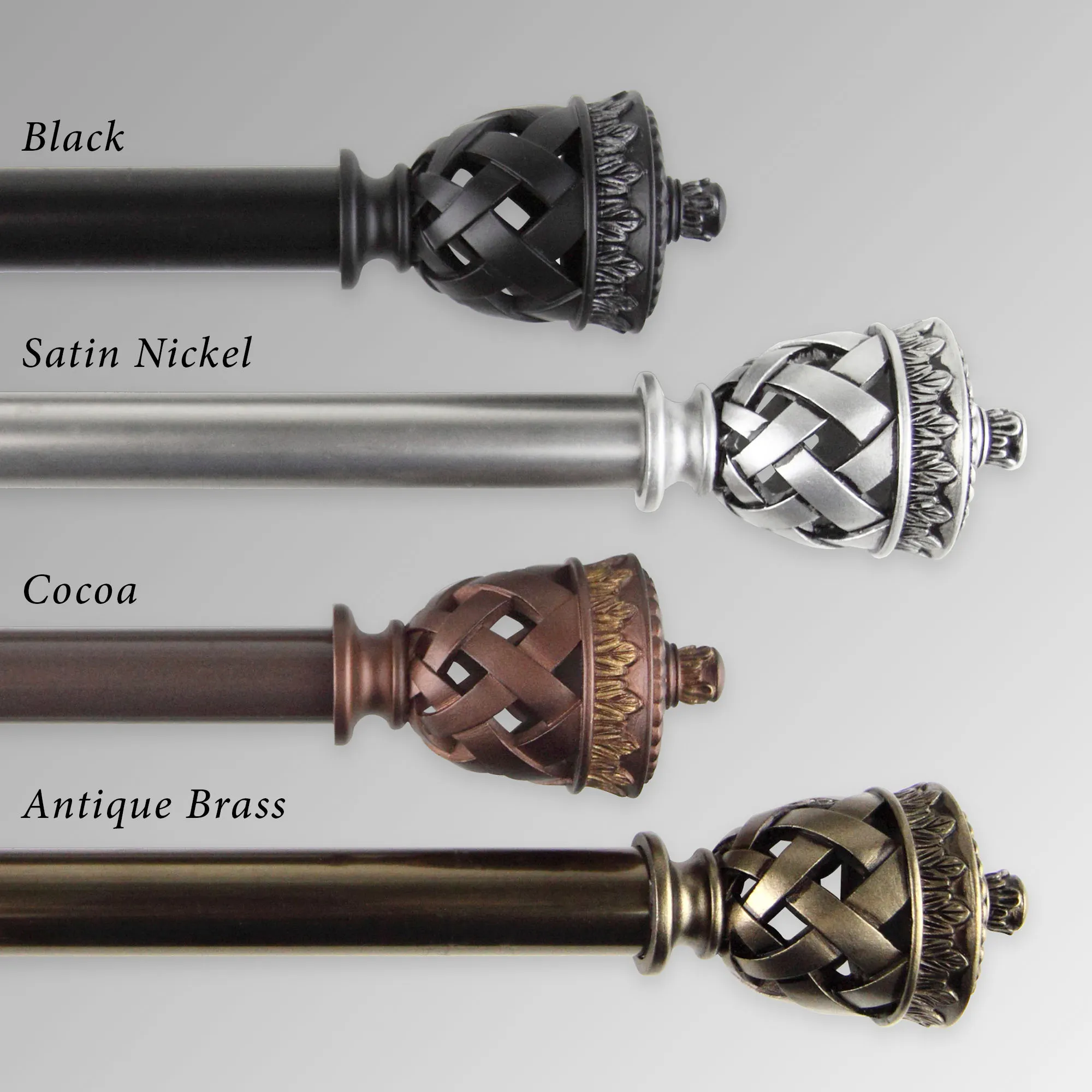 The Carina Curtain Hardware adds a traditional touch to your view with an urn shape, openwork basket weave, and acanthus leaf detailing. Crafted from resin, each decorative finial measures 1.75"dia.x3"L. The Decorative Curtain Rod Set includes a .75" dia. telescoping steel rod, brackets that project 2.875", and two finials. The 18"-28" and 28"-48" rods include two brackets. The 48"-84" and 66"-120" rods include three brackets. The 120"-170" rod includes four brackets. The steel and resin Curtain Holdback Pair is sold separately; holdbacks measure 6"Wx3"D each.