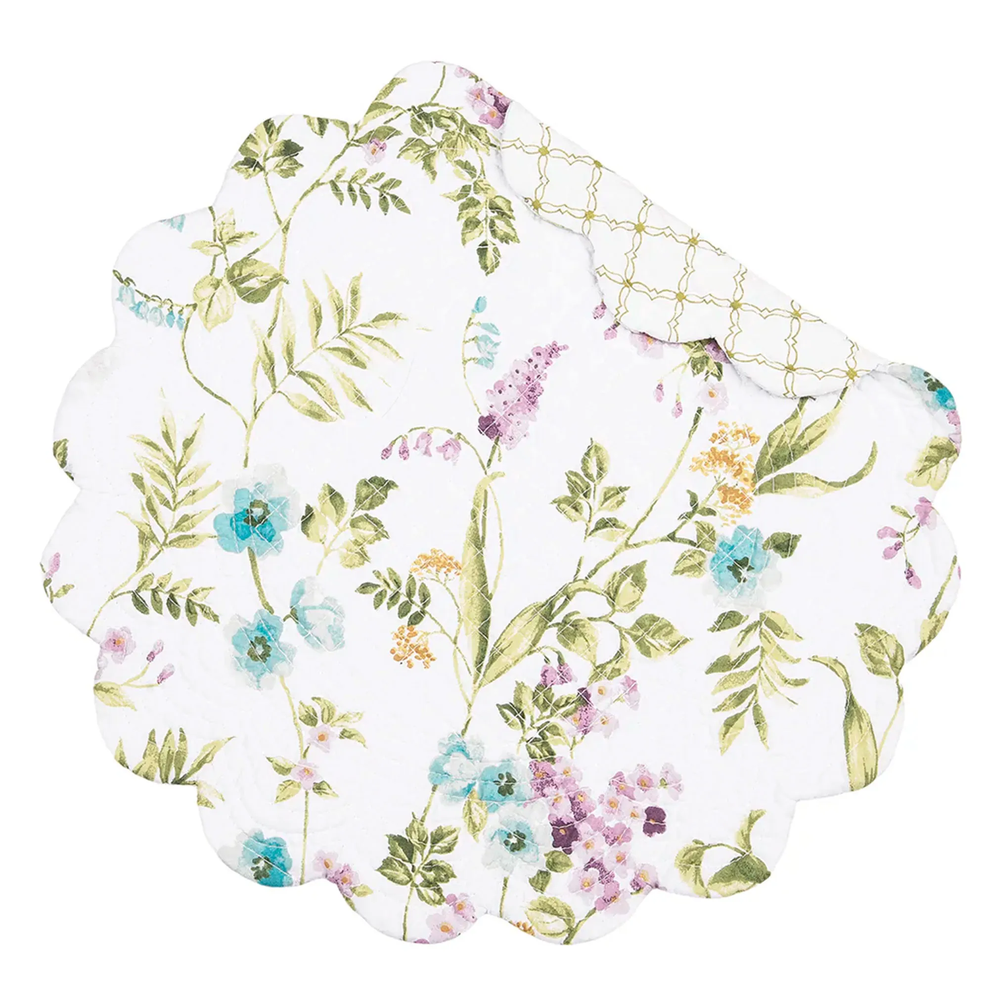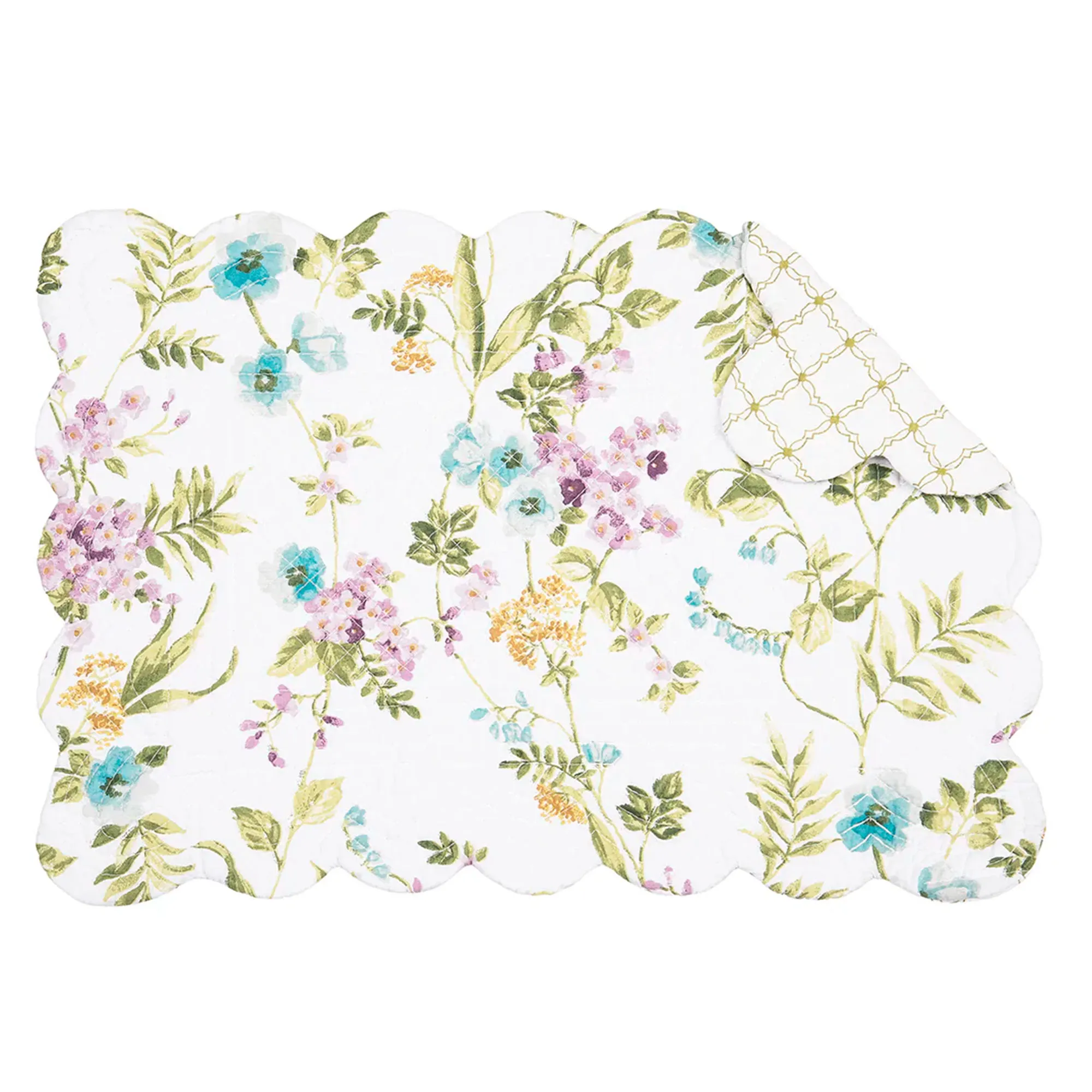 The beautiful flowers and leafy stems on the Carley Floral Table Linens provide a sweet escape from reality. These cotton table linens feature floral designs on a white background; the reverse side has a simple green trellis pattern on white. Most of these accessories are quilted and have scalloped edges. Colors include shades of blue, purple, green, and yellow. Choose Table Runner, Rectangle Placemat Set of 4, Round Placemat Set of 4, or Napkin Set of 4. Machine washable. Imported.