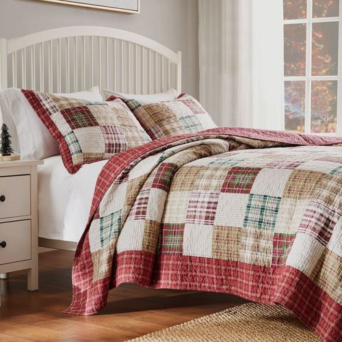 The Carlton Bedding exudes timeless charm and comfort. Pre-washed and preshrunk, the pure cotton ensemble features various plaid and striped patchwork squares in shades of burgundy, red, gold, green, brown, ivory, and natural. A red and ivory plaid frame and vermicelli quilting complete the traditional appeal. The design is OEKO-TEX(R) certified, which ensures a lack of harmful chemicals, making the bedding safe for the whole family.