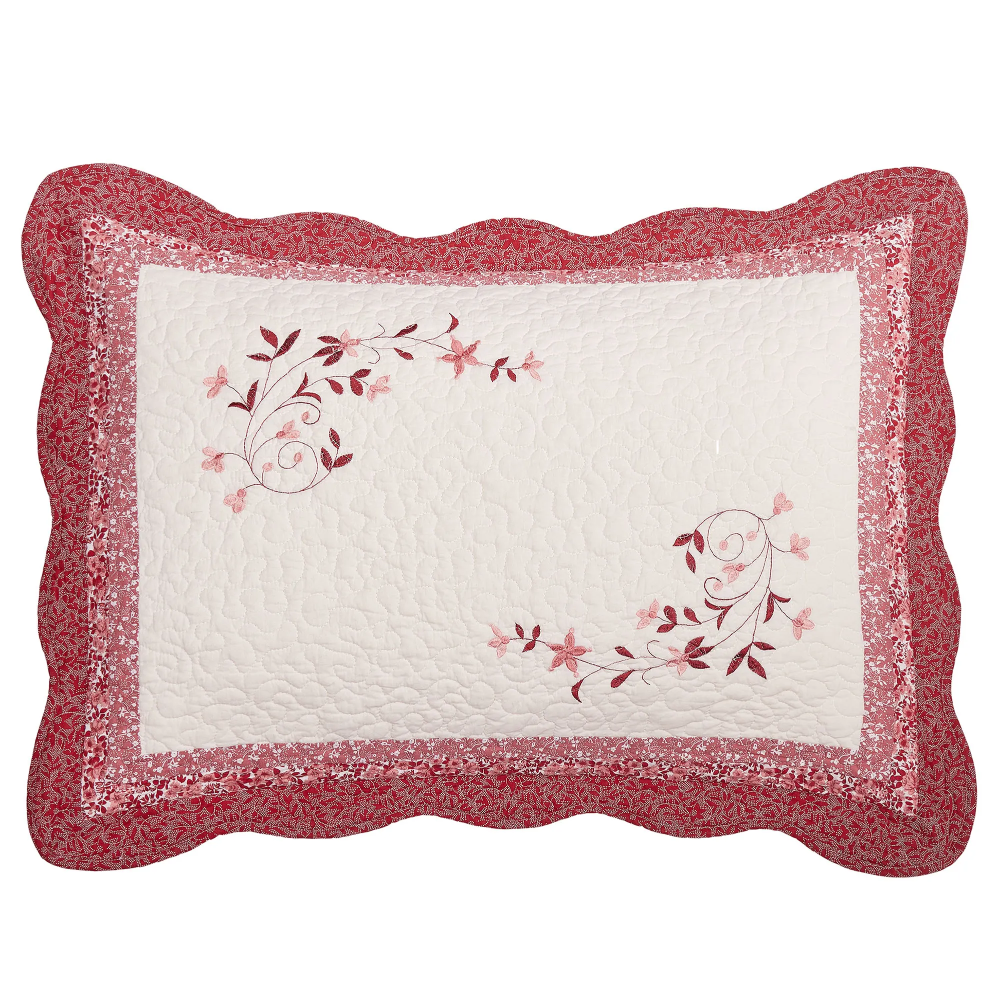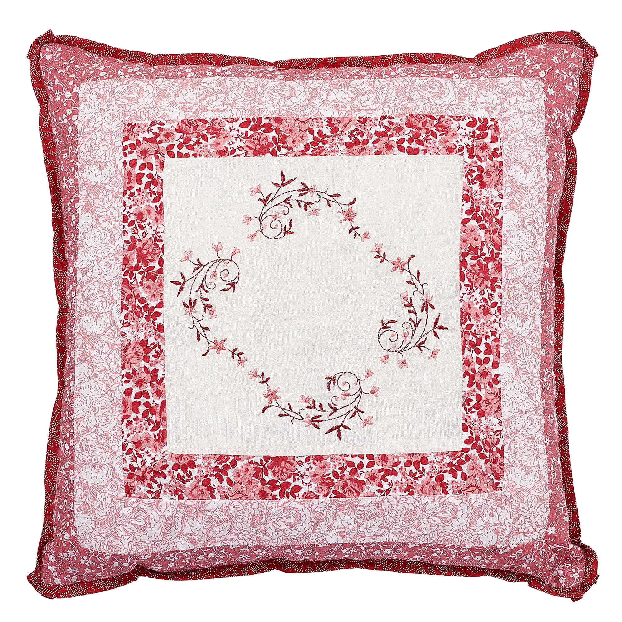Allow the red, raspberry, and pink sweet warmth of the Caroline Bedding to blossom in your space. From the Modern Heirloom Collection(R), the cotton ensemble features a classic patchwork dahlia design crafted from a variety of miniature floral motifs. Embroidered miniature scrolling floral vines ring the dahlia design on the ivory ground, while pieced printed floral frames finish the look.