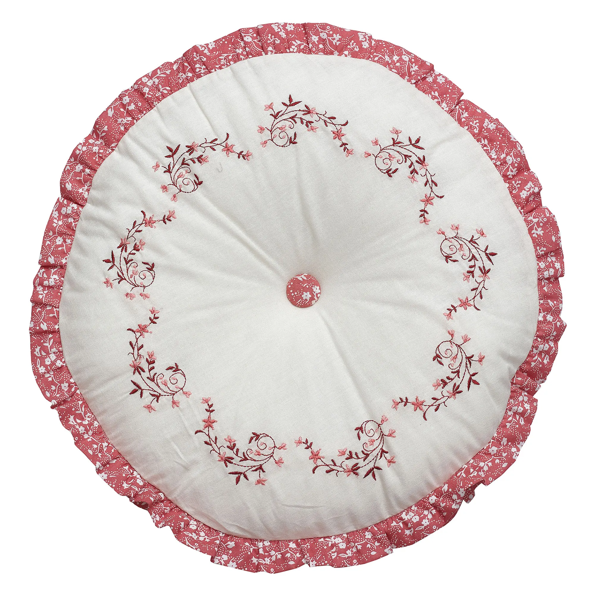 Pillows have embroidered florals on ivory. Spot clean. Square also has pieced floral frames and mini-flange edges; reverses to florals on raspberry. Round has a center button tuft and gathered flanged edges.