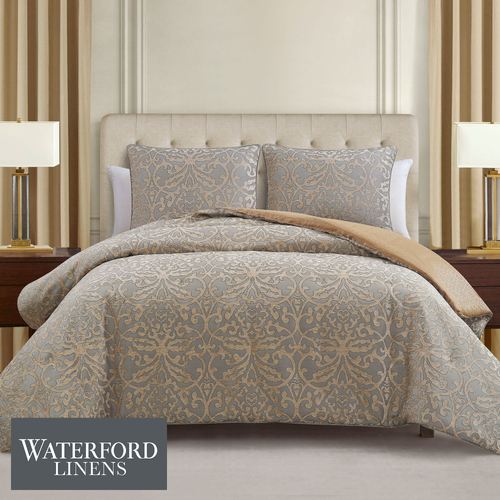 Decorate with the understated sophistication of the Carrick Comforter Bedding from Waterford(R) Linens. The Comforter Set includes a comforter and shams. The jacquard-woven polyester comforter features antique gold chenille scrollwork damask on a dark gray ground. Oversized comforter has a miniature medallion reverse in tone-on-tone antique gold hues. Bedding fill is polyester. Dry clean only. Imported.