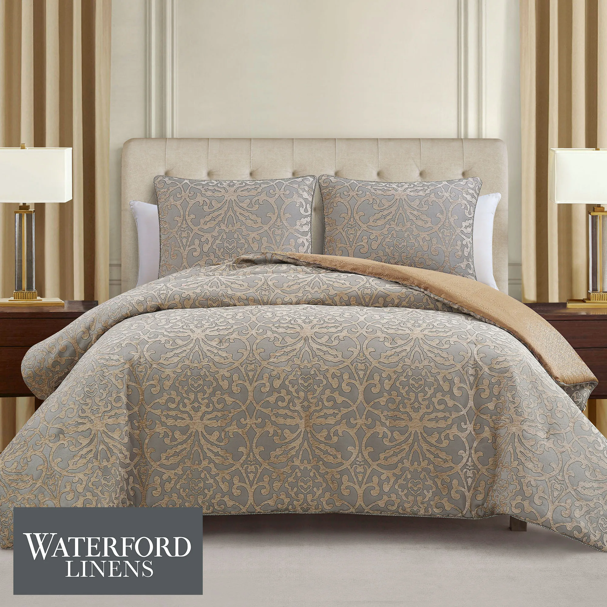 Carrick Reversible Gold and Dark Gray Damask Comforter Set Luxury Bedding by Waterford Linens