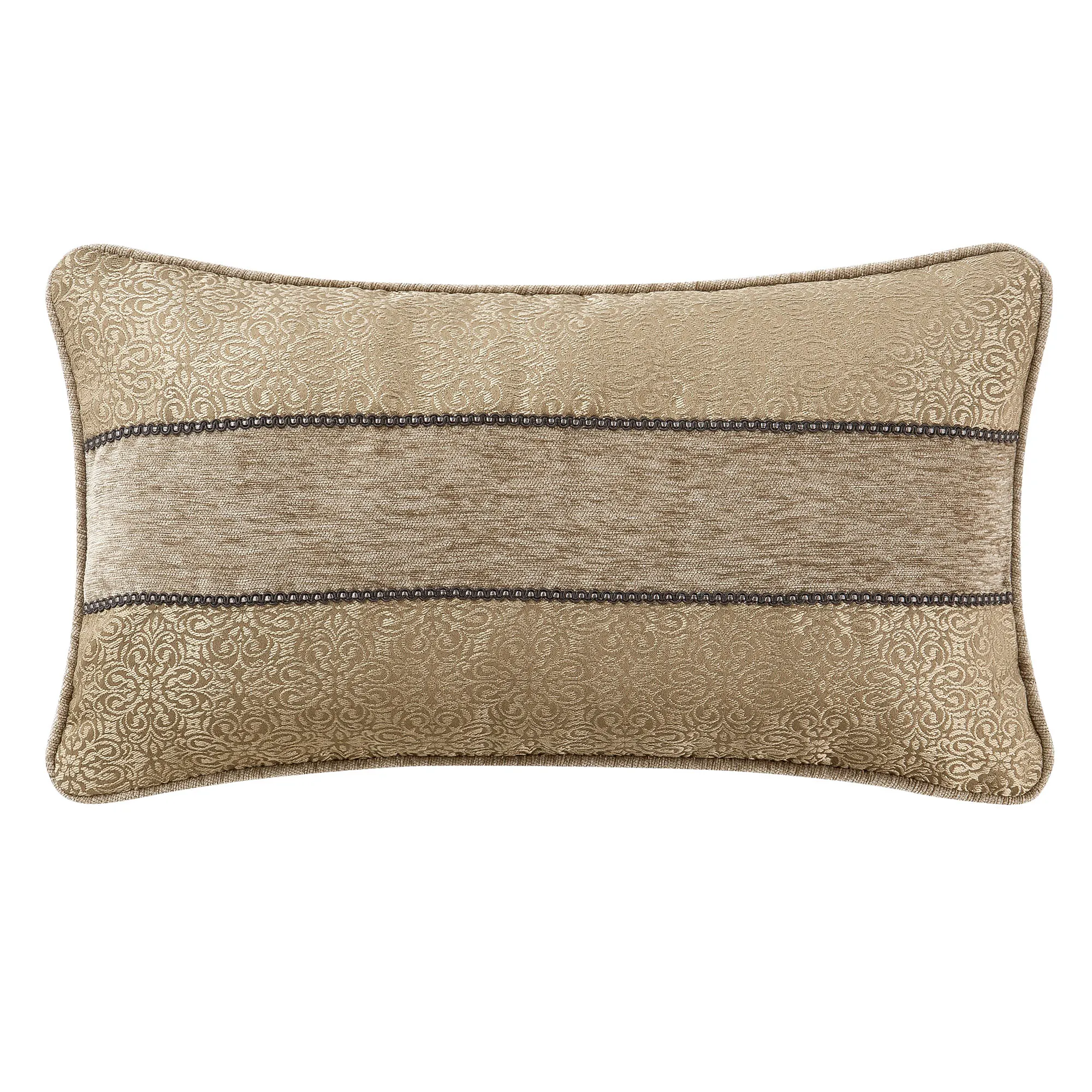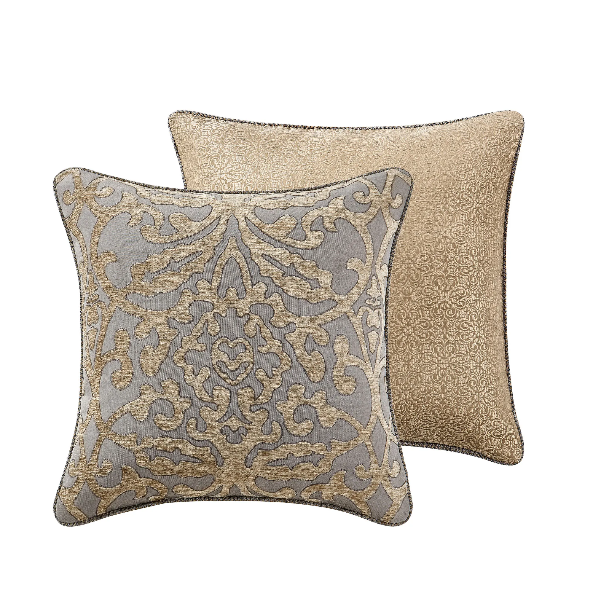 Pillows have zipper closures and polyester inserts. Spot clean. Piped Rectangle has an antique gold chenille center, gimp trim bands, and a miniature medallion top and bottom. Reversible 16" Square is light taupe acrylic/polyester faux fur with tailored edges. Piped 18" Square features damask and reverses to miniature medallions.