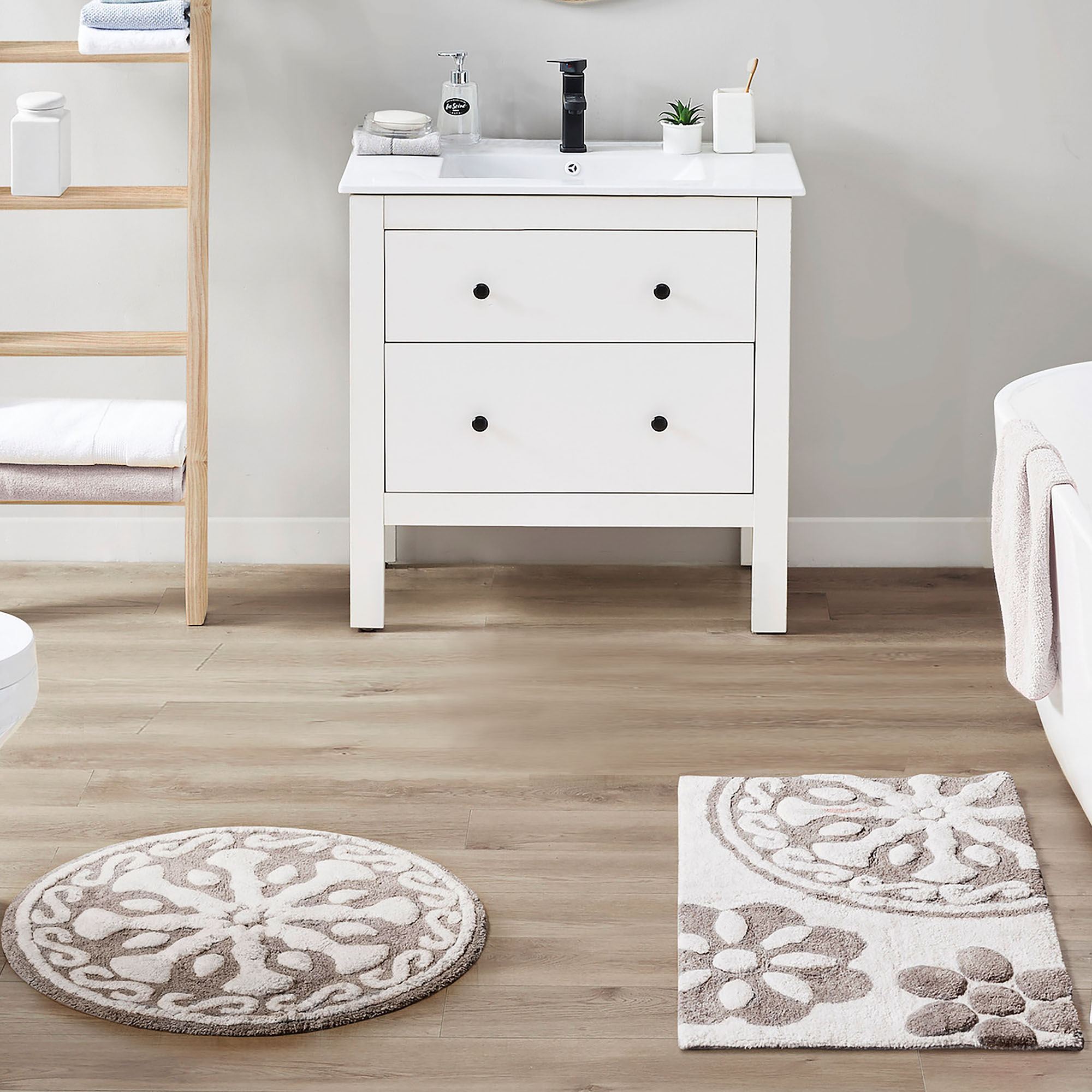 Add floral allure to your bath space with the Casablanca Medallion Taupe Bath Rugs. From Madison Park(R), each .5" thick, tufted cotton bath rug features an ivory flower-inspired medallion motif on taupe. A latex spray offers a skid-resistant backing. Rectangle Rug, 30"x20", features three medallion designs. Oval Rug, 34"x21", has a center medallion. Round Rug, 25" dia., has a center medallion. Machine washable. Imported.
