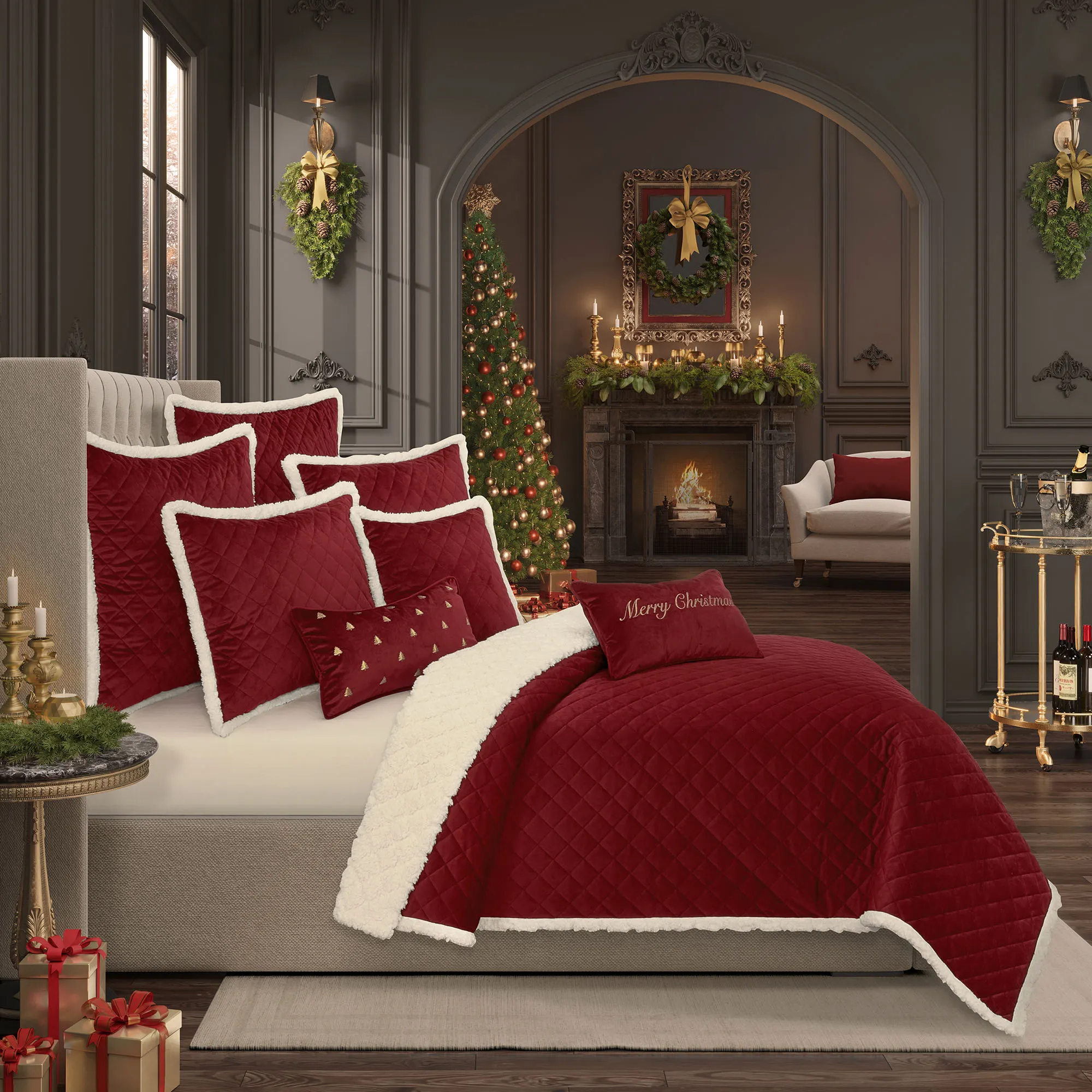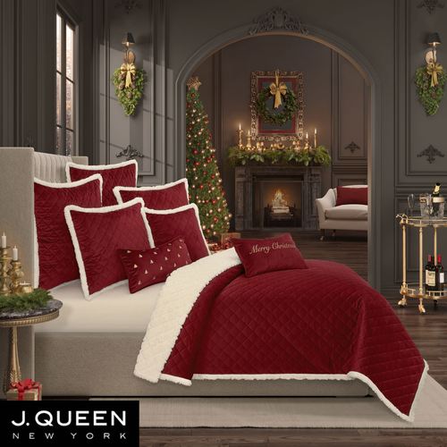 Have a luxuriously elegant holiday with the Casey Crimson Bedding from J. Queen New York. The Quilt Set includes a quilt and two shams. This solid crimson, polyester velvet bedding features a diamond quilt pattern and ivory sherpa accents. The flanged quilt has an ivory sherpa backing. Fill is polyester. Dry clean. Imported. Sorry, the Merry Christmas pillow is not available.