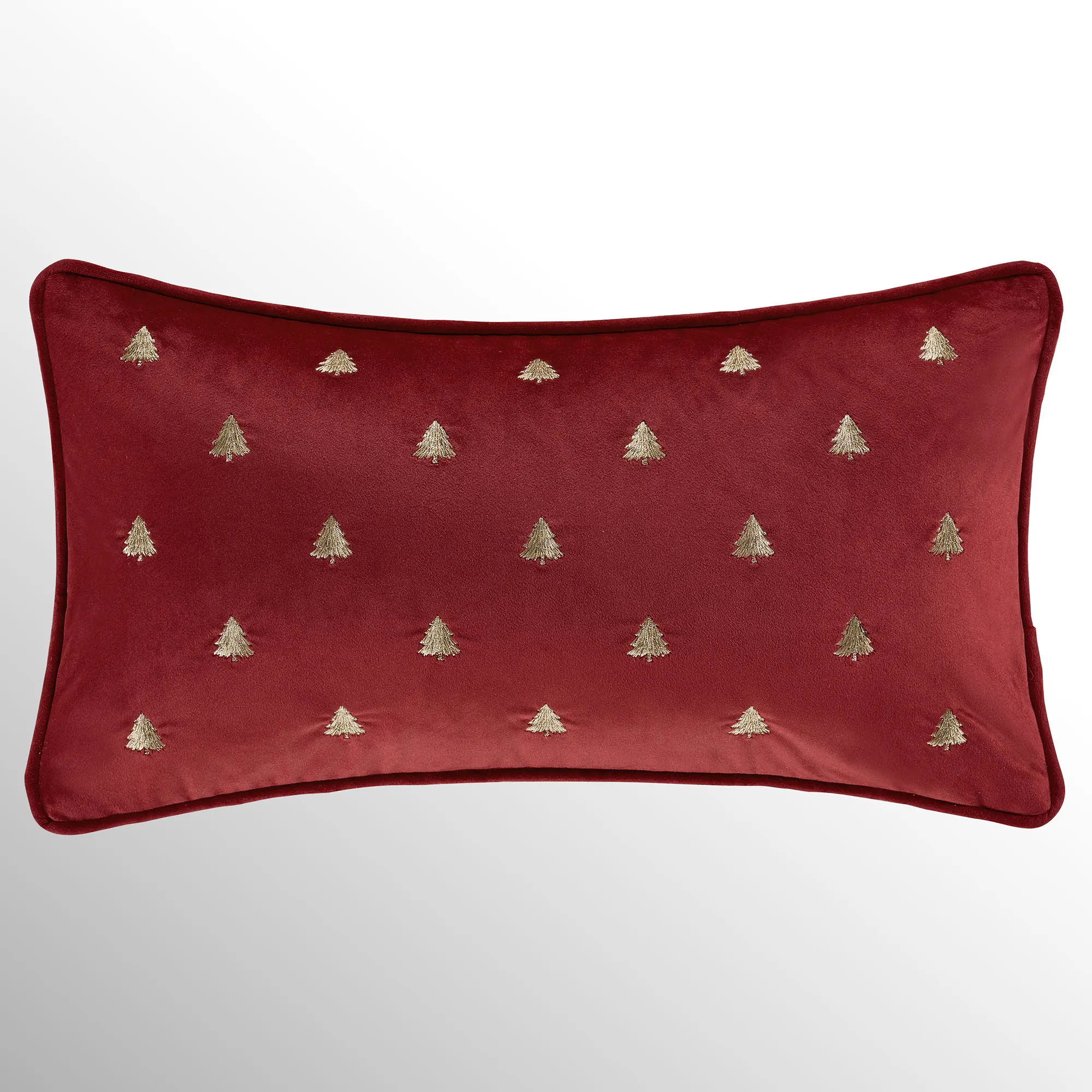 Pillows: Square has diamond quilting and flanged ends. Rectangle has gold Christmas tree embroidery and piped ends.