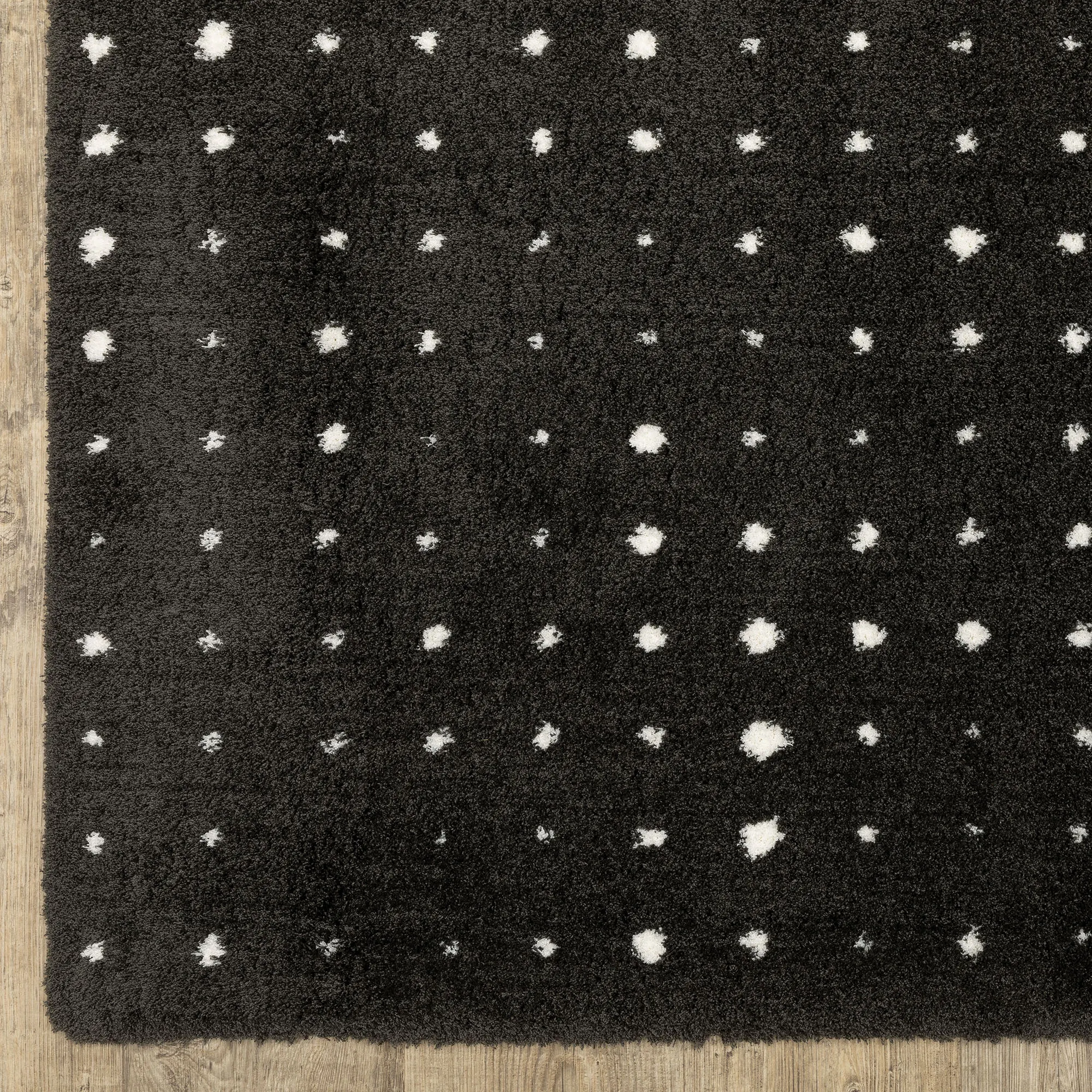 Dotted designs add contrast to the solid black background of the Casper Rug. The super-soft, power-loomed polyester microfiber area rug, .98" thick, has a dense pile and features simplistic dot motifs. Backing is woven polyester. We recommend professional cleaning by a rug cleaner. Imported.