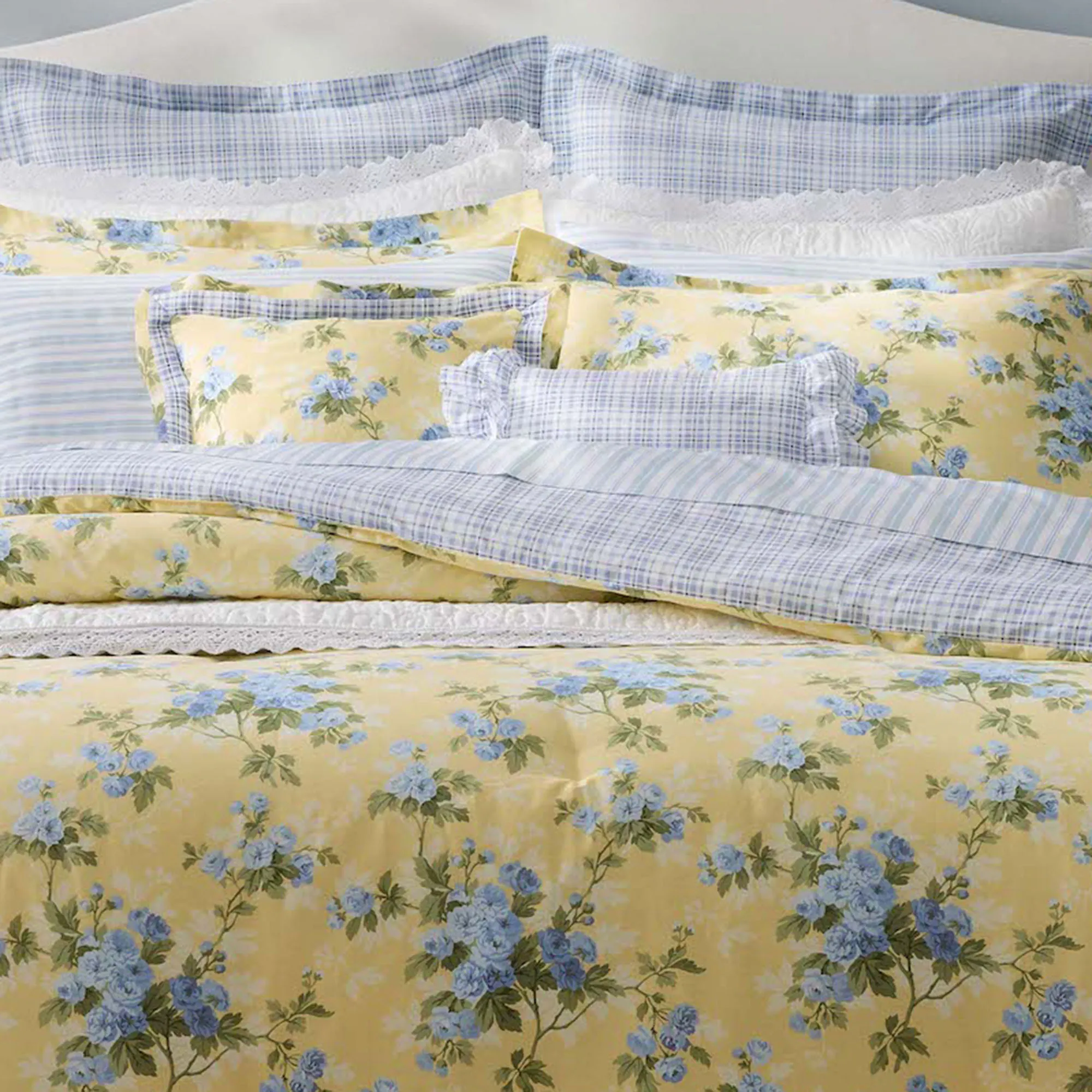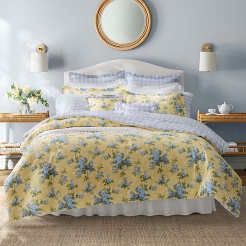 Bask in the sunny disposition of the Cassidy Floral Bedding from Laura Ashley. The 7-piece Bed Set includes a comforter, 2 shams, 2 European shams, and 2 decorative pillows. The printed pure cotton bedding features a lovely yellow background scattered with blue floral sprigs and green leaves. Comforter has tailored edges and a plaid reverse in blue and ivory for a darling countryside charm. Click on the Details tab to read about the other items in the bed set. Fill is polyester. Machine washable; spot clean pillows. Imported. Sorry, the bedskirt shown is not available.
