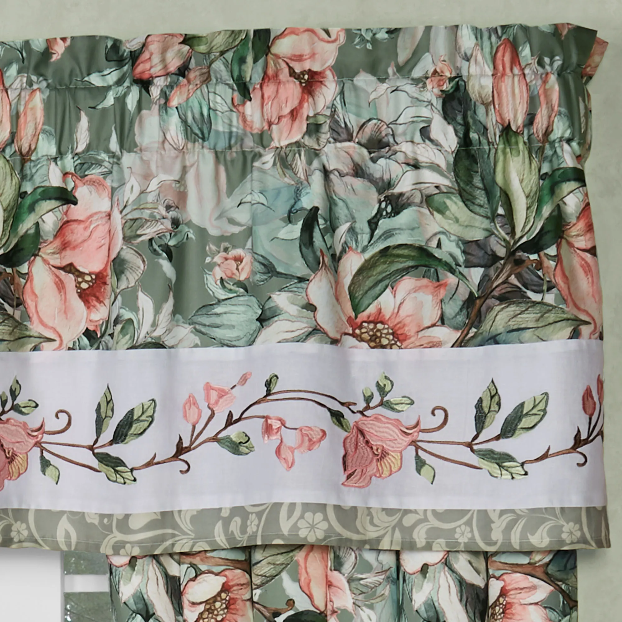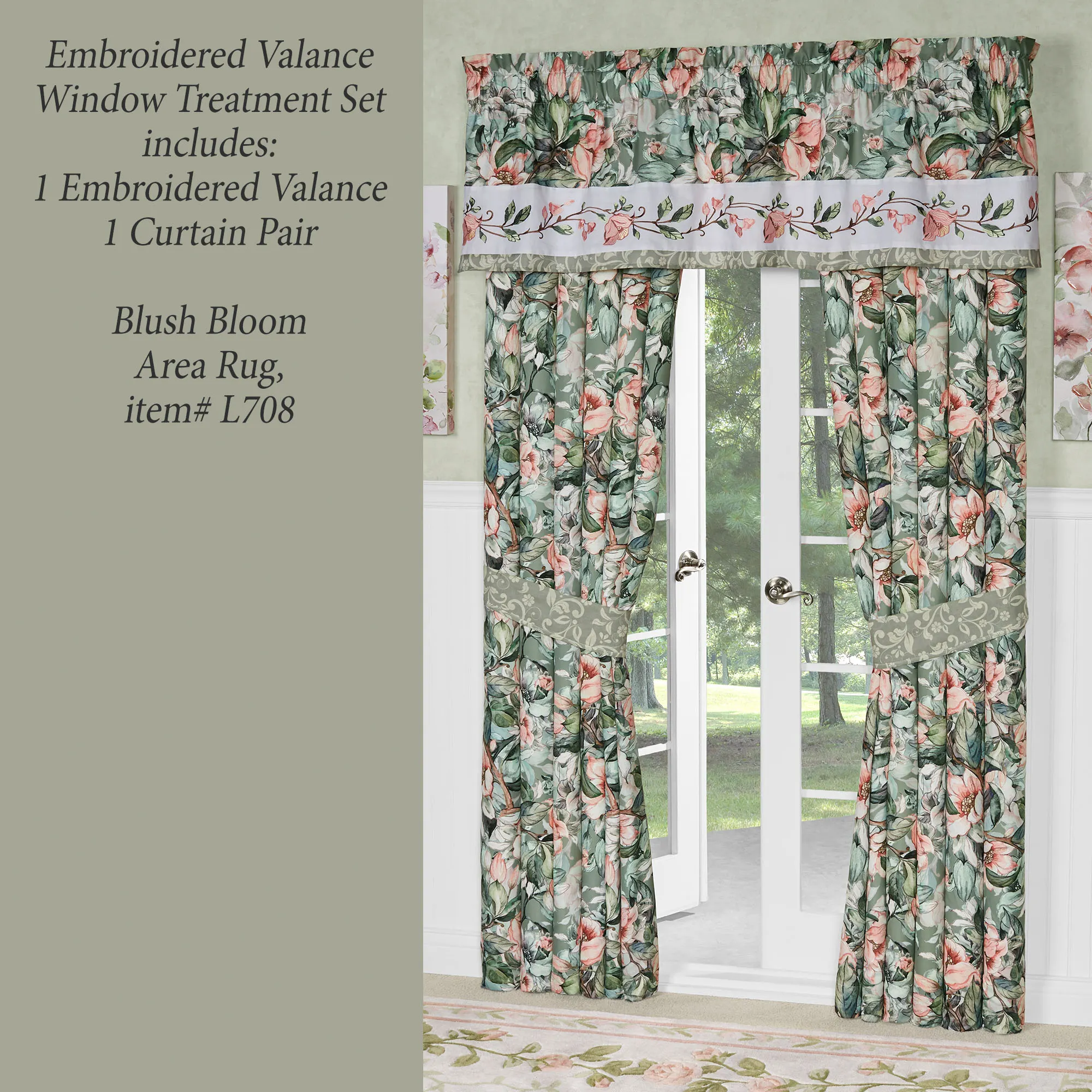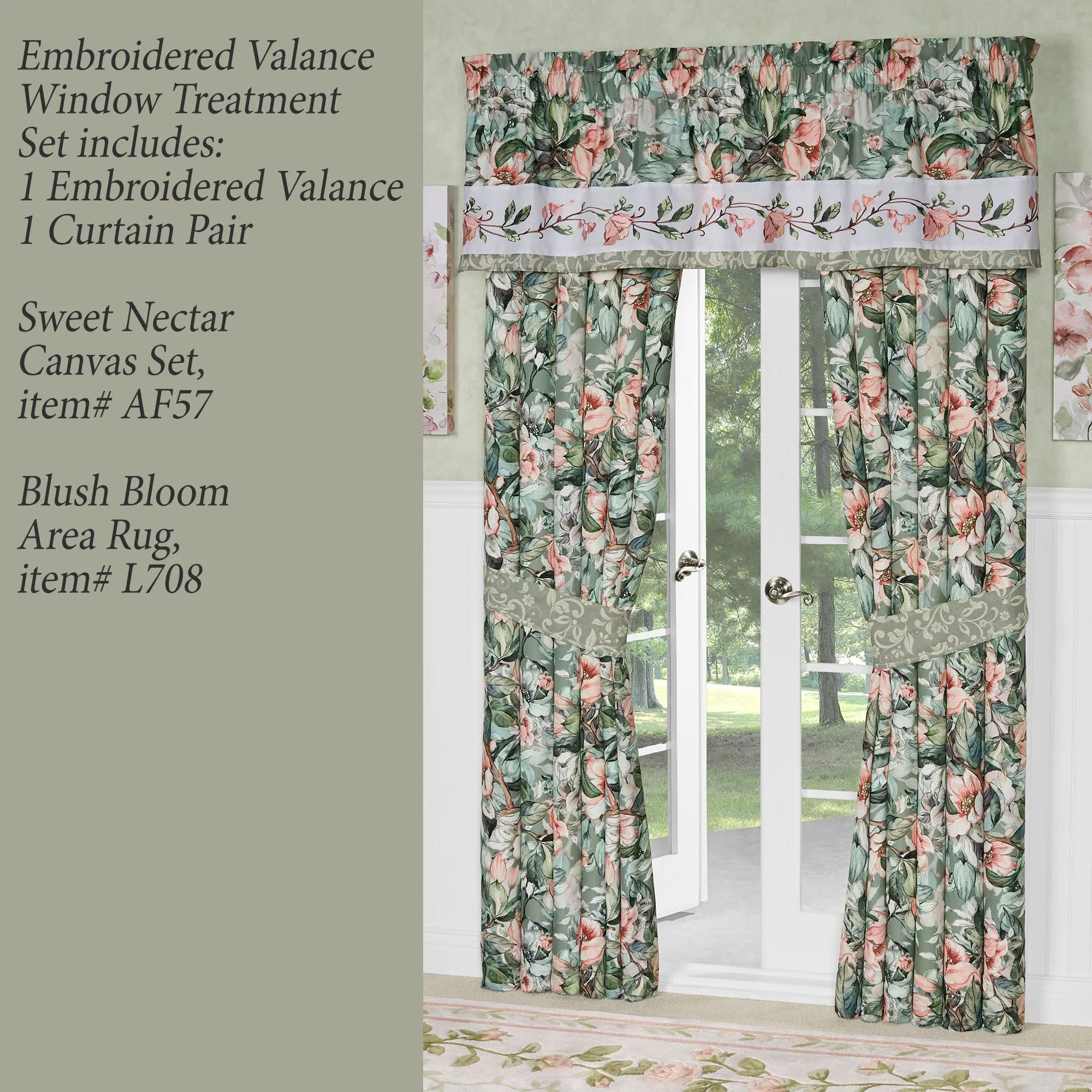 True beauty blossoms from the Catalina Floral Embroidered Window Treatment Set. Abundant coral petals bloom alongside green and charcoal leaves and brown branches on a seagrass ground. Lined, brushed polyester window treatment has tailored edges and 3" rod pockets. The three-piece window treatment set includes a 72"Wx18"L embroidered valance and an 84"Wx84"L curtain pair. Valance has an antique white cotton band with embroidered blooms; bottom trim has silver green leafy floral scrollwork on light seagrass. Curtain pair includes tiebacks. Machine washable. Imported.