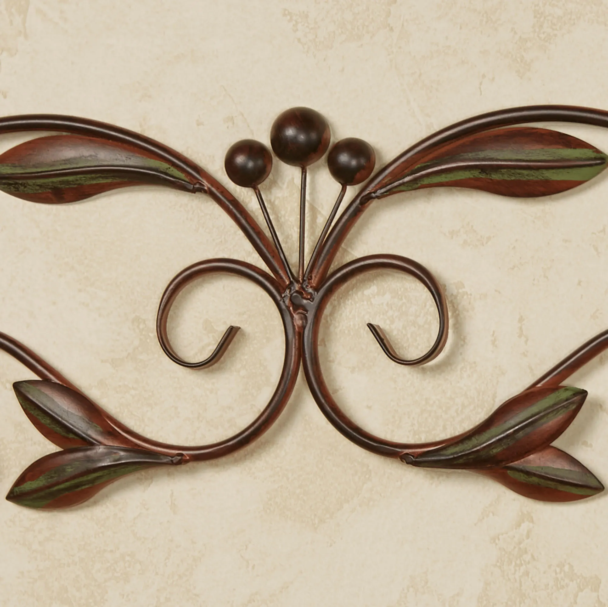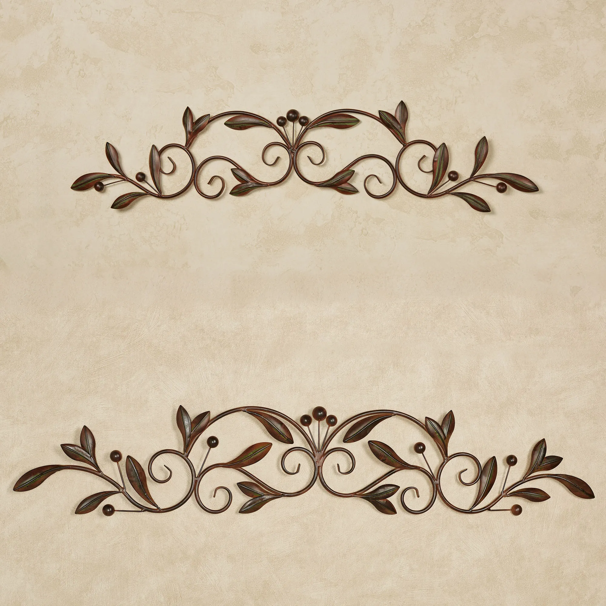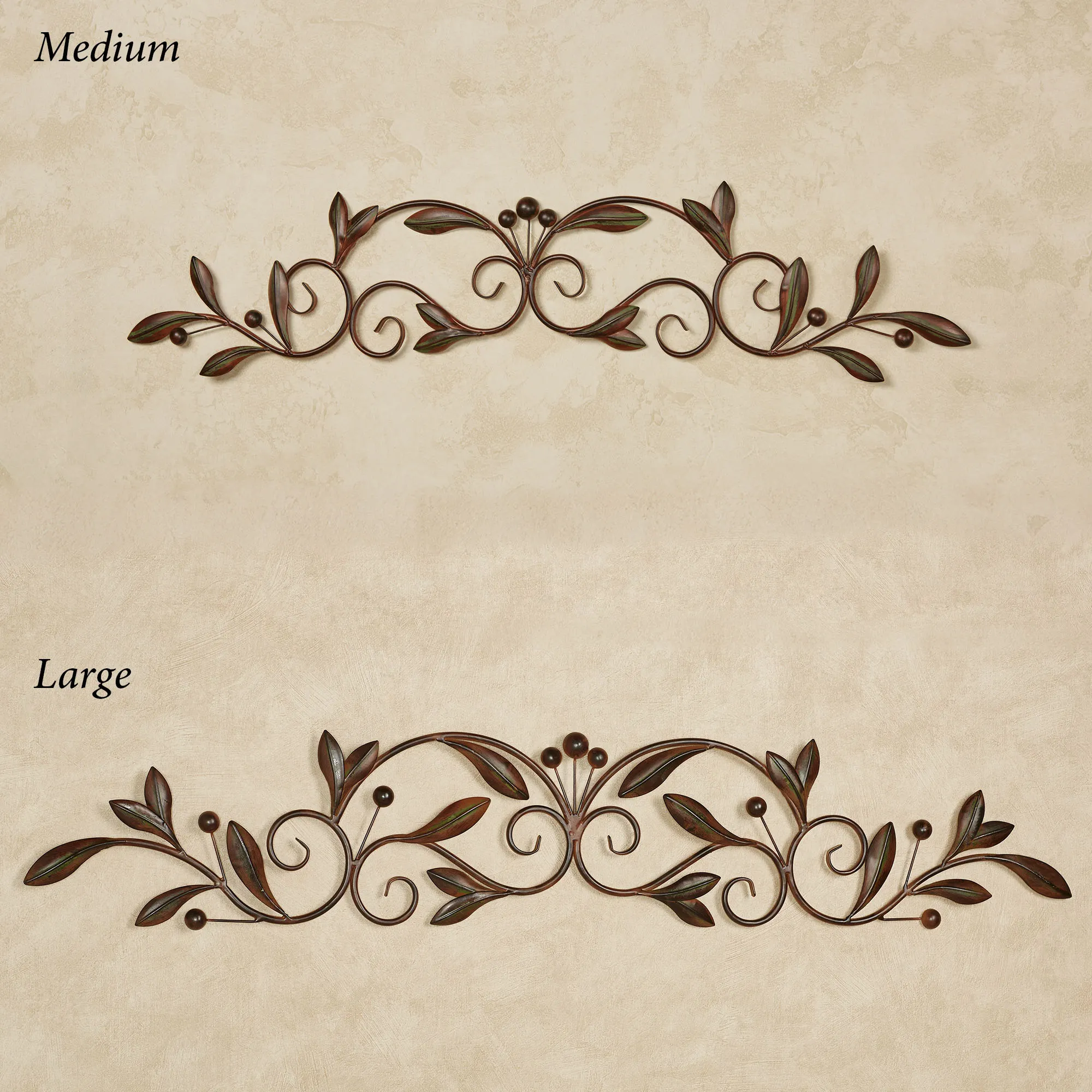 The Catalonia Olive Brown Wall Topper adds the perfect traditional touch to your artwork, doorway, or window. In a lovely scrolling design, the handcrafted metal wall accent features handpainted brown vining olive branches with leaves and olives. Medium is 36"Wx7.5"H. Large is 46"Wx8"H.