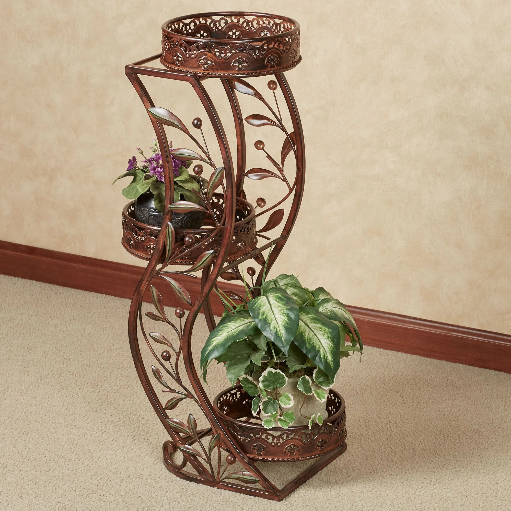 Scrolling branches, vining leaves, and olive berries decorate the Catalonia Brown Plant Stand with Mediterranean splendor. Made of metal with a rustic brown finish and rustic sage accents, this stand has three 9" dia. baskets for your plants. Indoor use only. Measures 18"Wx11.5"Dx33.5"H; weighs 10 lbs.