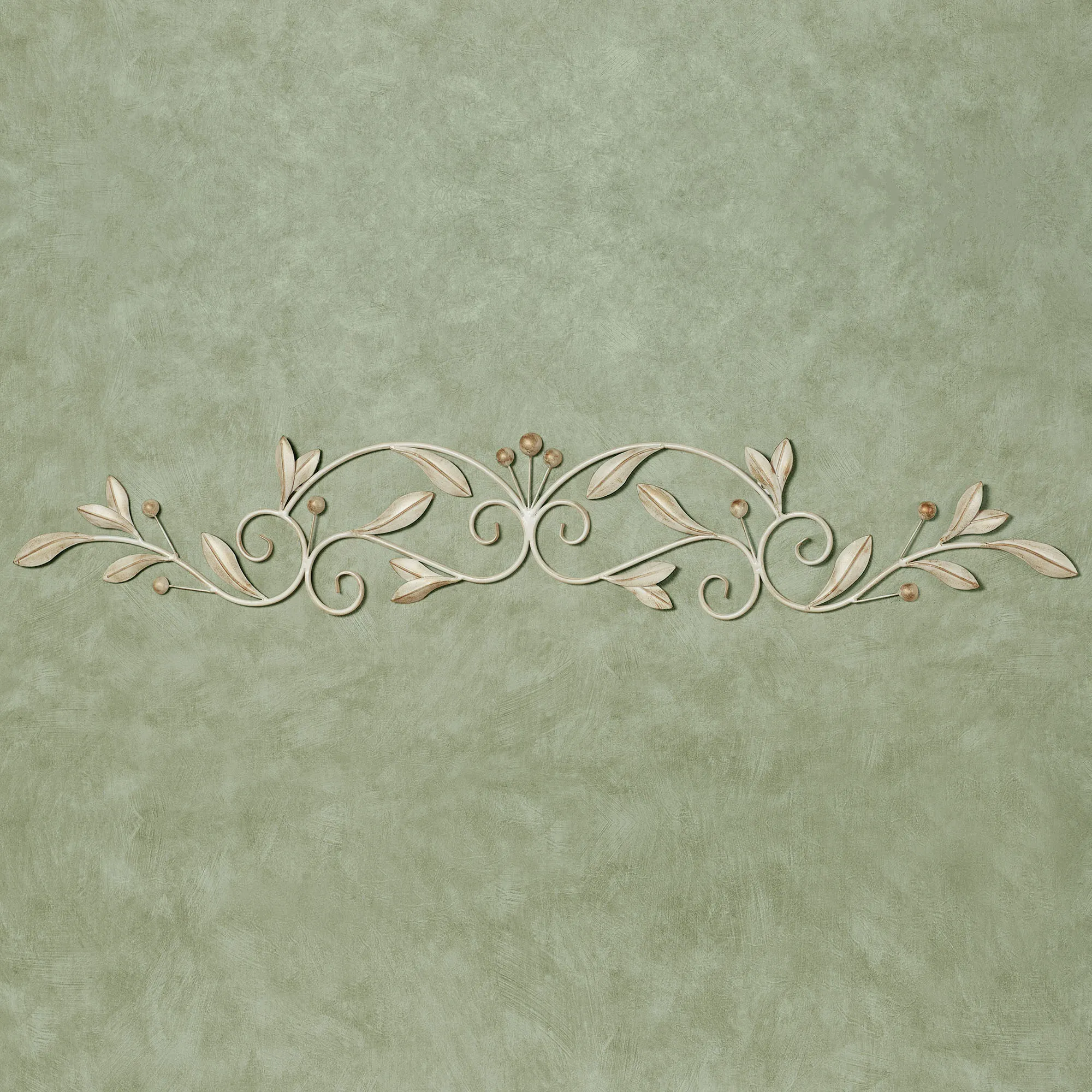 Olive branches, leaves, and berries decorate the Catarina Large Wall Topper with nature's splendor. This handcrafted metal wall topper is handpainted in ivory with brushed gold highlights. Measures 46"Wx8"H.