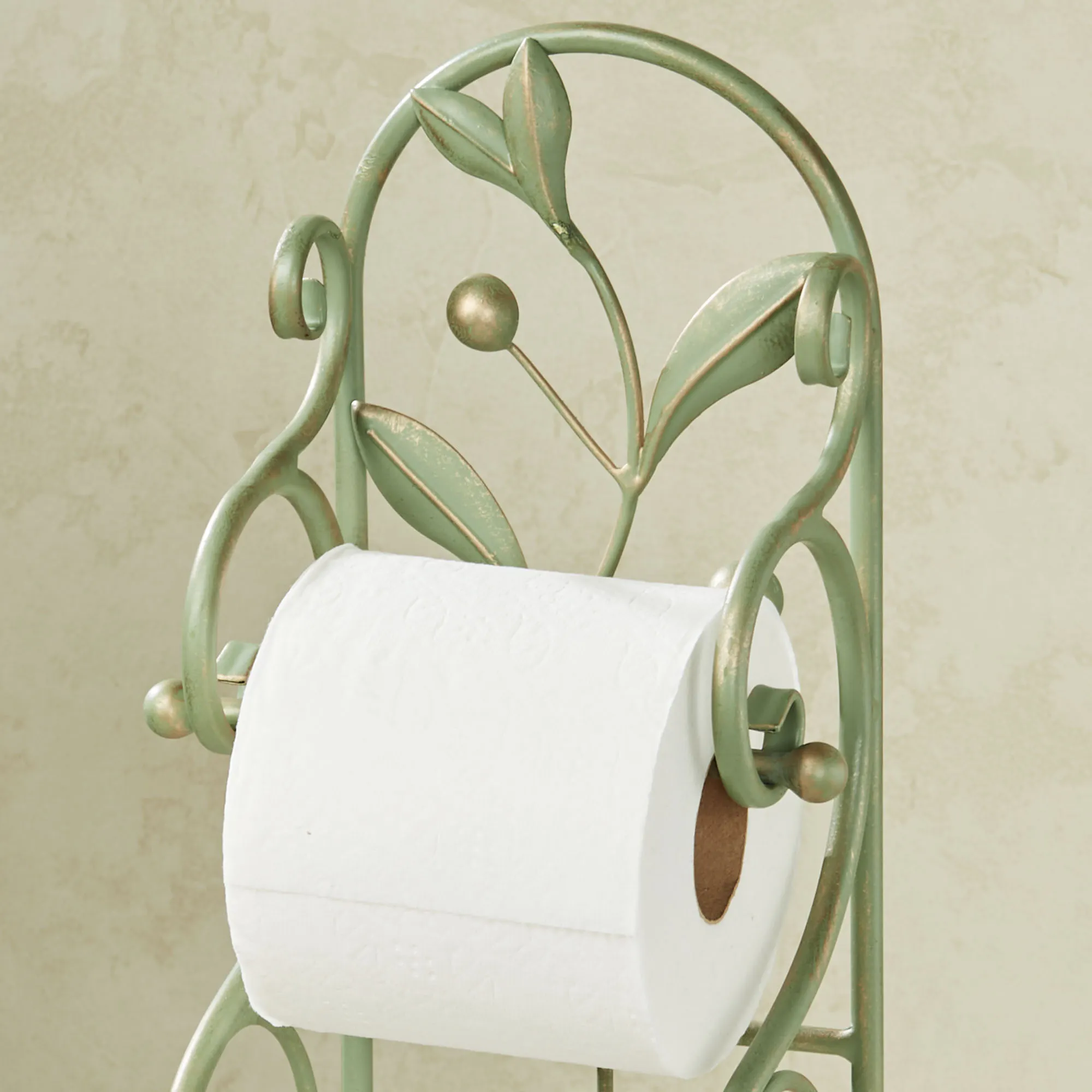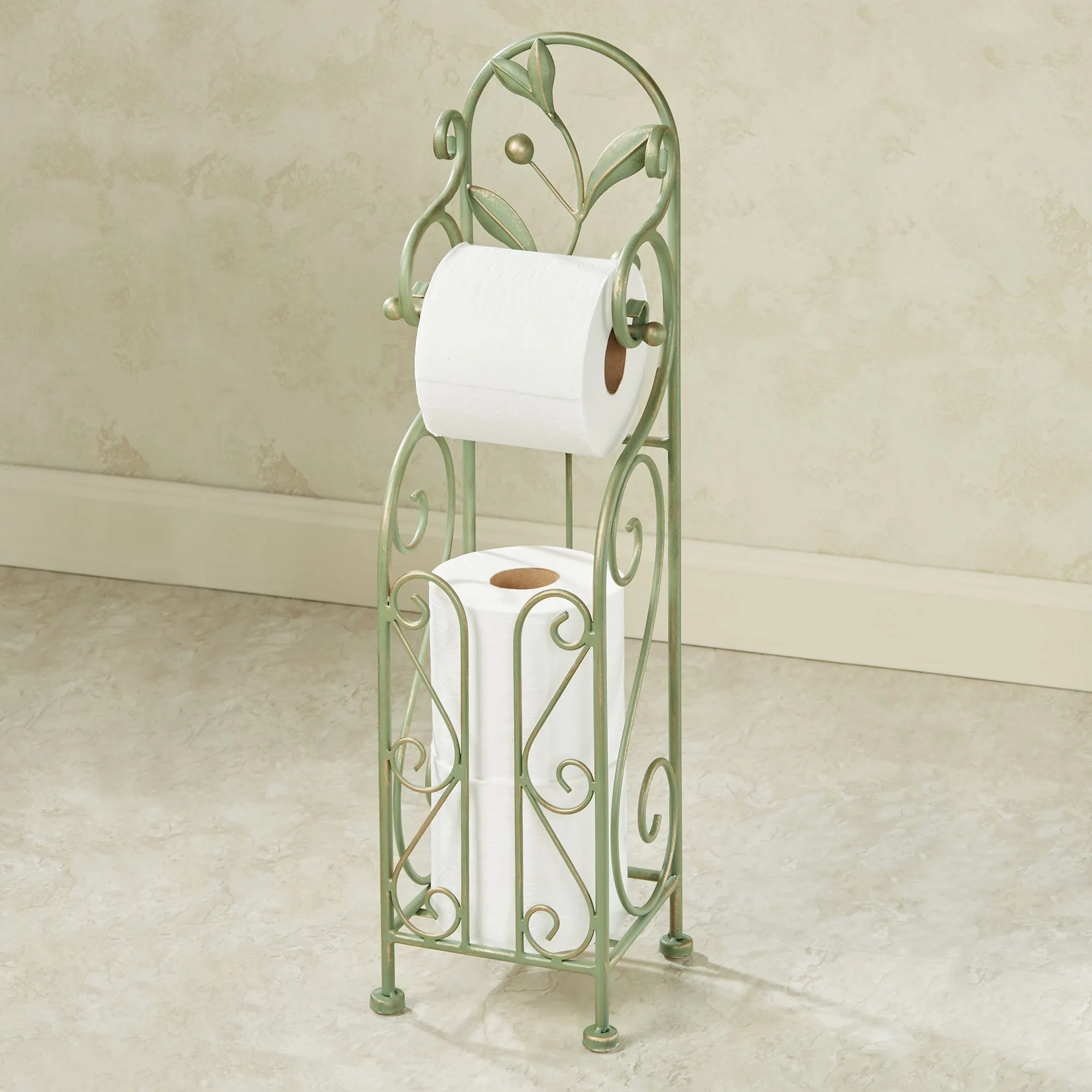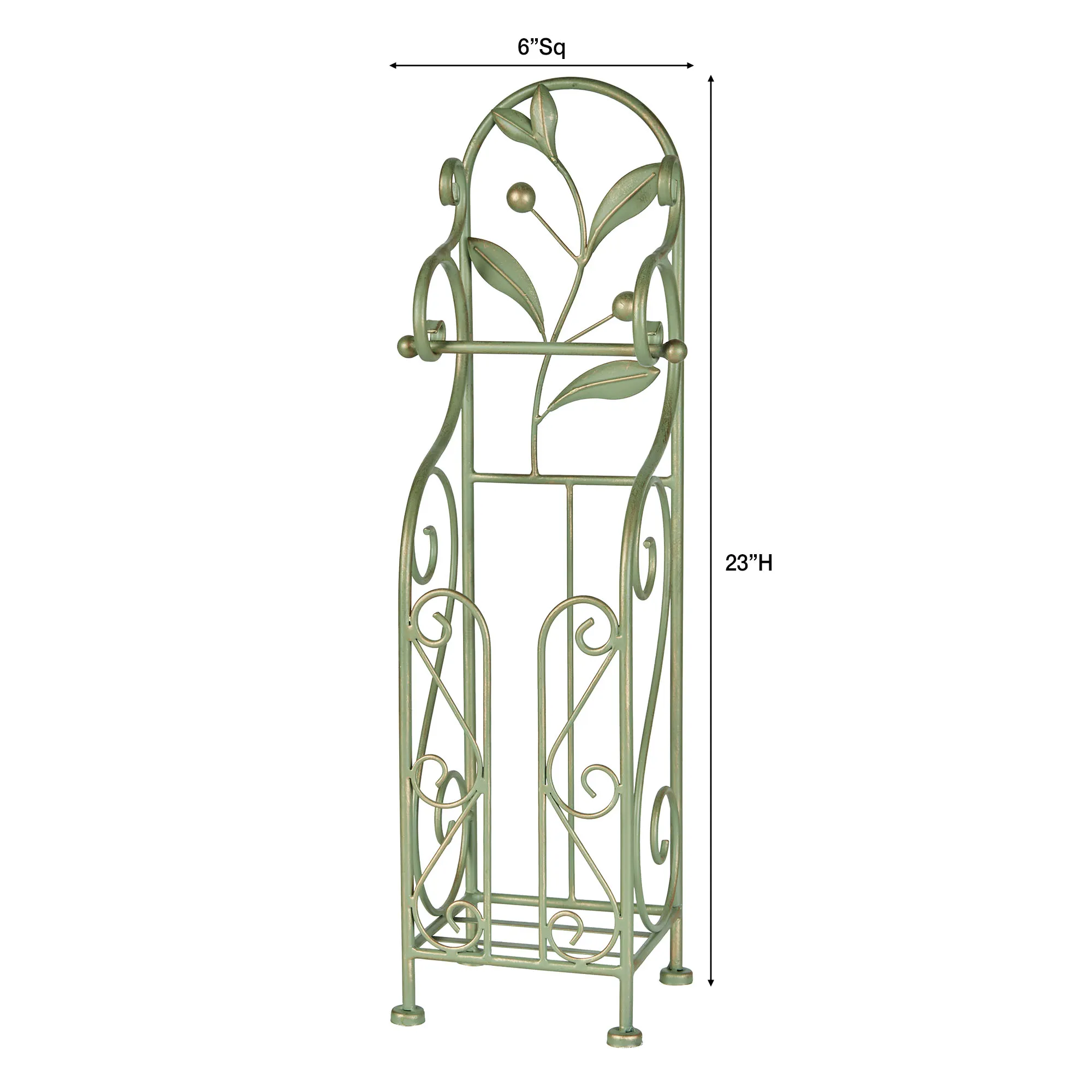 The Catarina Sage Toilet Paper Stand styles a space, while also ensuring you never run out of essentials. Crafted from metal and finished in sage with brushed gold highlights, the openwork design features scrollwork, olive leaves, and berries throughout the storage base and dispenser top. Two extra rolls will fit in the storage space beneath the removable rod, which will hold one jumbo roll. Overall, the toilet paper stand measures 6"sq.x23.5"H.