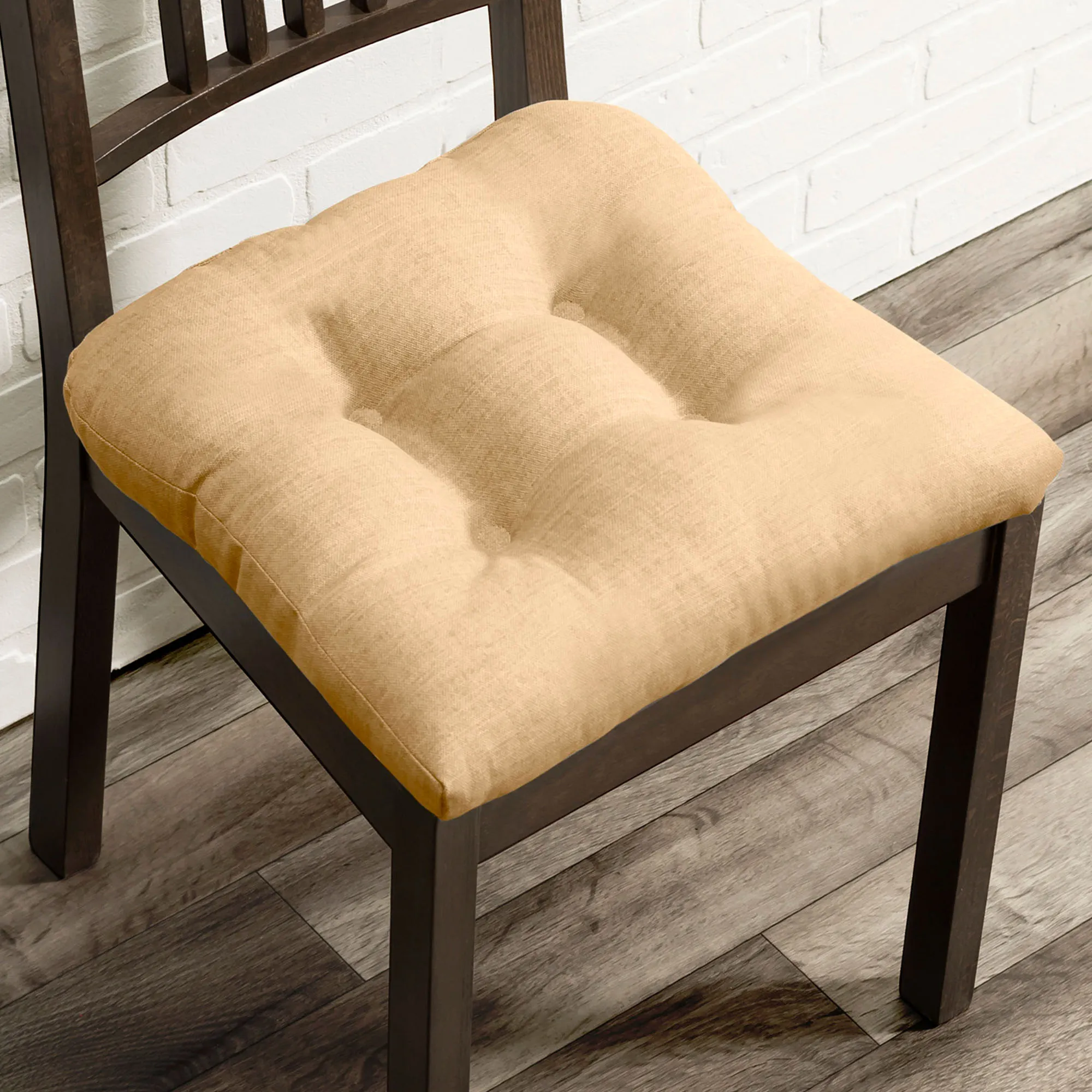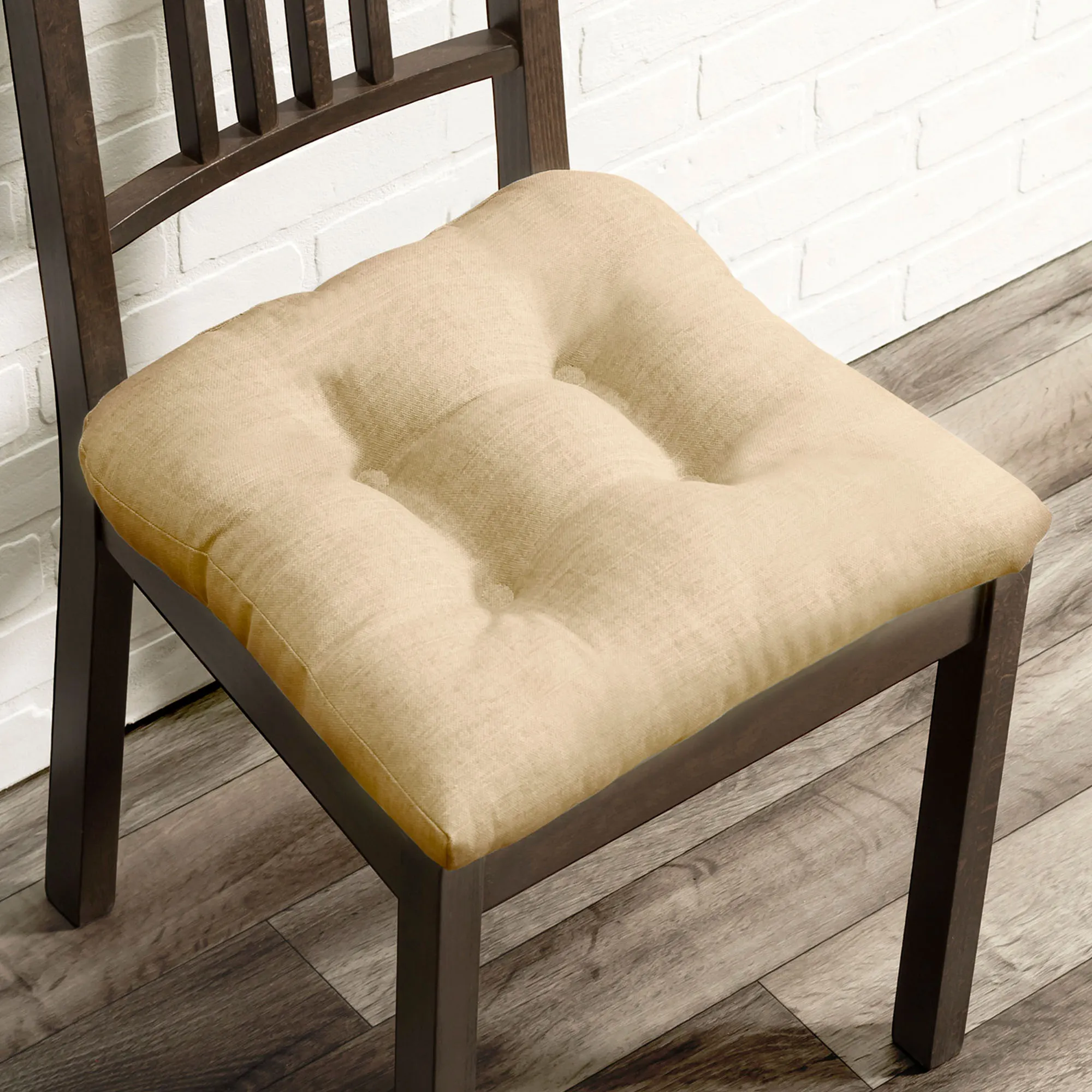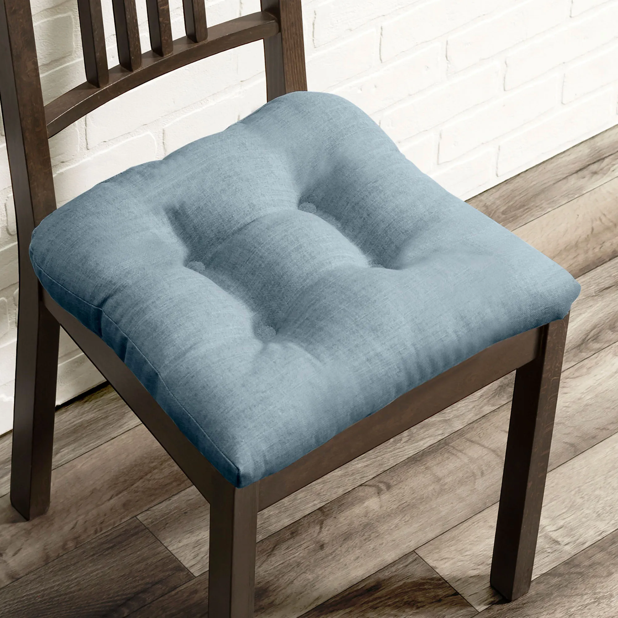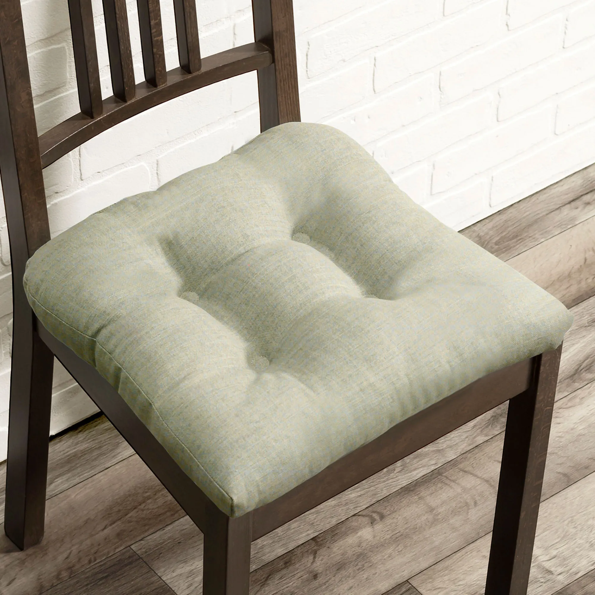 Complement your living space with the Catesby Chair Pad. Made in the USA, this woven chair cushion is a cotton/polyester blend. The tufted chair pad has a nonskid bottom and viscoelastic foam fill. Sold individually, each measures 16" sq. Spot clean.
