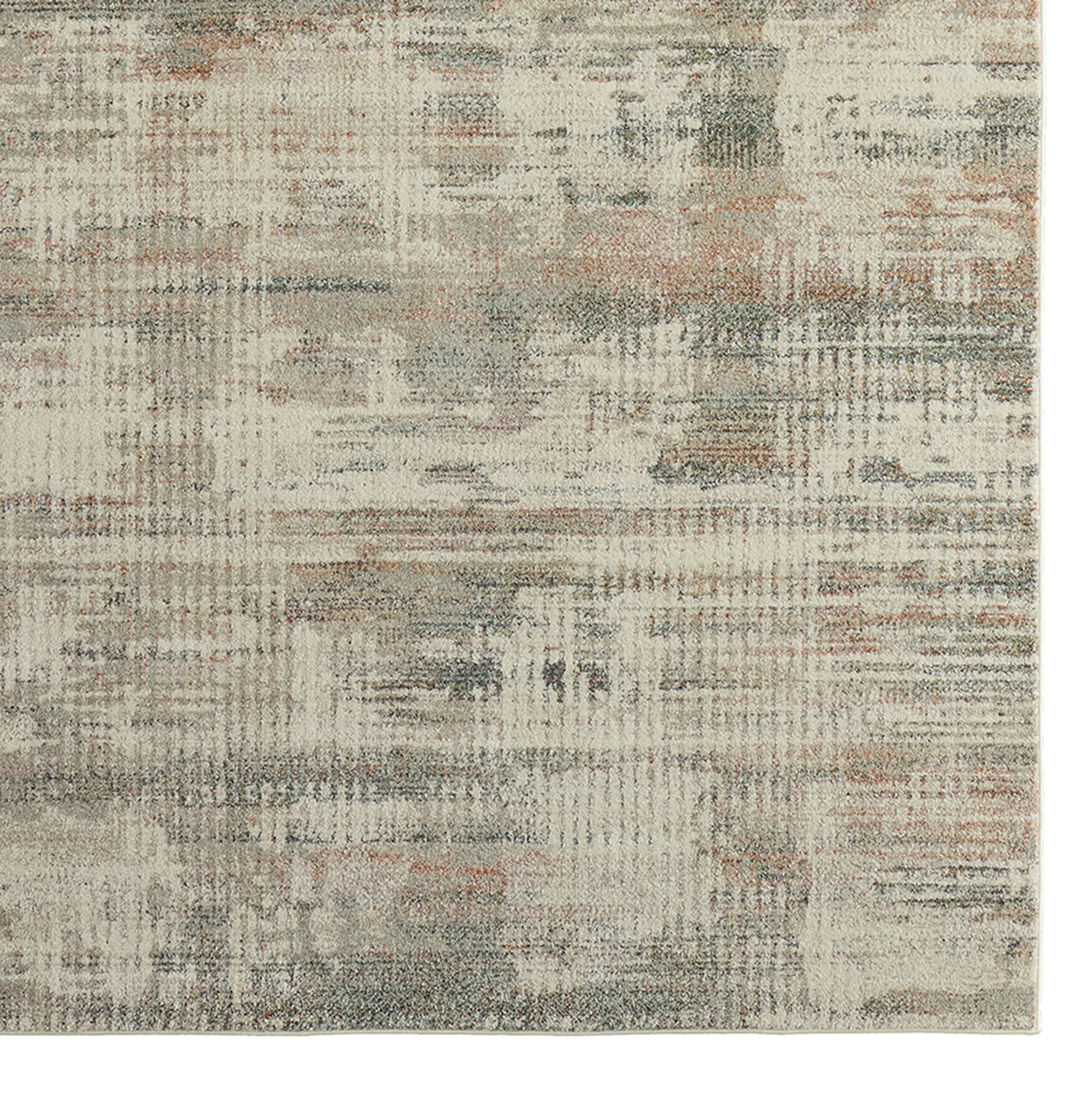 The linear geometric designs on the Cecil Rug have an abstract look with distressing. This power-loomed polypropylene area rug, .47" thick, has serged edges and includes shades of beige, taupe, red, green, and gray. We recommend professional cleaning by a rug cleaner. Imported.