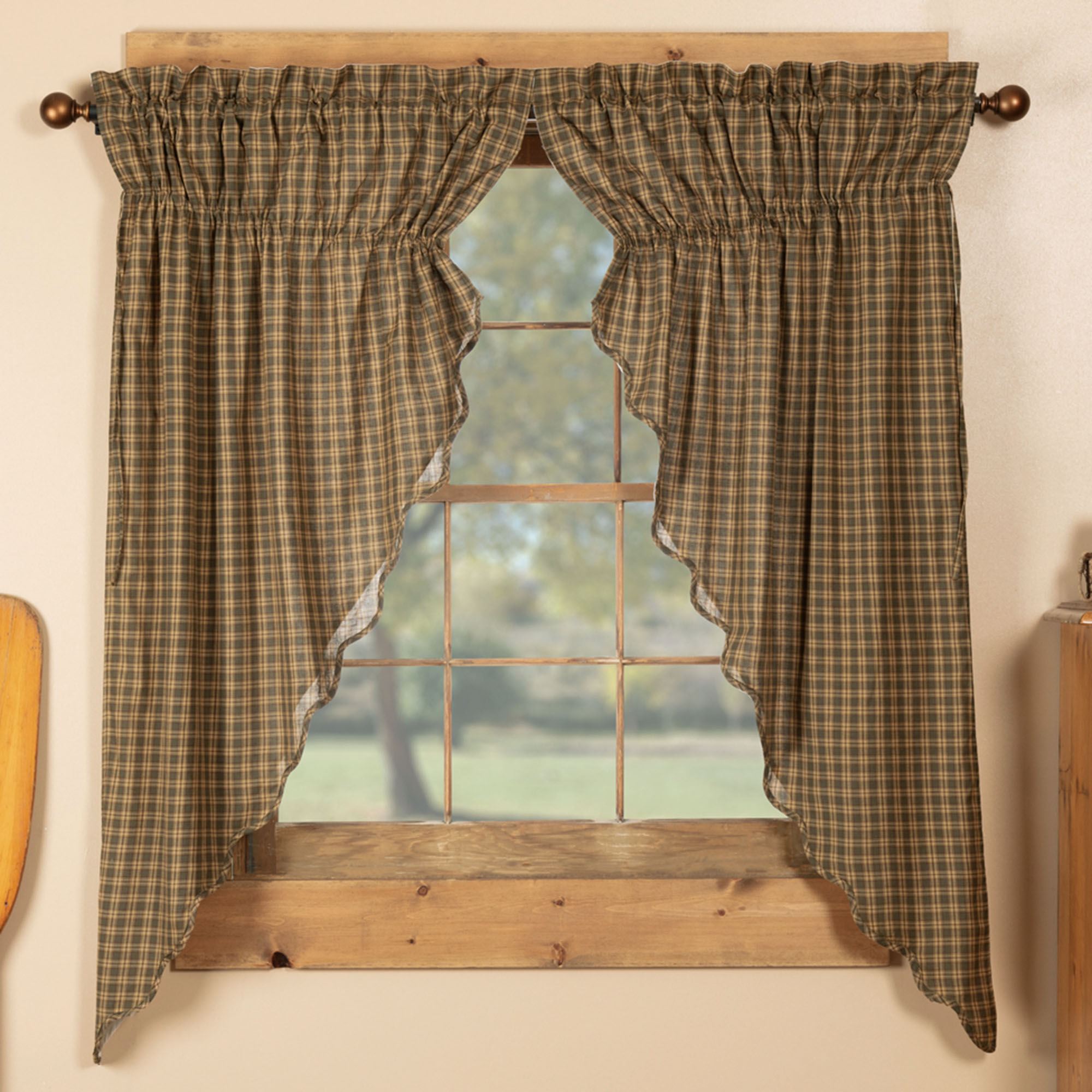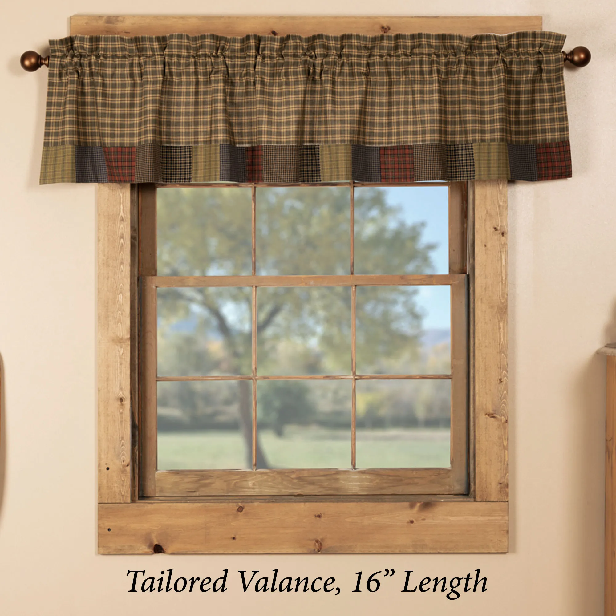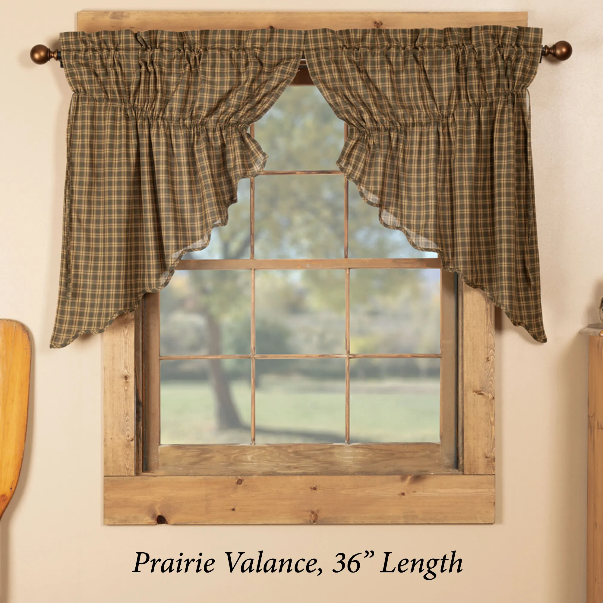 Lined Window Treatment is plaid. Tailored Curtain Pair is plaid with scalloped bottom edges and a 3" rod pocket. Tiebacks are included. Curtains are available in two sizes. Prairie Curtain Pair is plaid with scalloped inside edges and adjustable drawstring ties. Rod pocket is 3". Available in two lengths. Prairie Swag Valance Pair has scalloped inside edges, adjustable drawstring ties, and a 3" rod pocket. Tailored Valance has a bottom layer of pieced plaids and a 3.25" rod pocket. Available in two widths.