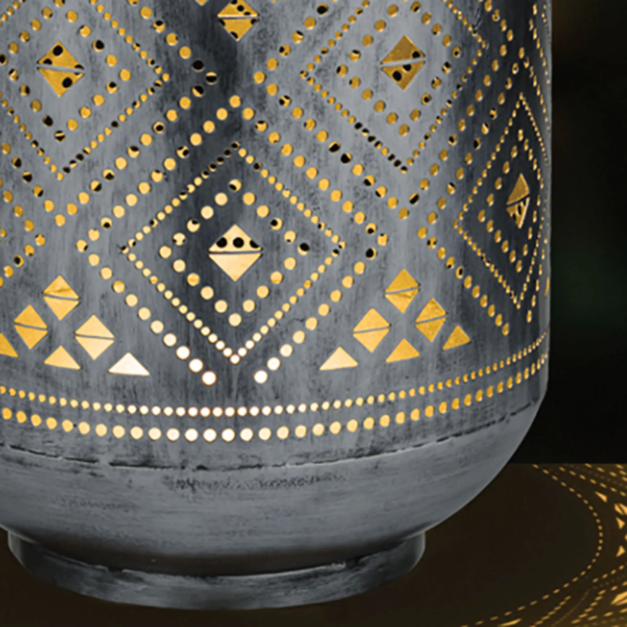 The Celestial Solar Shadow Lantern casts beautiful patterns into the nighttime. With a metallic antique silver finish, the unique curved metal lantern features openwork motifs and a highly reflective metallic gold interior. The built-in solar-powered LED light at the top then creates 360 degrees of beautiful projections across your tabletop surface or the ground for 6-8 continuous hours. Perfect for your patio, pool side, porch, or garden, the waterproof solar panels make the weather- and fade-resistant lantern a beautiful accent outdoors year round. Rechargeable battery is included. Overall, the solar lantern measures 9"dia.x25.5"H.