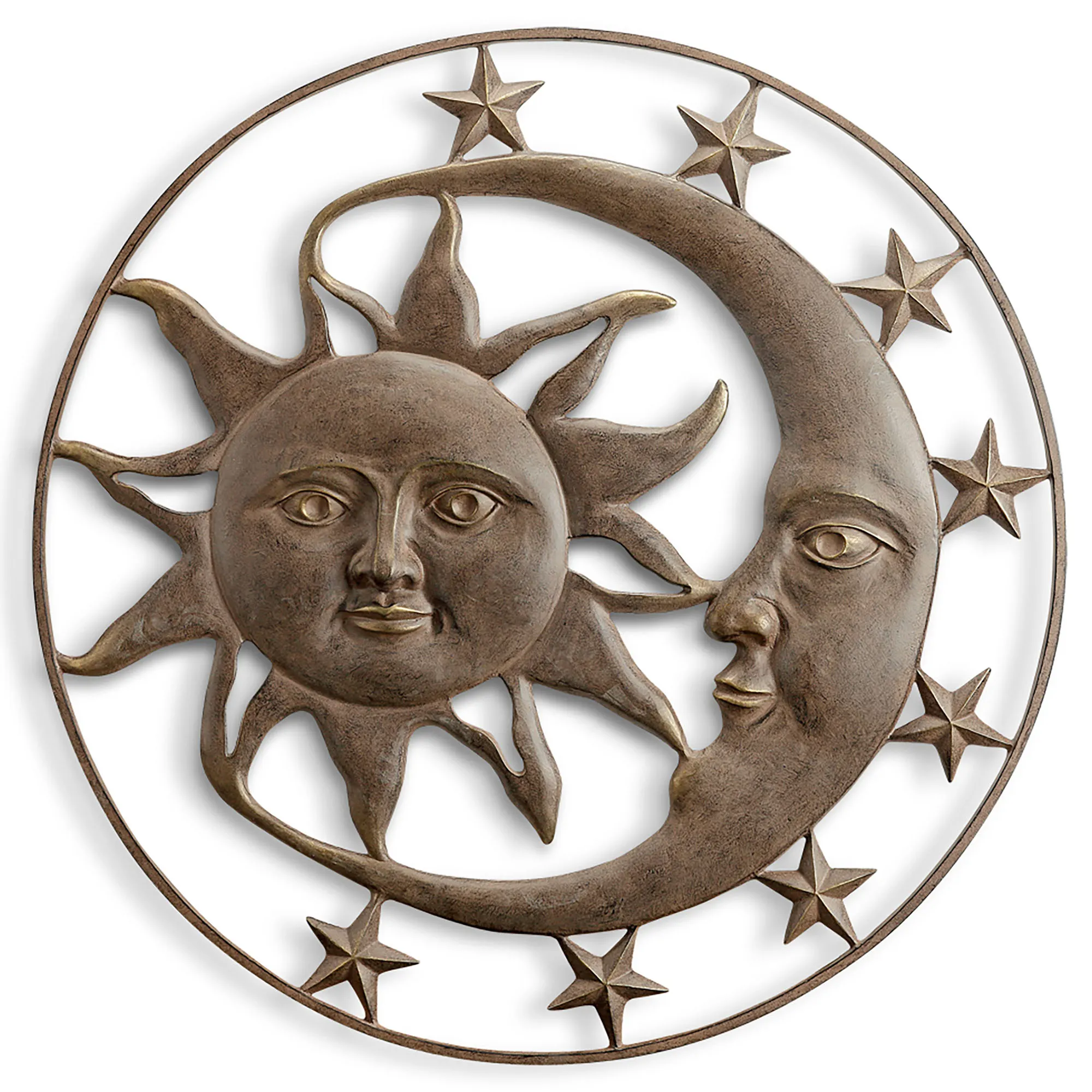 Display Celestial Splendor with the sun, moon, and stars. This openwork, hand-cast aluminum wall art sculpture has a hand-rubbed, rustic brown finish. Indoor or outdoor year-round use. Measures 35"dia.x.0.5"D.