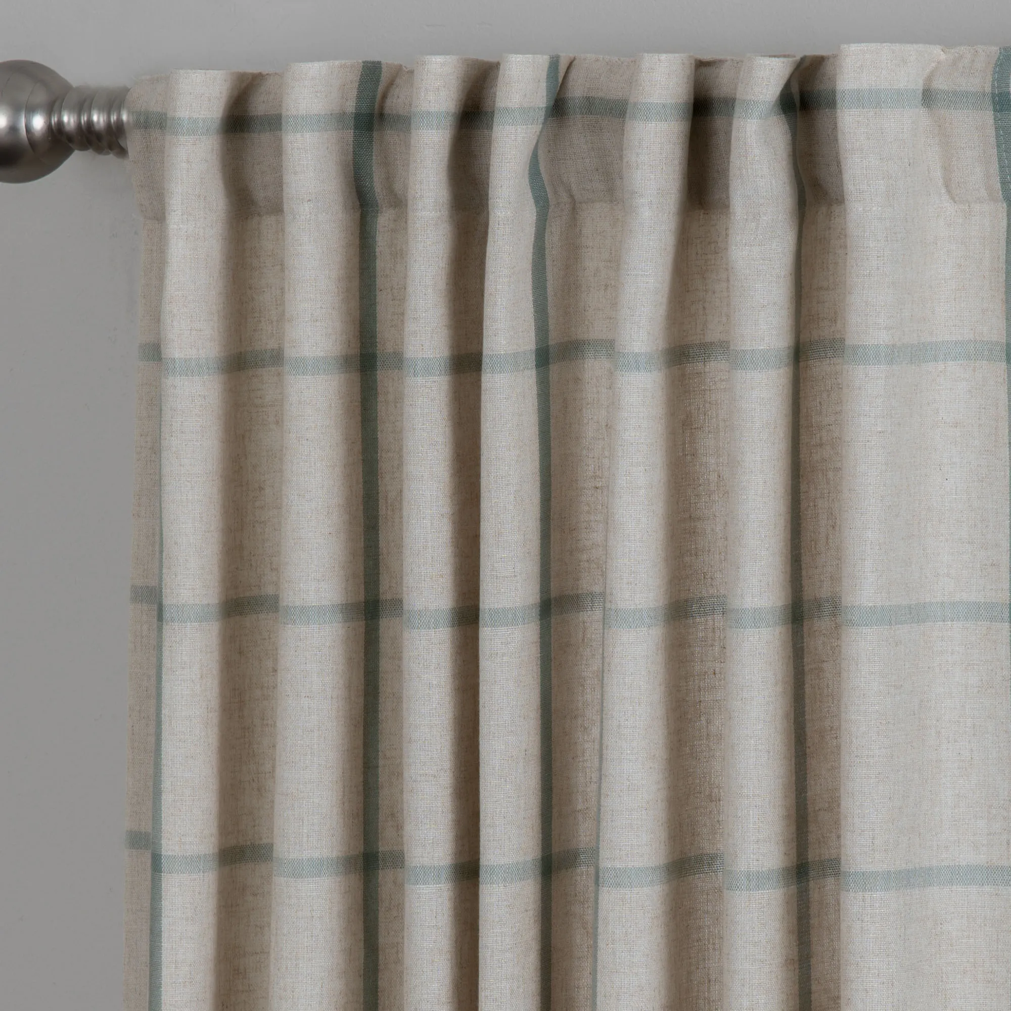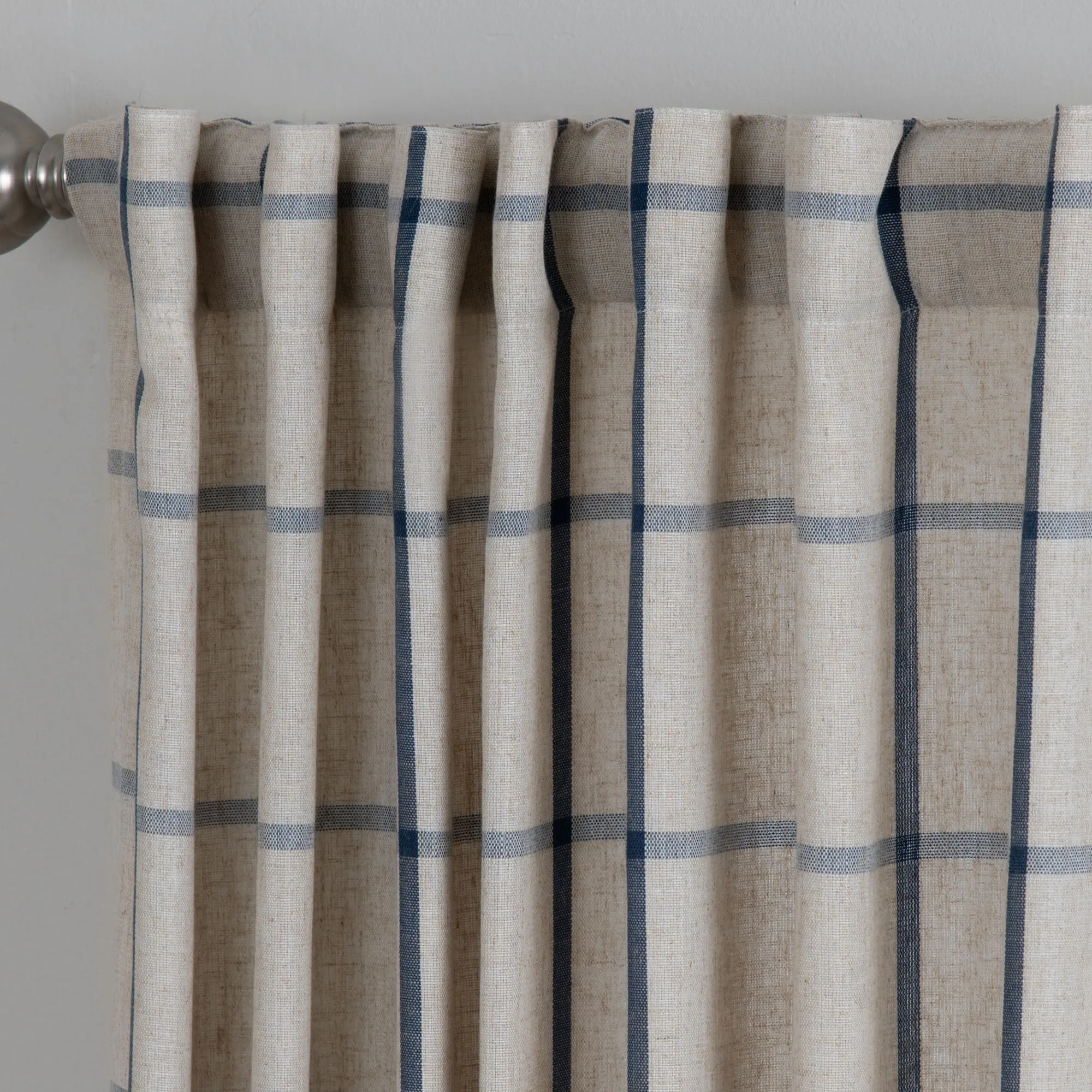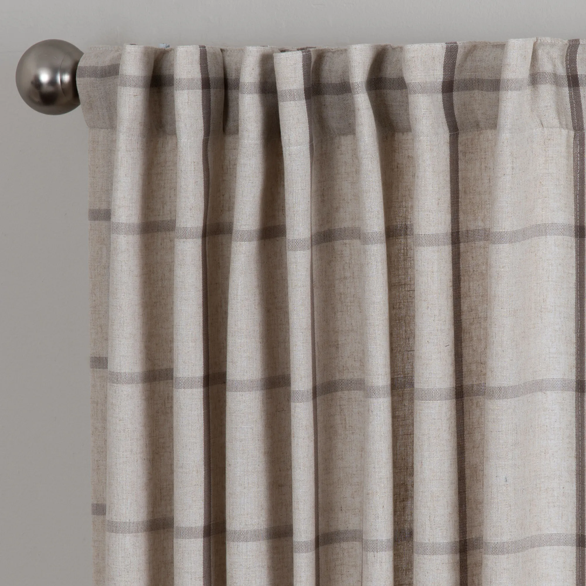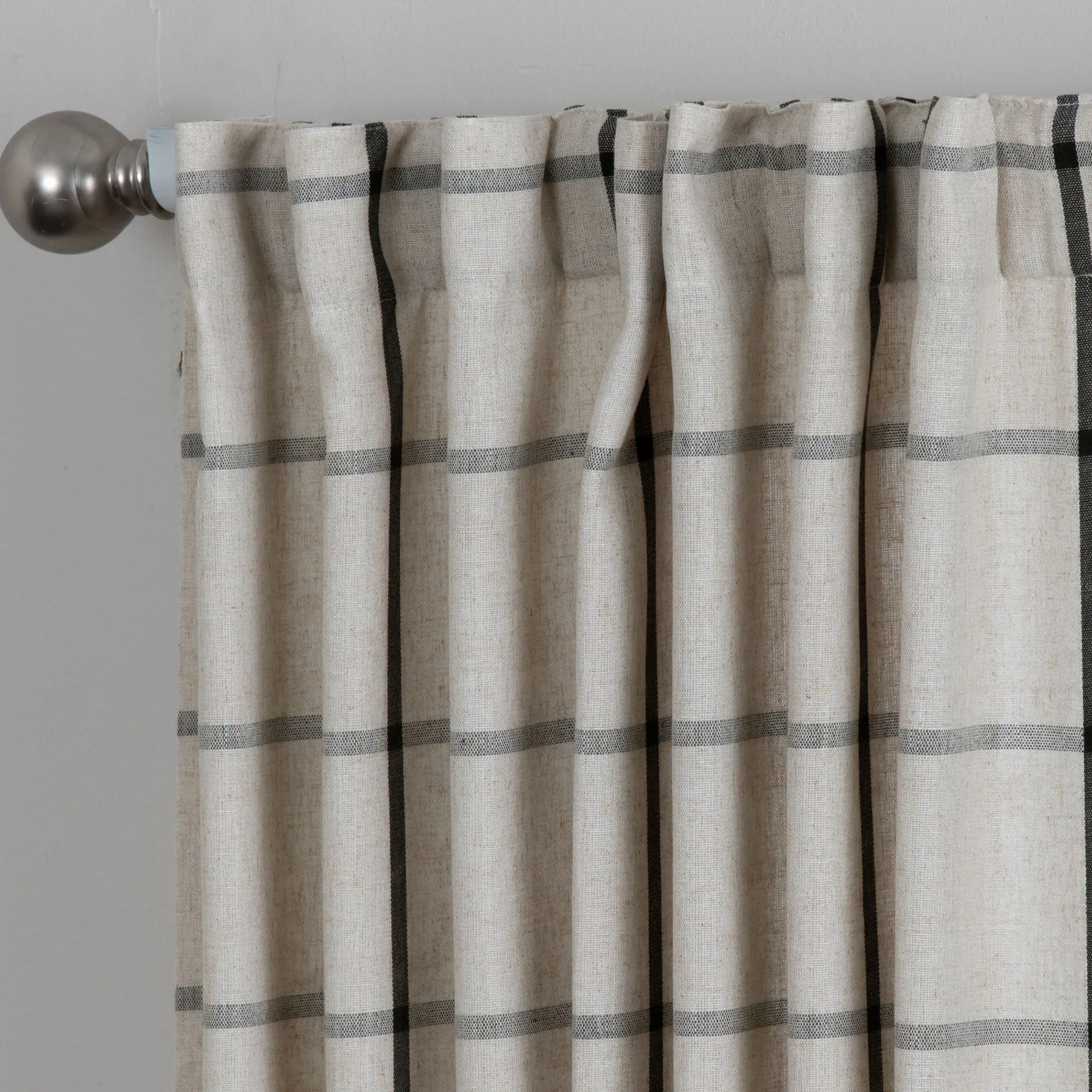 Complement your modern farmhouse with the windowpane plaid pattern on the Celina Curtain Panel. This light-filtering, polyester/linen window panel is fade-resistant and can be hung with the 3" back tabs or the 3" rod pocket. Sold individually, each ecru curtain panel is 52"W. Machine washable. Imported.