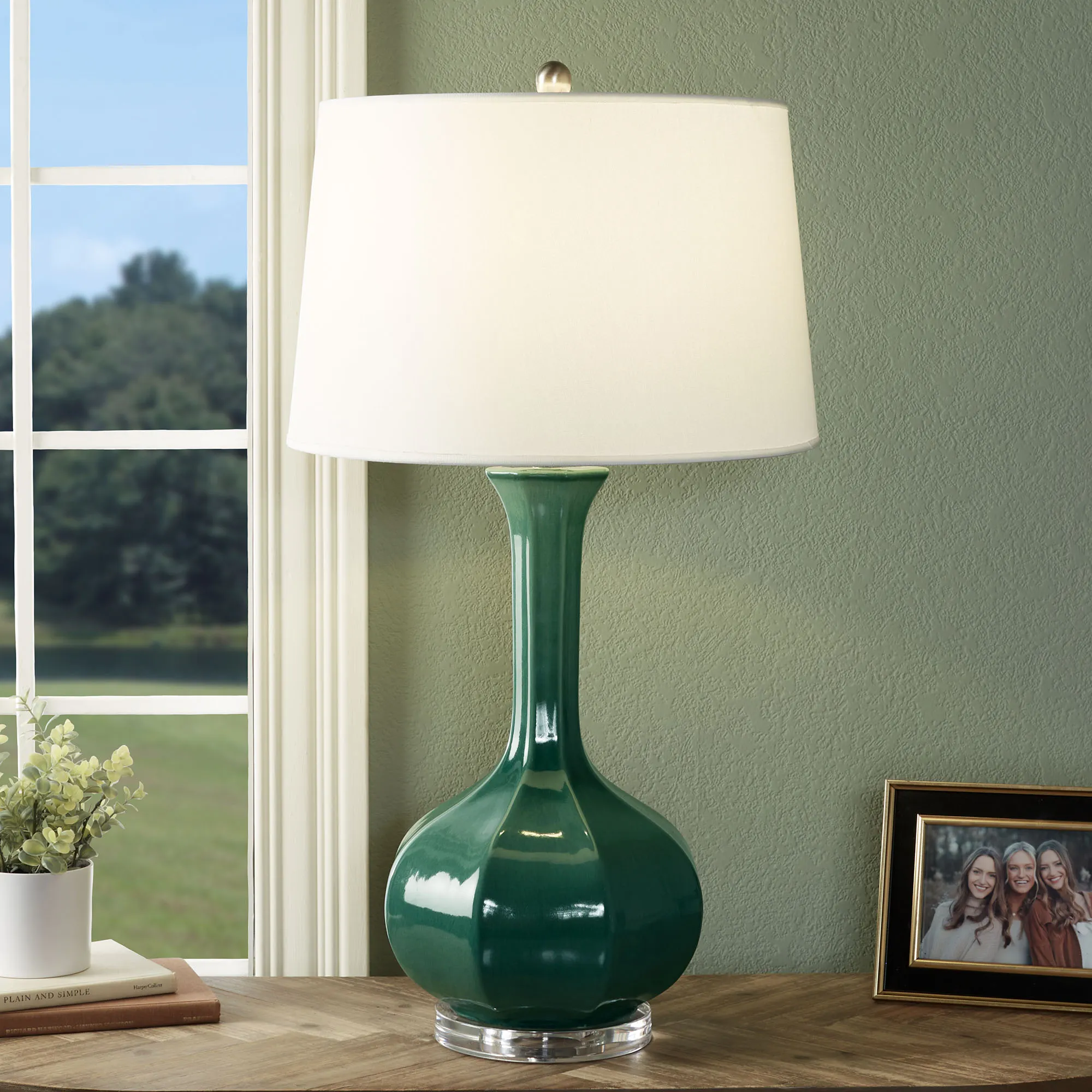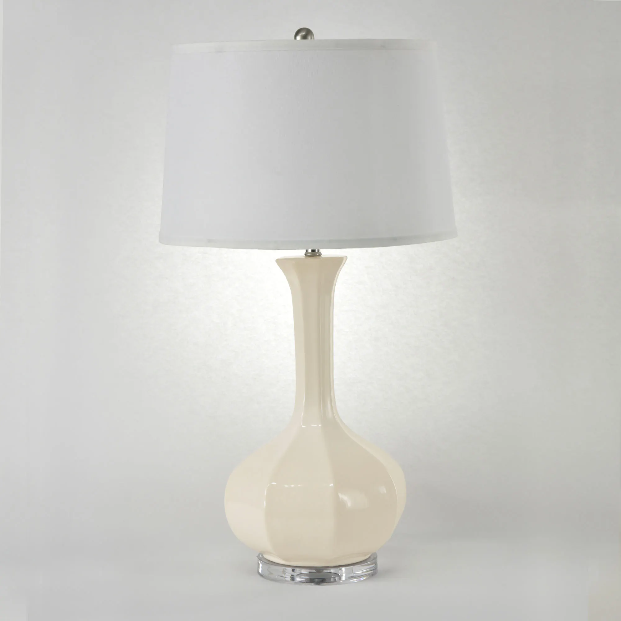 Classy and elegant describe the simple style of the Celina Table Lamp. Handcrafted from ceramic clay, this hand-finished, vase-style table lamp has a fluted design. The Eggshell, Green, and Navy colors have a crackle appearance. The fabric shade is white. UL listed. Requires one 100W max. bulb, not included. An optional clear acrylic mounting base adds sophistication. Overall, the table lamp measures 17"dia.x33"H, including the 2"H nickel ball finial and base.