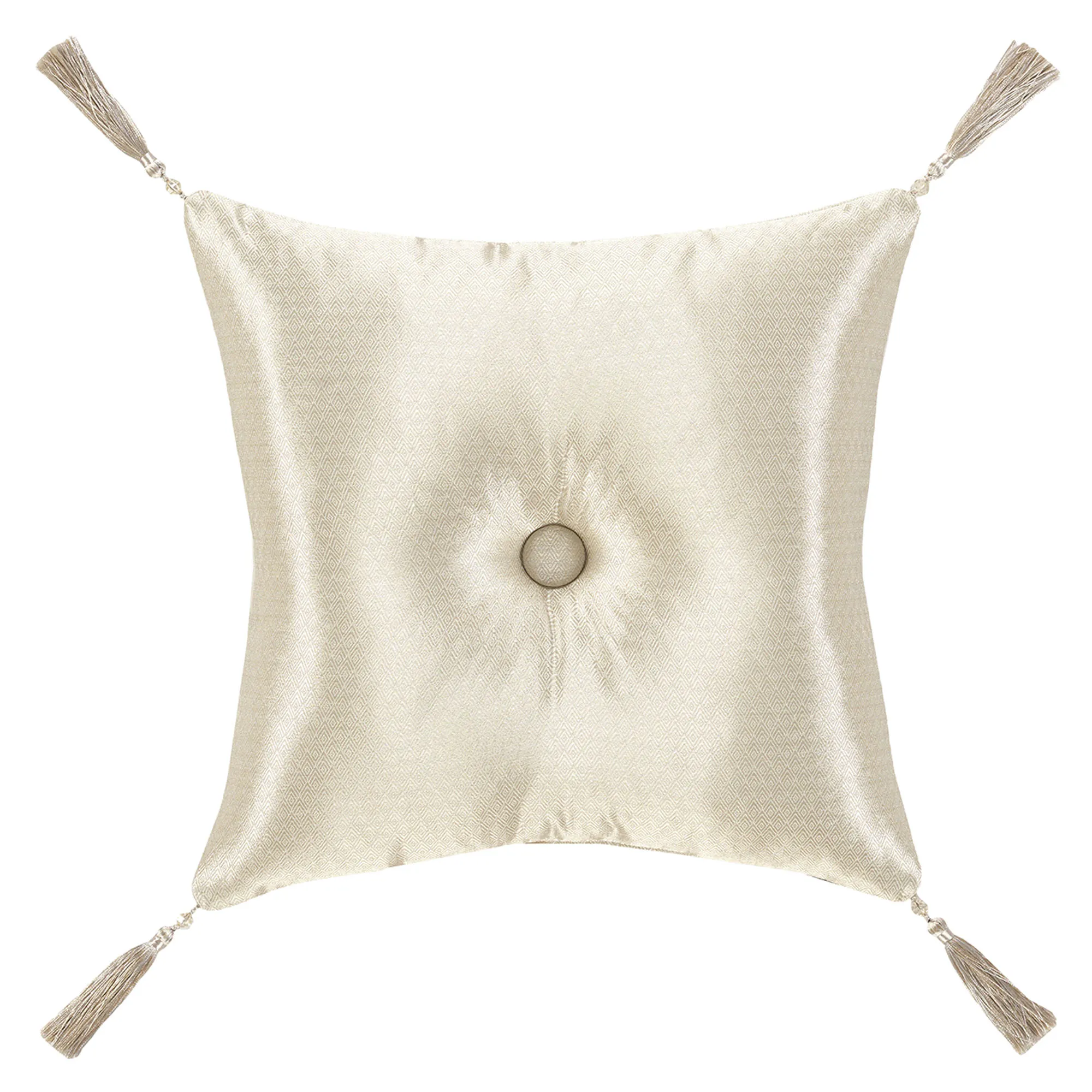 Pillows: Spot clean. The tailored, reversible 18" Square has a woven textured diamond design, a button tuft in the center, and corner tassels. The piped 20" Square has puff damask and reverses to woven textured diamond designs. The reversible, handmade Round is textured mingled ivory and champagne with pleats; pillow has a button tuft and a 3" side gusset. Rectangle has woven textured diamond designs and reverses to textured mingled ivory and champagne.