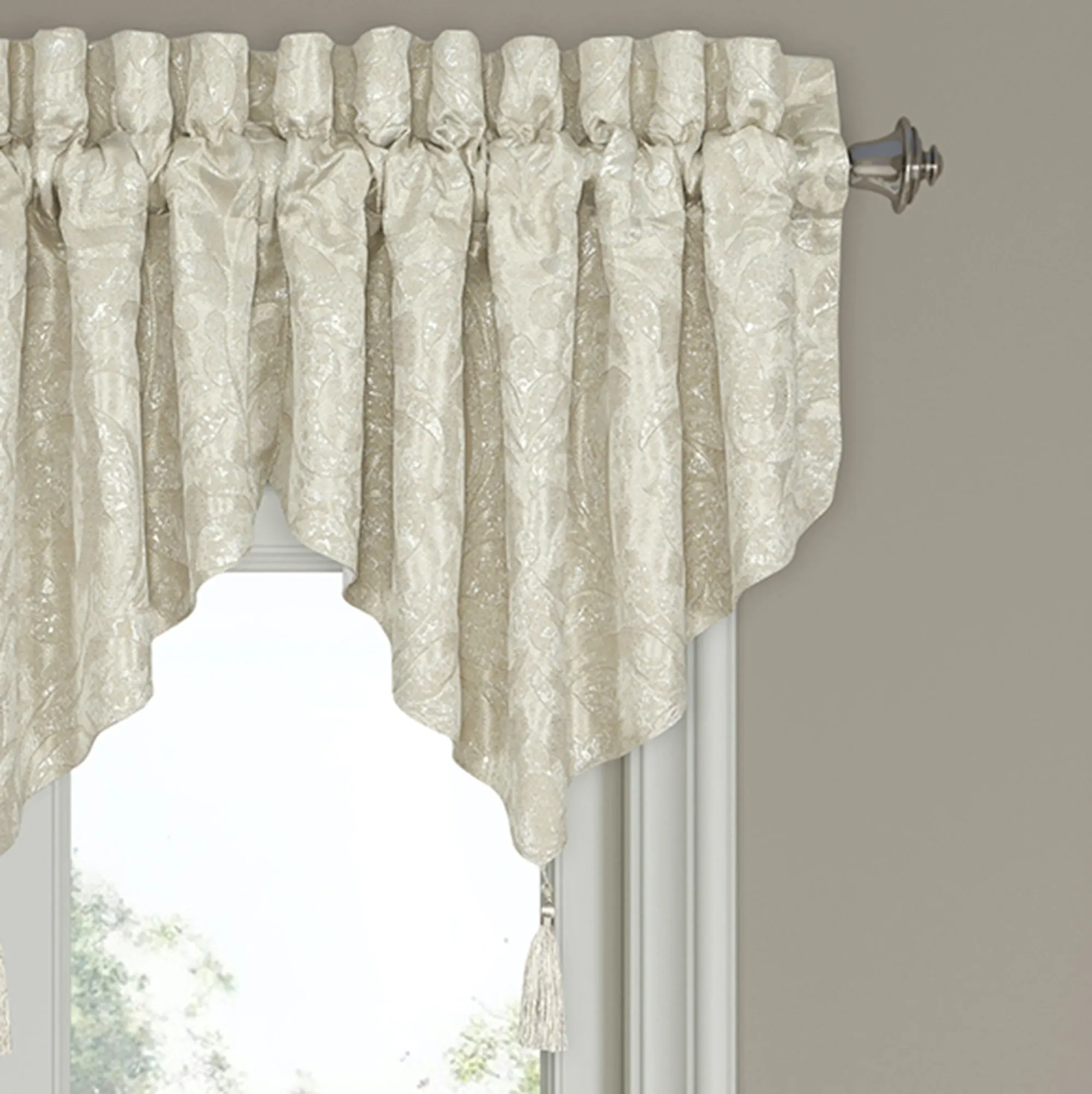 Lined Window Treatment has puff damask designs. The tailored Wide Curtain Pair includes tiebacks and has a 3" rod pocket. Each Ascot Valance has a tassel on the point and a 3.25" rod pocket.