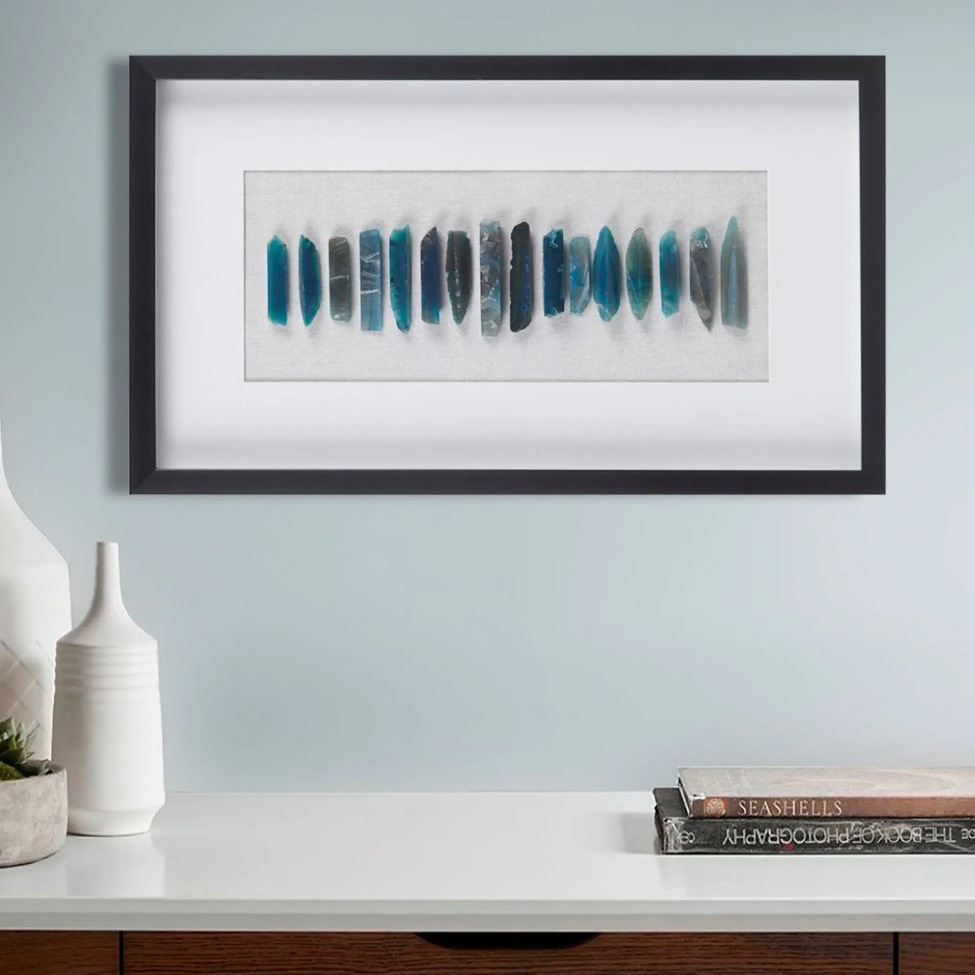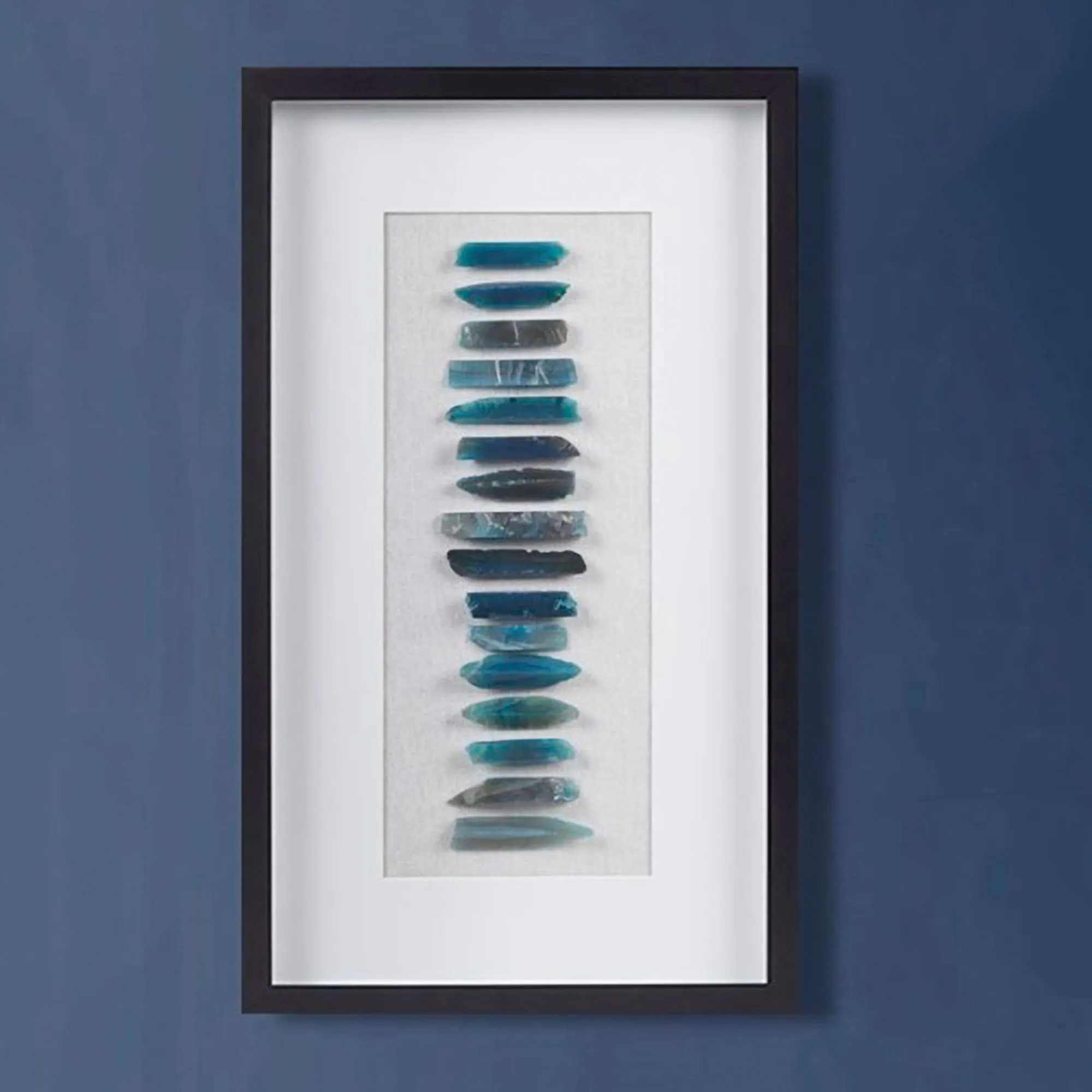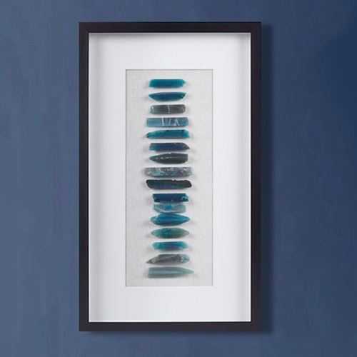 Embrace the natural charm and gallery style of the Cerulean Agate Wall Art. Designed by Martha Stewart, the framed shadow box wall art features protective glass, a black polystyrene frame, and a soft white matte background. Genuine agate stones, filled with cool tones of blue and indigo, are uniquely cut and placed in a simple line, highlighting their dynamic natural beauty. Due to the natural properties of each agate stone, each wall art panel will be unique and vary in shape and color. Artwork hangs vertically or horizontally. Overall, the framed wall art measures 14"Wx1.5"Dx24"H.