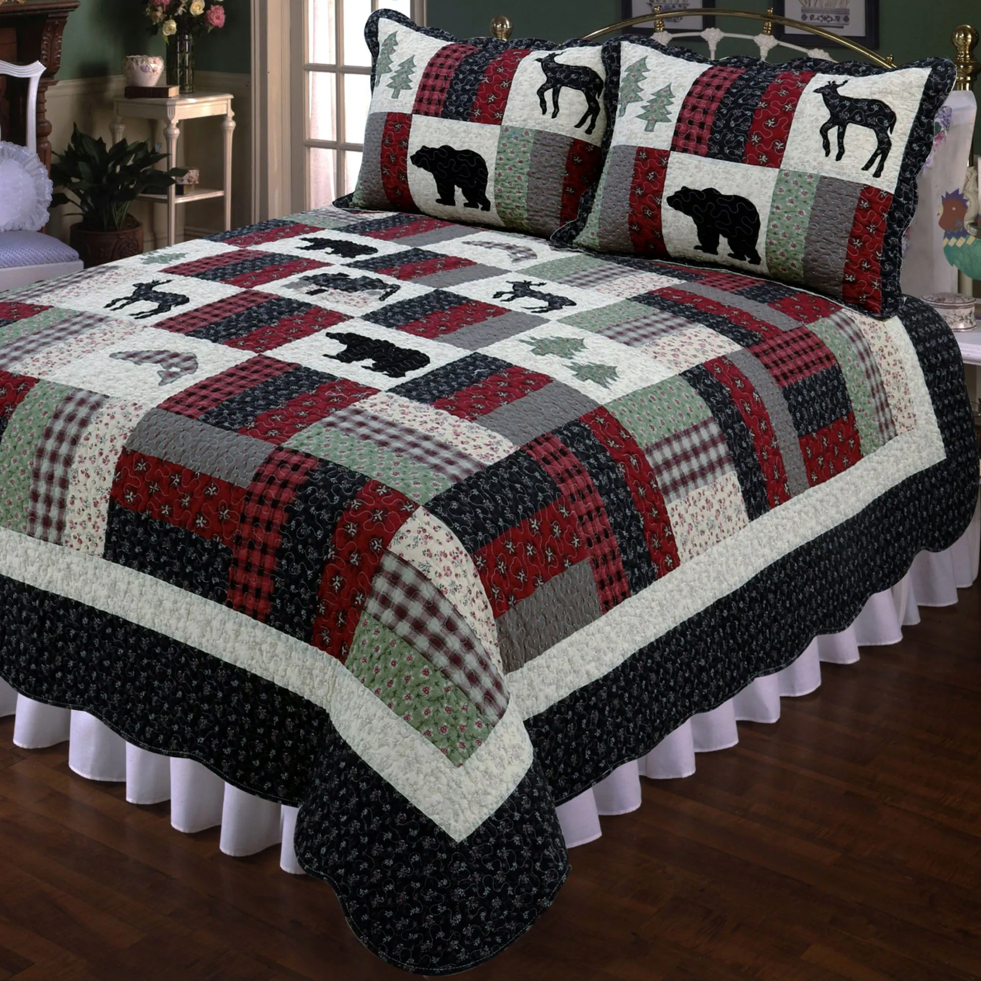 Take in the natural beauty surrounding the Chalet Village with this handcrafted quilt. Crafted from pure cotton, the patchwork quilt features blocks of florals, plaids, fish, bears, deer, pine trees, and a cabin for a homespun rustic appeal. Rich shades of burgundy, green, gray, beige, cream, ivory, black, and purple add detailing throughout the quilt. Scalloped bound edges add further charm. Quilt has vermicelli quilting and is backed in a cream and beige floral print. Fill is cotton. Machine washable. Imported.