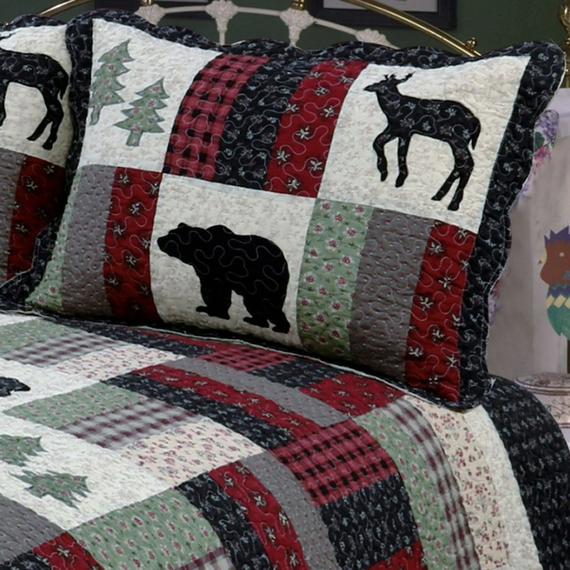 • Patchwork quilt features wildlife, trees, plaids, and florals
