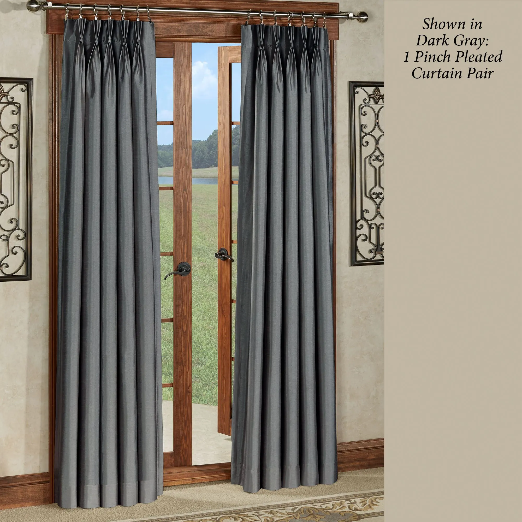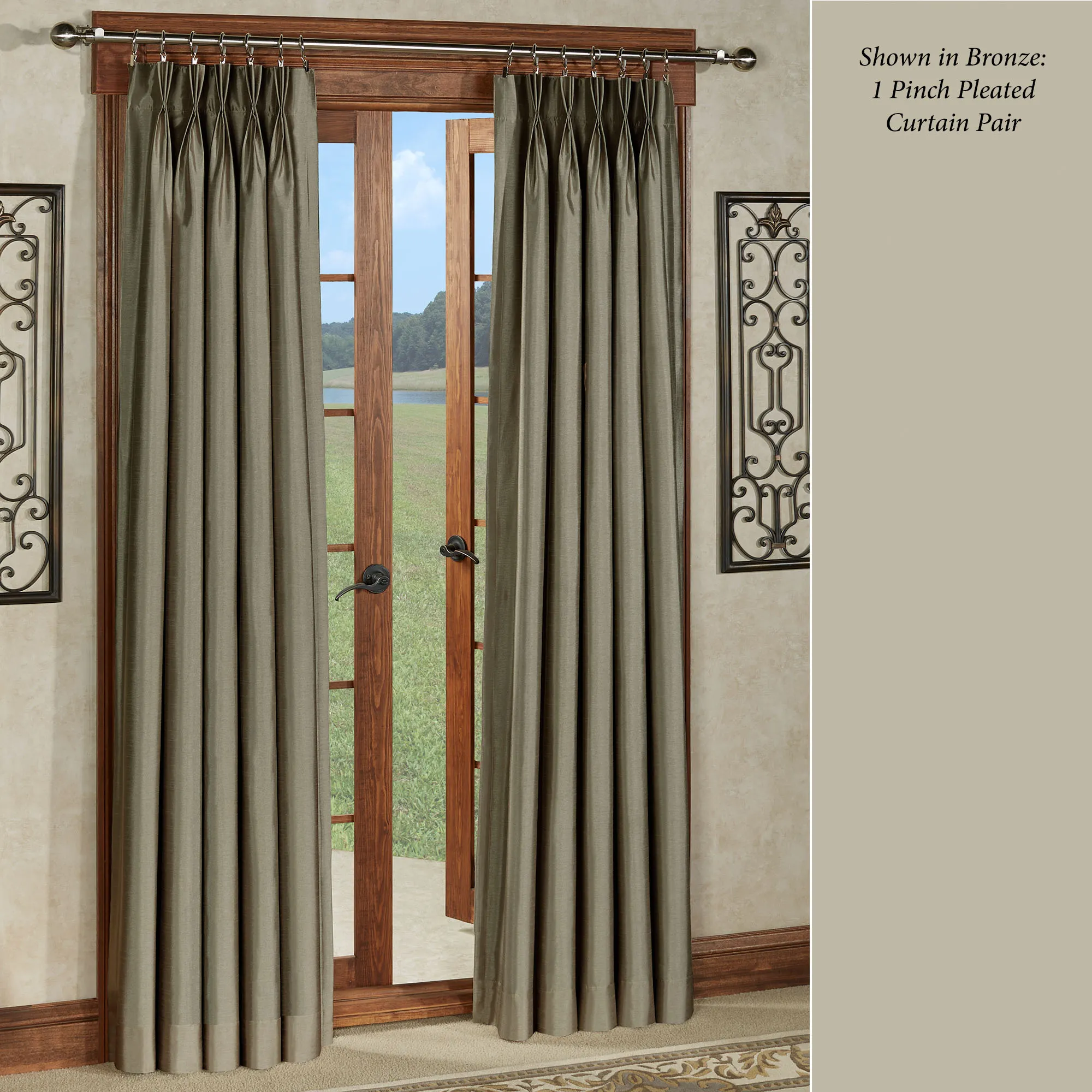 The Chamberlain Curtain Pair complements any window with a classy faux silk look. These pinch-pleat, solid color polyester curtains are woven with a layered design that sandwiches black yarns between a tight weave of colored yarns to darken a room and reduce noise. This lined, energy-efficient window treatment can be hung with the hidden 3" back tabs or your drapery pins or clip rings. Click on the Details tab for more information regarding the hanging requirements. Choose Pinch-Pleat Curtain Pair or Wide Pinch-Pleat Curtain Pair. Machine washable. Imported. The curtain pair width is the total width of two panels together.