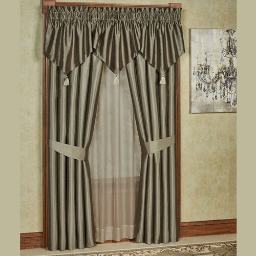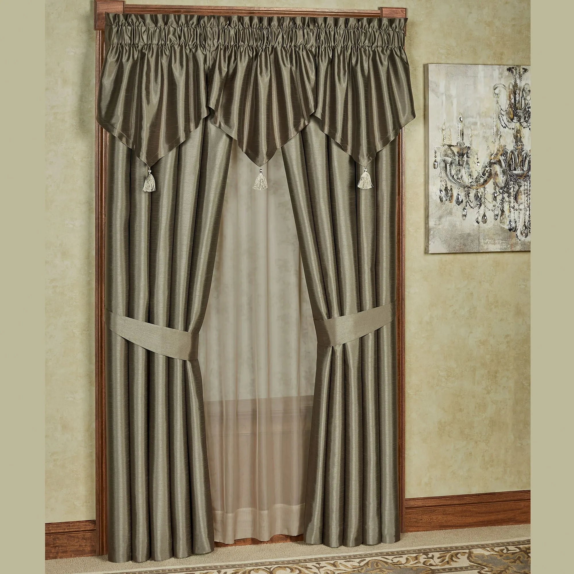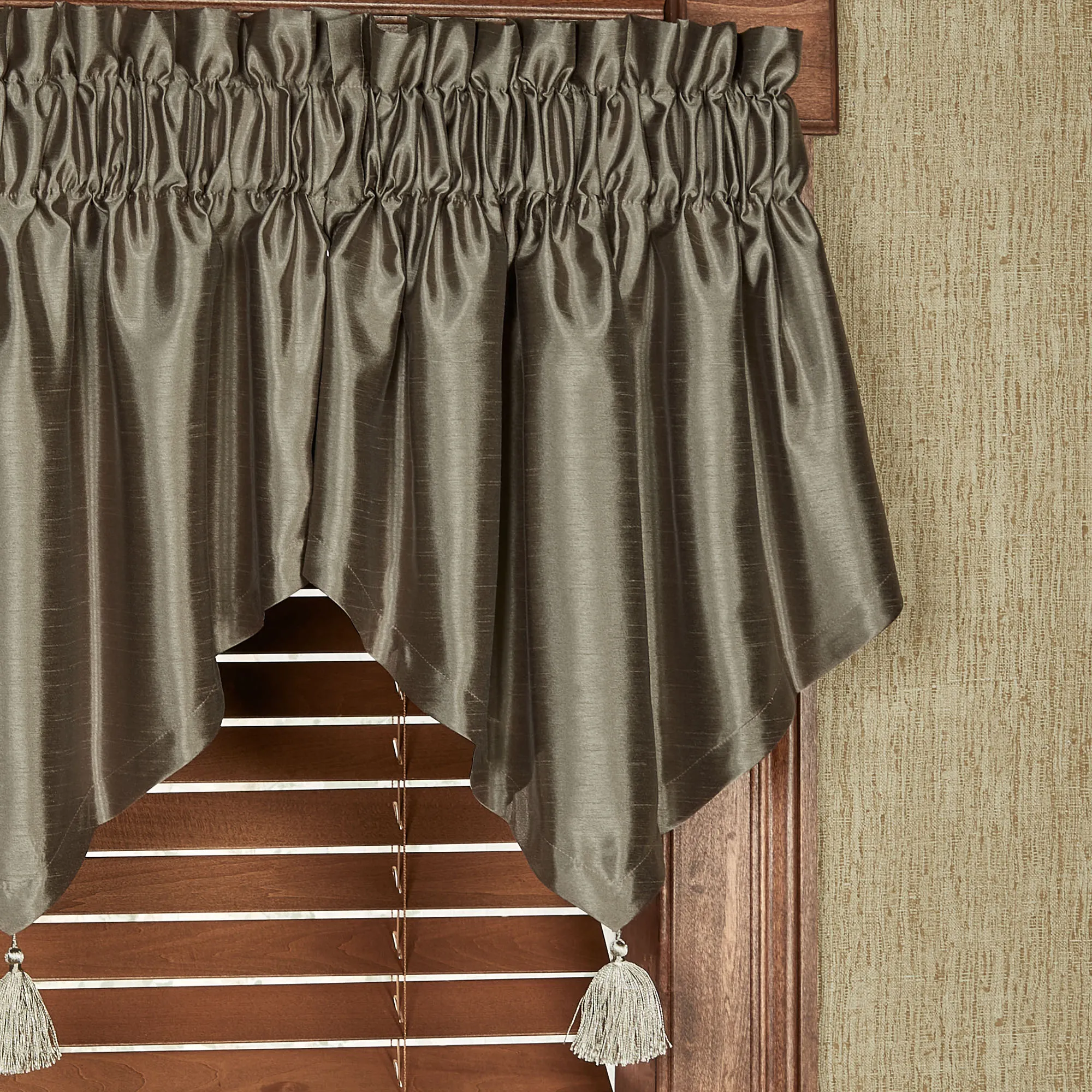 Sophisticated styling is easy with the luxurious sheen and rich look of the Chamberly Window Treatment. Made of polyester faux silk, this solid color window treatment is woven with a layered design that sandwiches black yarns between a tight weave of colored yarns to darken rooms and reduce noise. Lined, energy-saving window treatment has a 3" rod pocket. Specify Ascot Valance, 32"Wx22"L; or Wide Curtain Pair, 100"W. Each Ascot Valance has a tassel accent. Wide Curtains include tiebacks. Machine washable. Imported. The curtain pair width is the total width of two panels together.