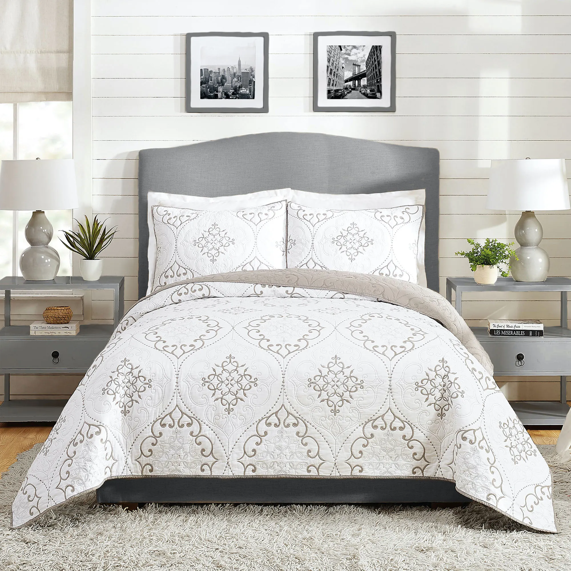 Modern Heirloom Chambers White and Gray Embroidered Scroll Medallion Mini Quilt Set Bedding