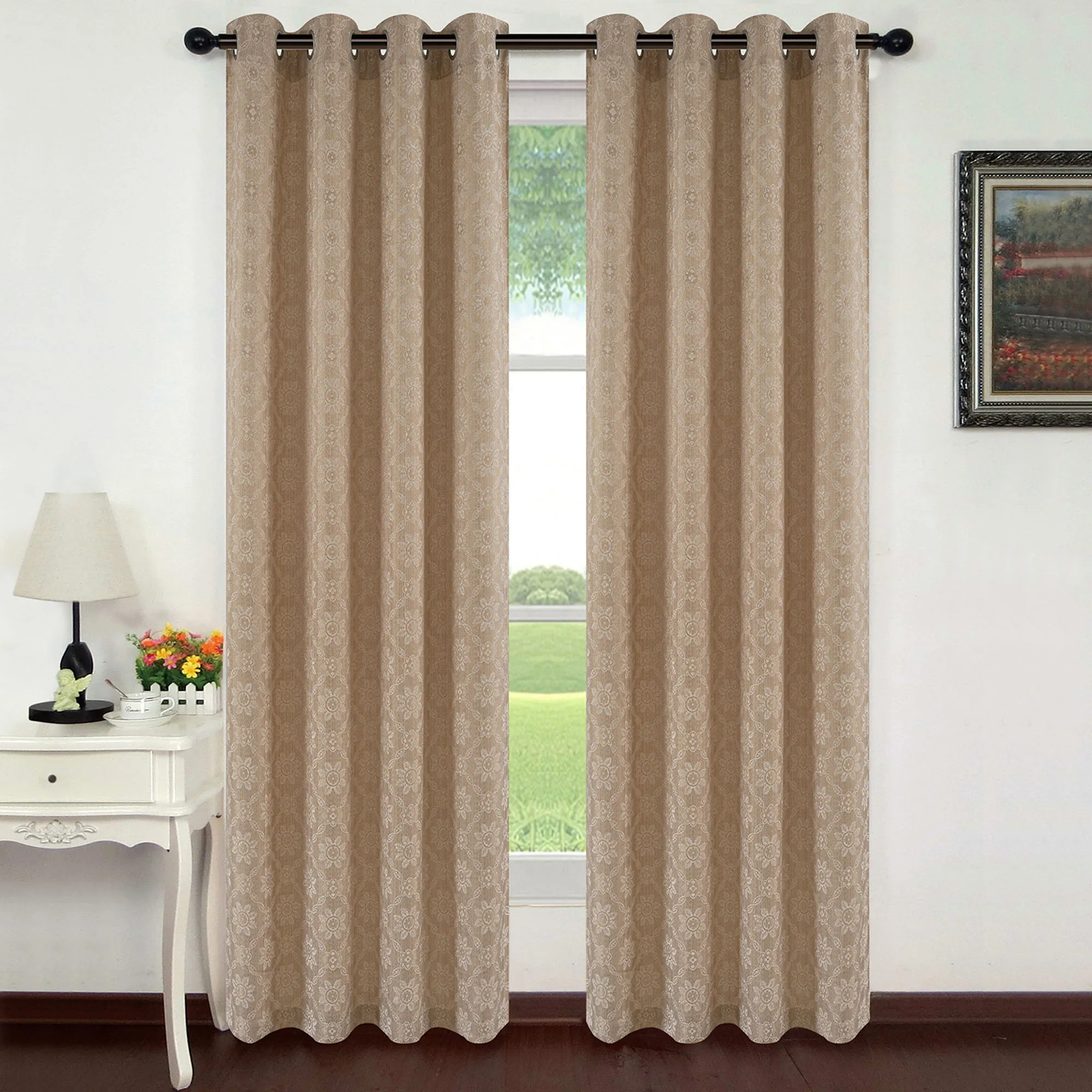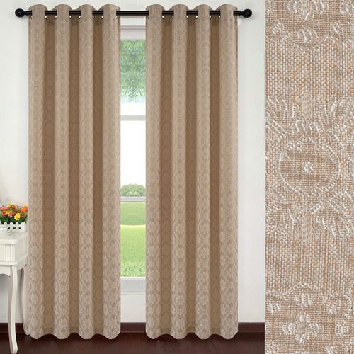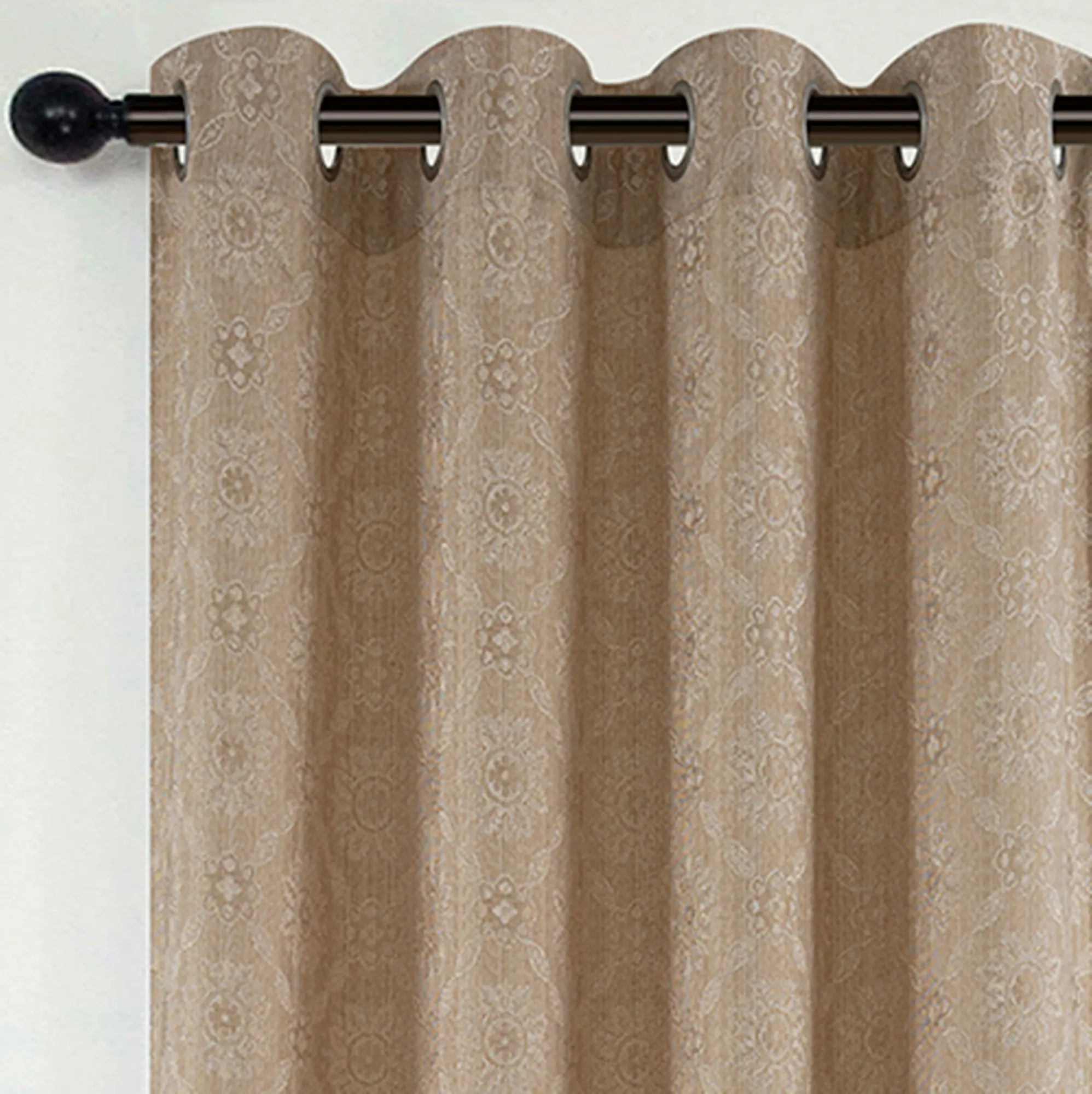 Classic medallions pattern the Chambley Wide Curtain Pair with a graceful allure. Detailed with a leafy latticework design, the woven polyester curtain panels feature floral-detailed medallions in a neutral hue on a solid ground. Perfect for use with your decorative curtain rod, each panel hangs via the 1.5" dia. matte silver metal grommets. Each panel is 52"Wx84"L. Overall, the wide curtain pair measures 104"Wx84"L. Machine washable. Imported. The curtain pair width is the total width of two panels together.